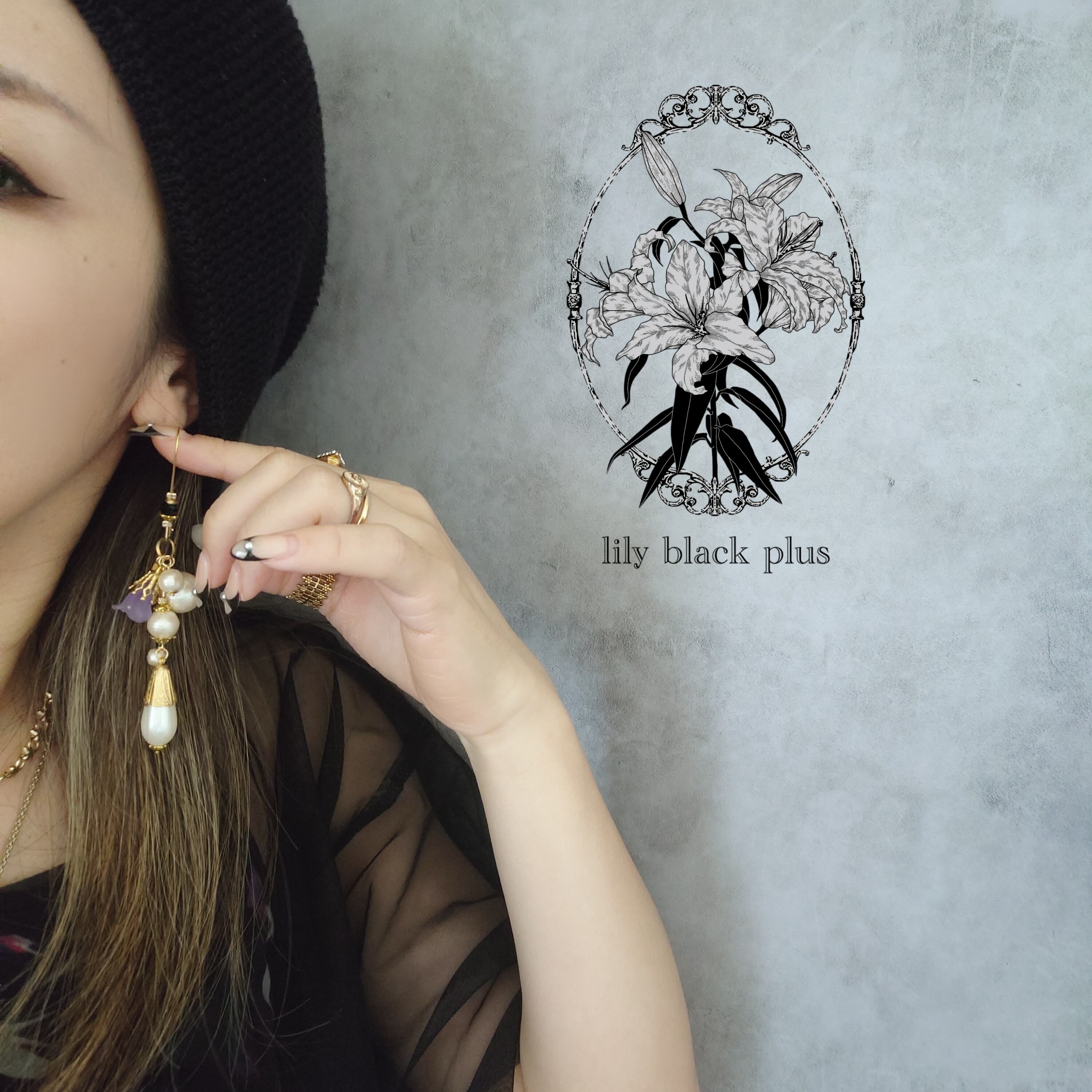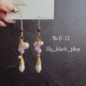 長めのフープのフックピアスにブラックビーズを組み合わせ、コットンパールやヴィンテージのチューリップビーズ、真鍮キャップとしずくパールビーズを合わせたシンプルな組み合わせながら存在感のあるアクセサリーです。