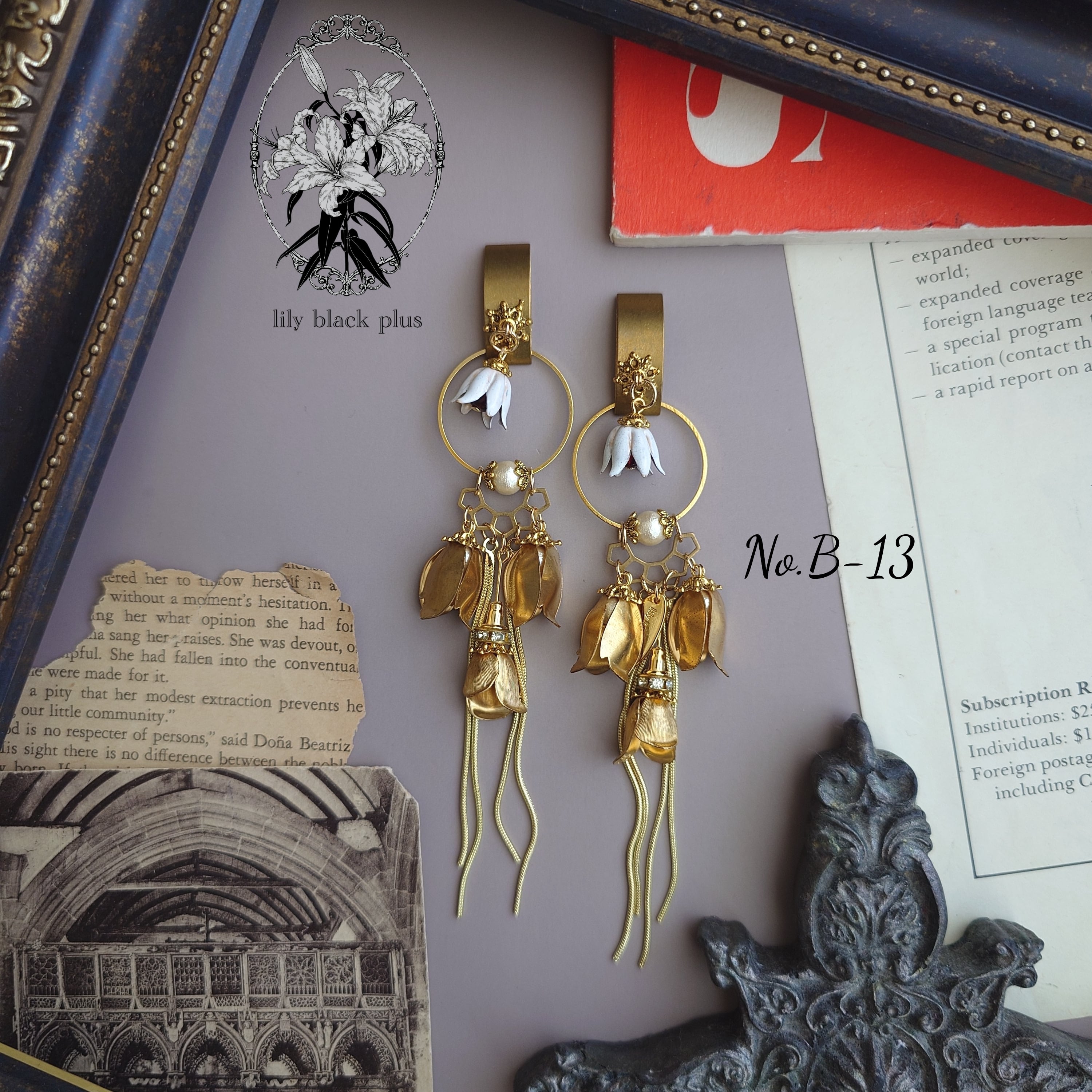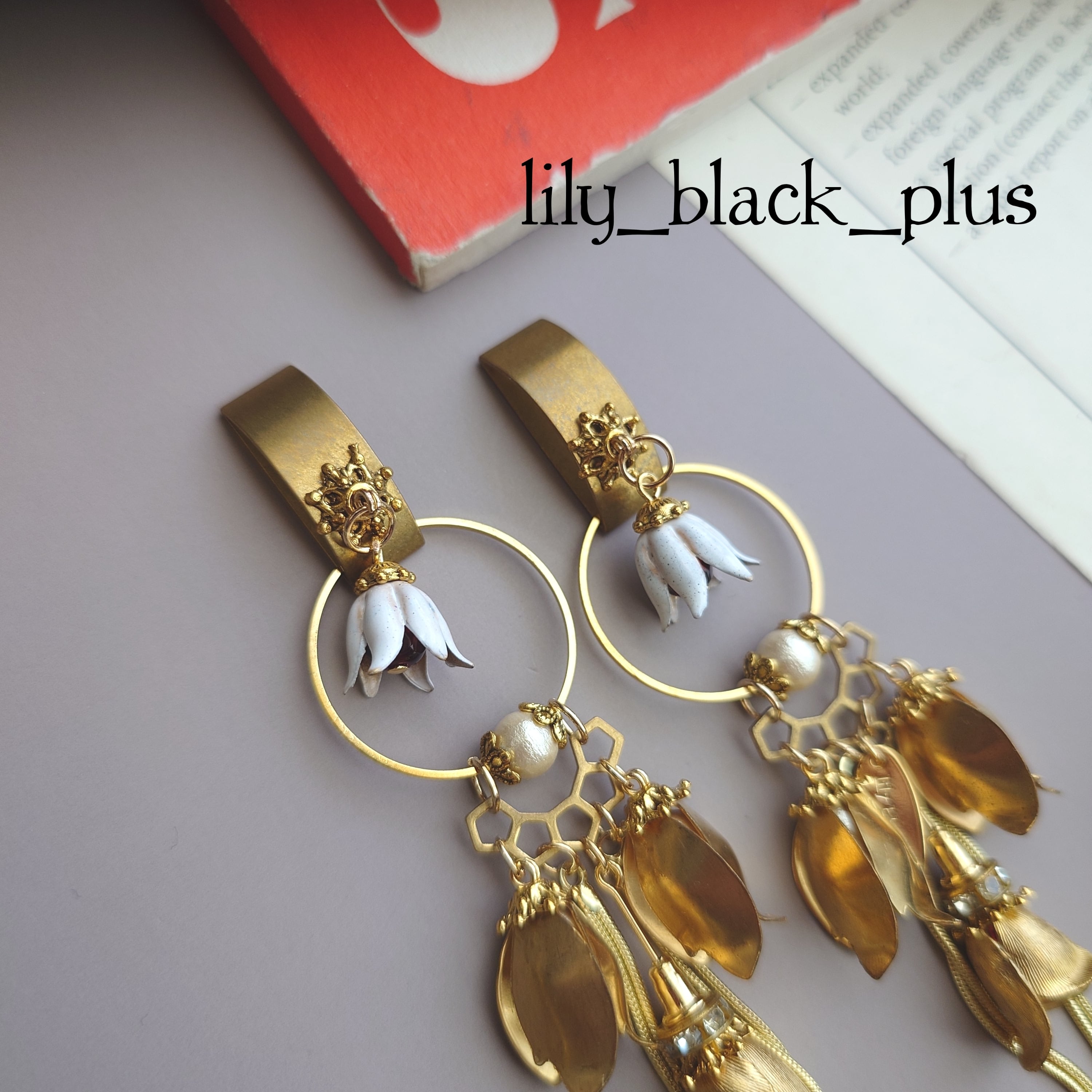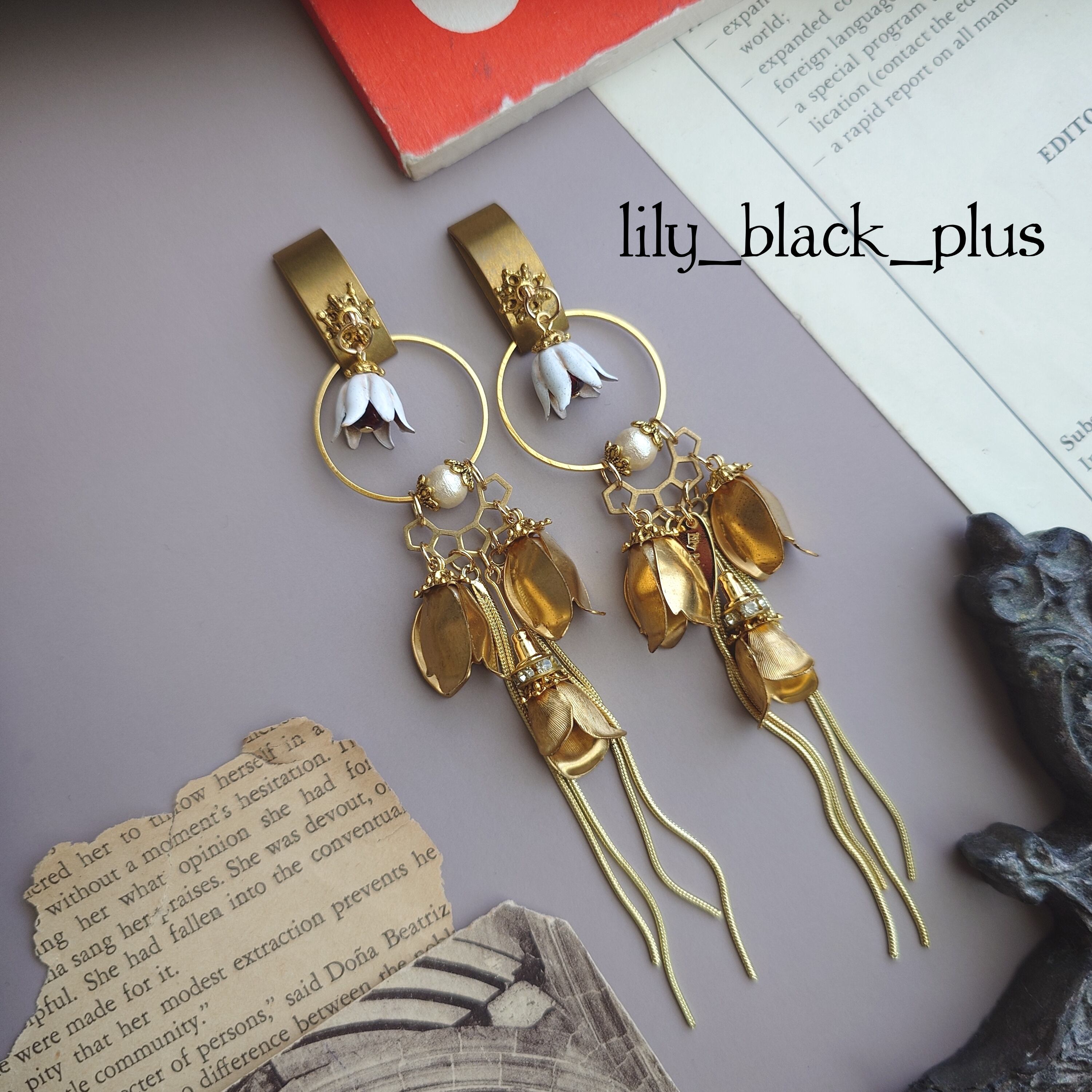 カーブの立体的な真鍮をトップにフープを通してホワイトにペイントした真鍮フラワーにチューリップのような真鍮にしずく真鍮を合わせ、チェーンタッセルを合わせたアクセサリーです。