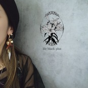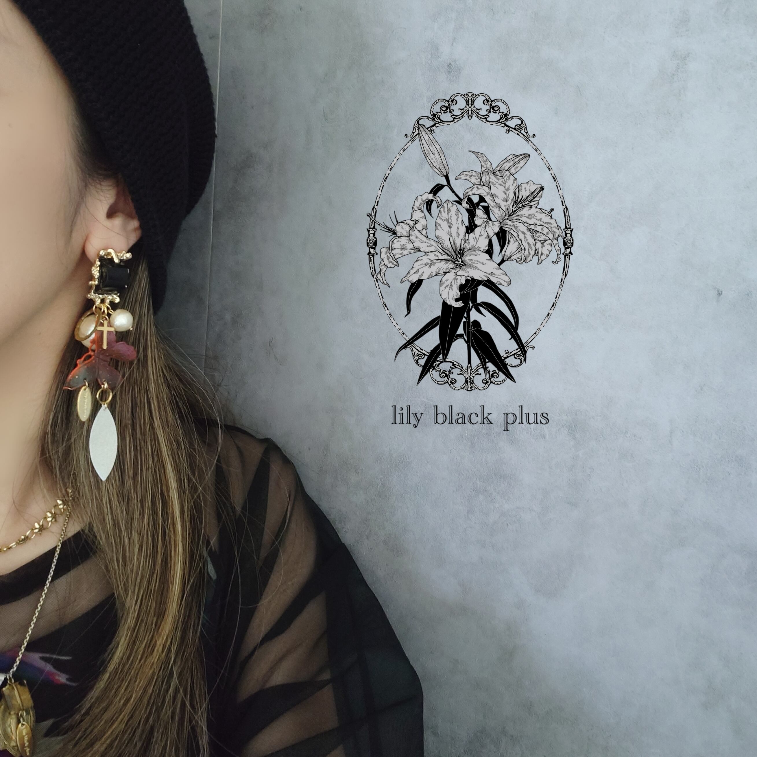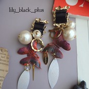 ブラックのメタルカボションをトップにコットンパールと十字架の真鍮チャーム、オレンジやパープル、グリーンにペイントした蝶々の真鍮を組み合わせ、ホワイトにペイントした真鍮チャームを合わせたアクセサリーです。