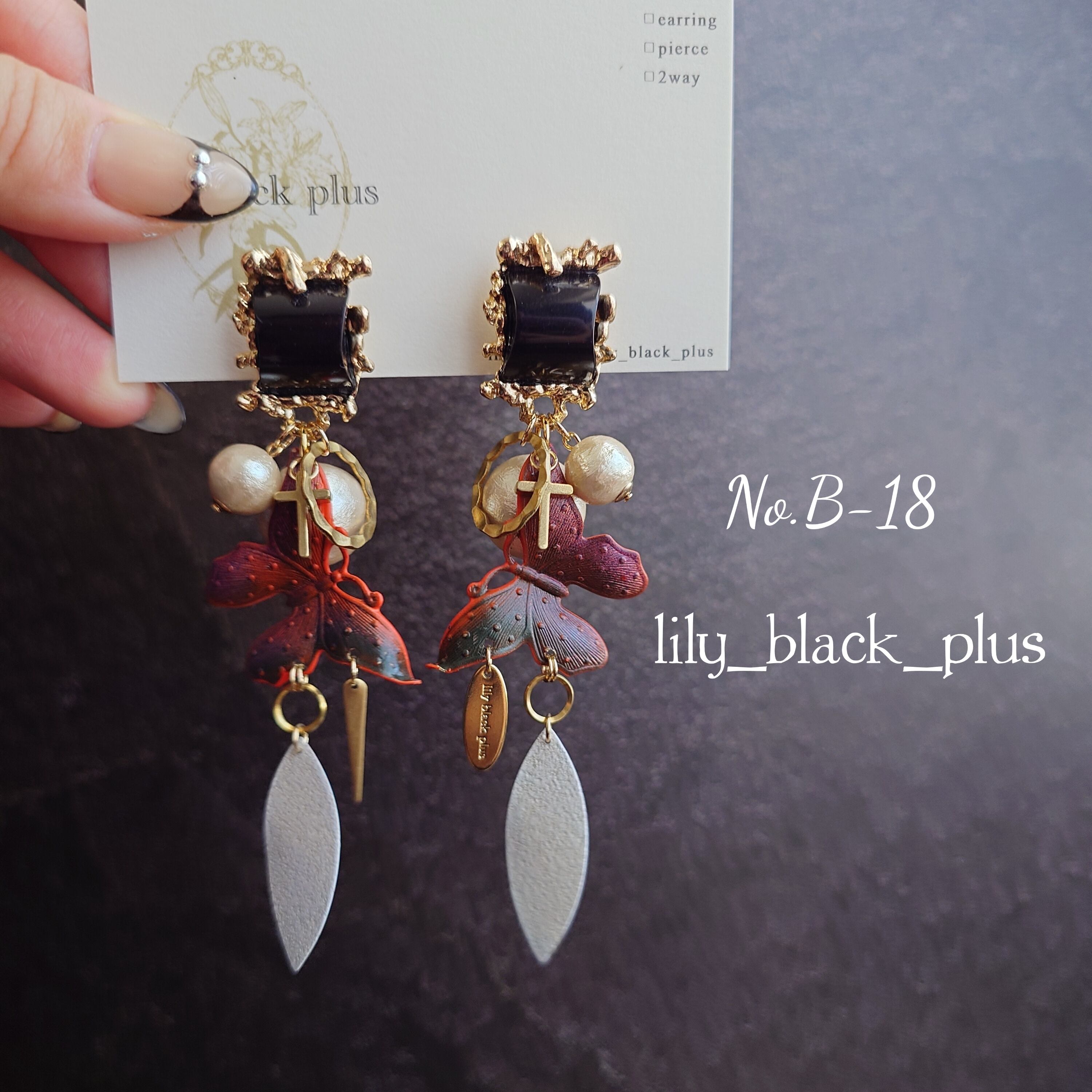 No.B-18 ブラックメタルとoriginal paintバタフライ真鍮のコットンパールピアス/イヤリング
