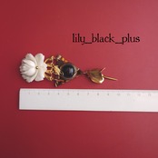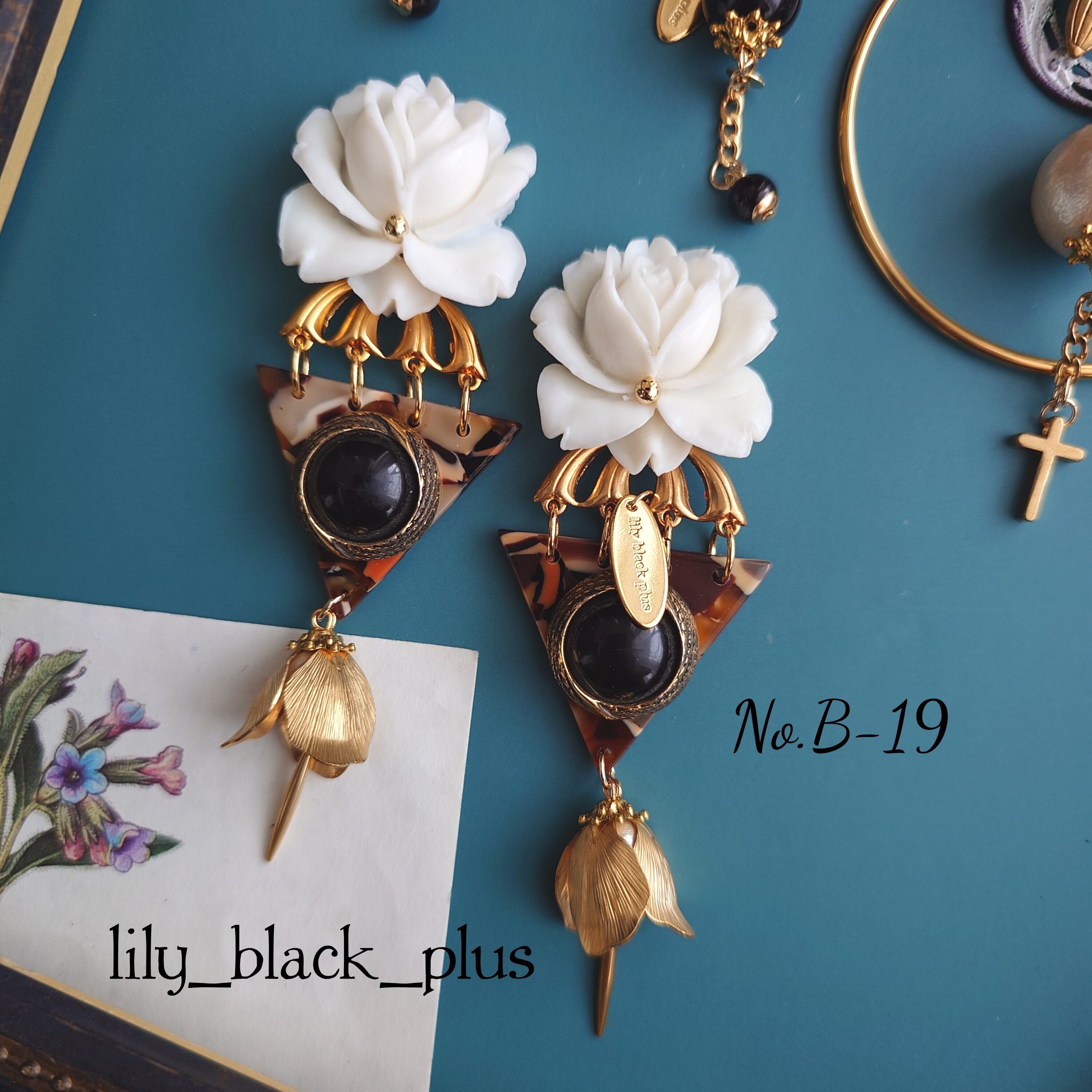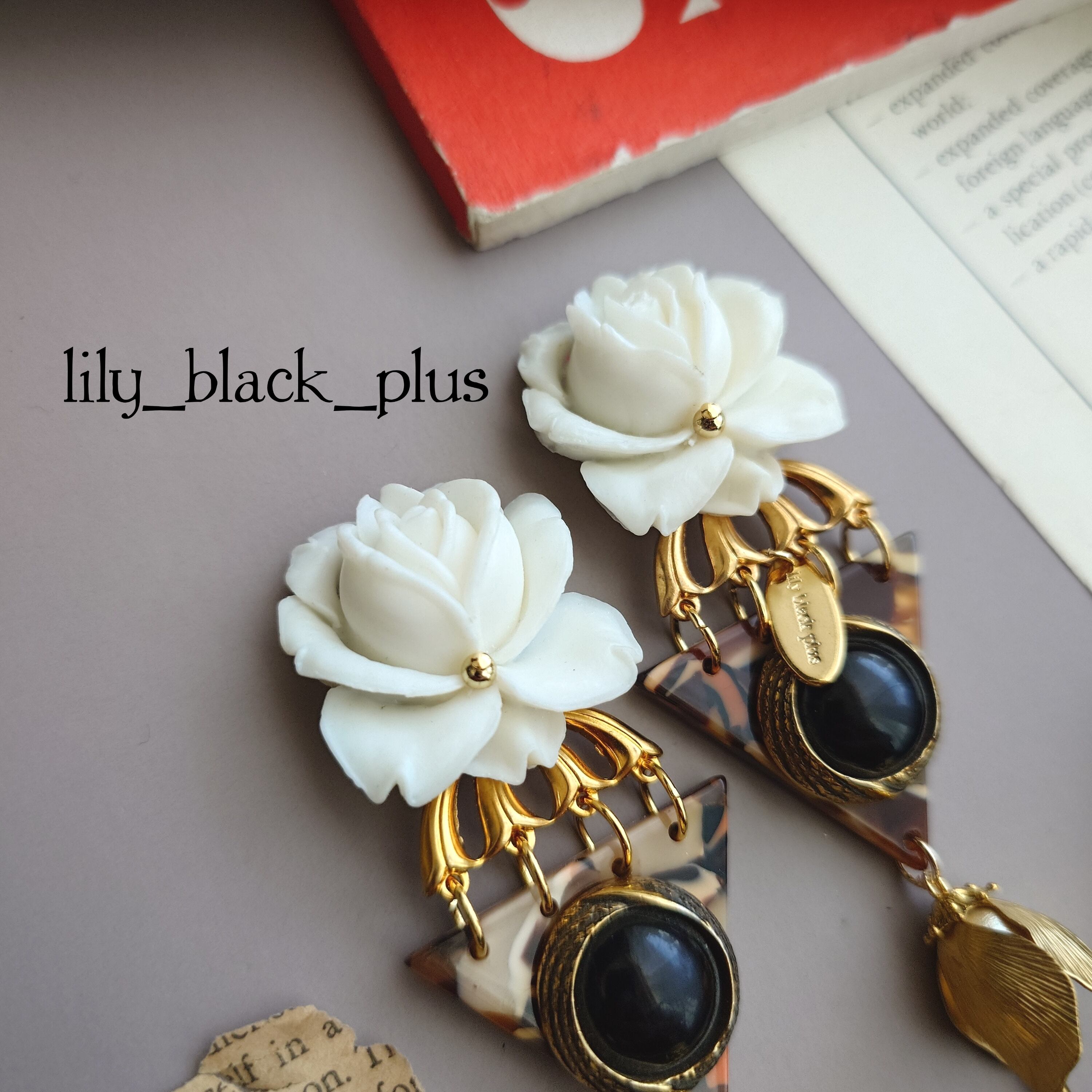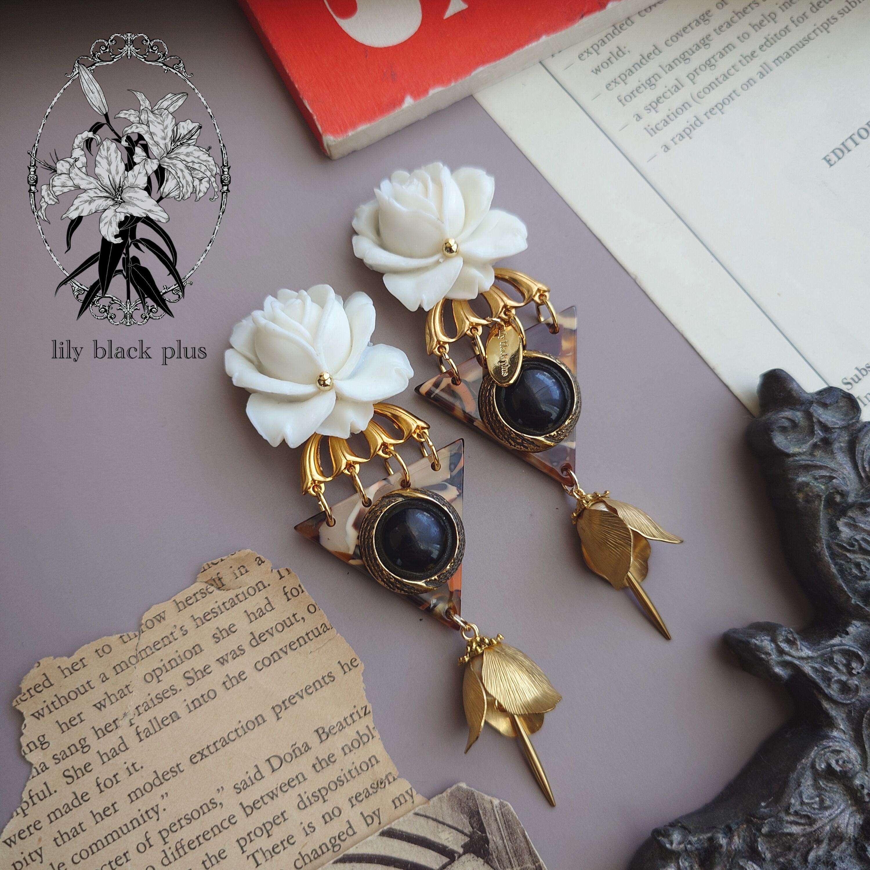 ヴィンテージの白色の大きな薔薇をトップに真鍮チャームと三角のプレートをリングで繋ぎ、プレートにはボタンを貼り付けてつぼみ真鍮を合わせたアクセサリーです。