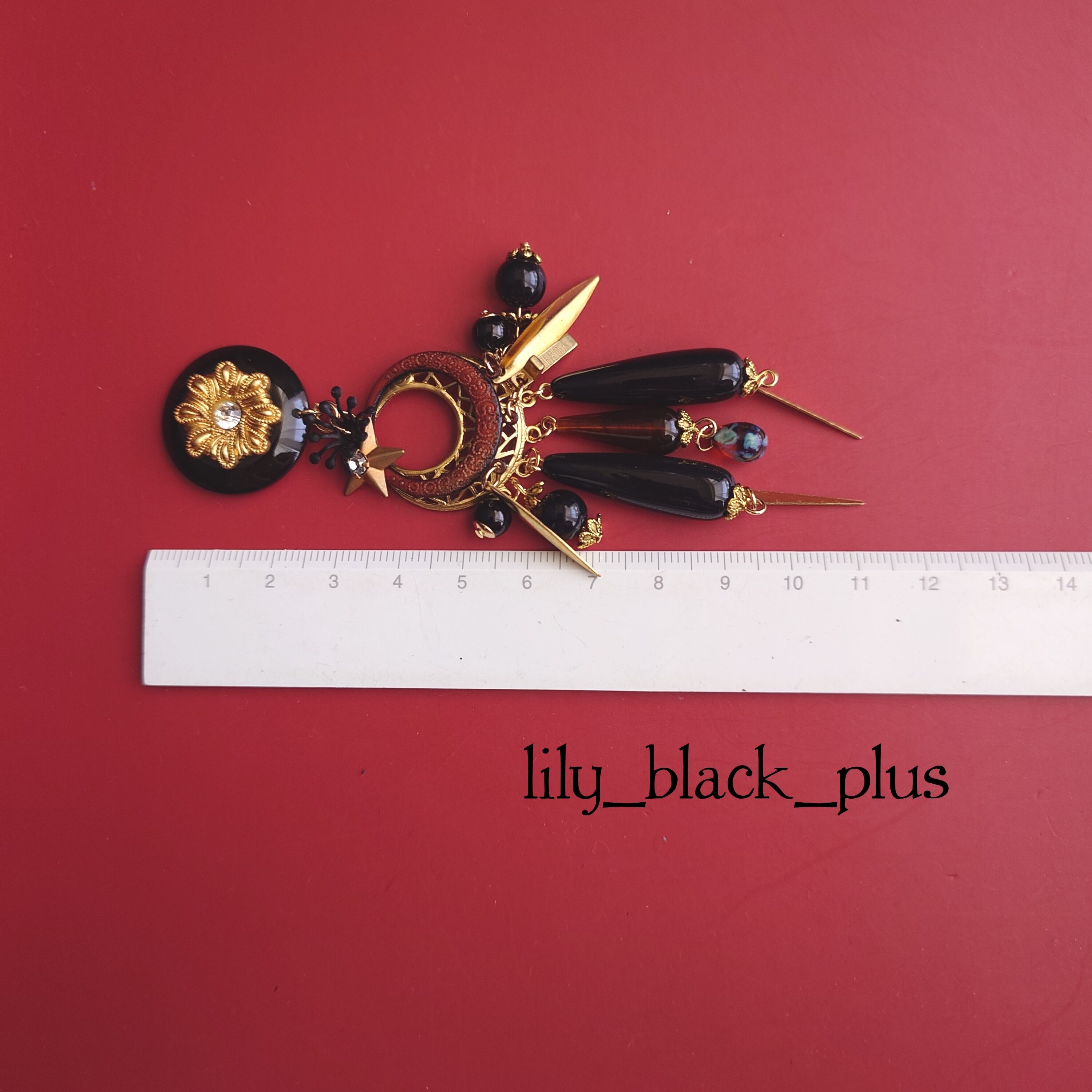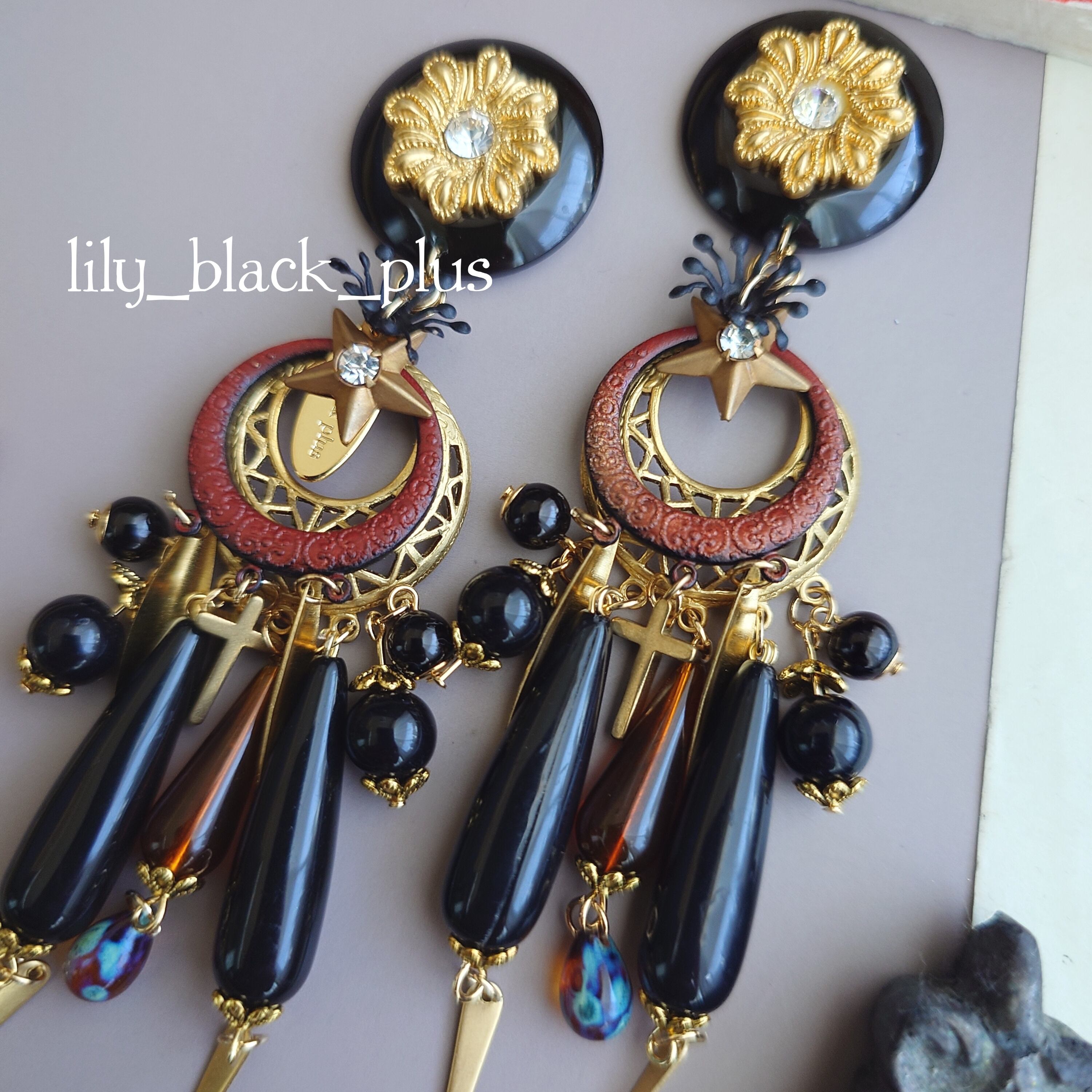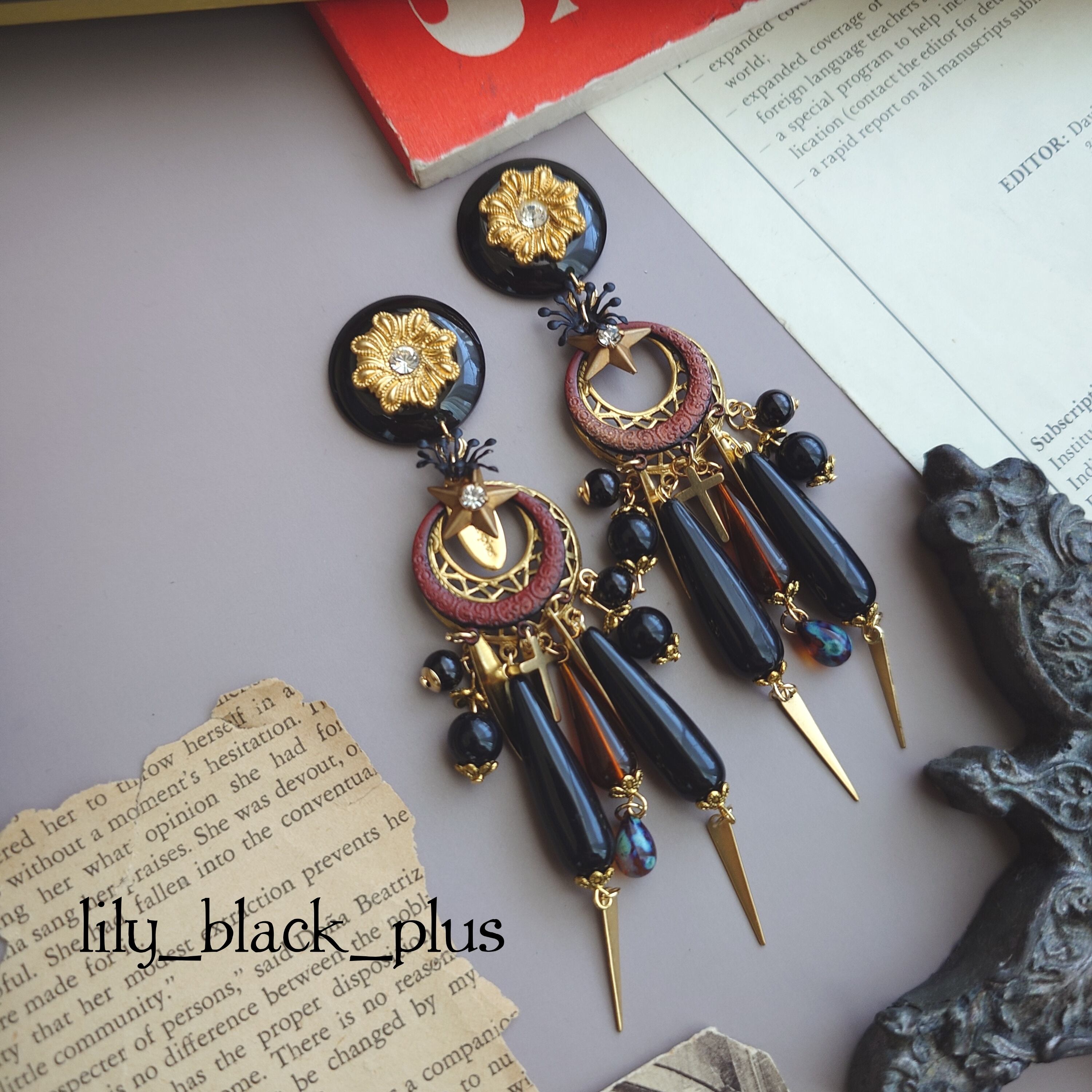 ボタンをトップに真鍮チャームと赤にペイントしたヴィンテージの真鍮チャームを重ね、ブラックビーズに中央にはブラウンのヴィンテージビーズ、表にはブラックビーズに重なるよう真鍮プレートチャームが重なるよう合わせたアクセサリーです。