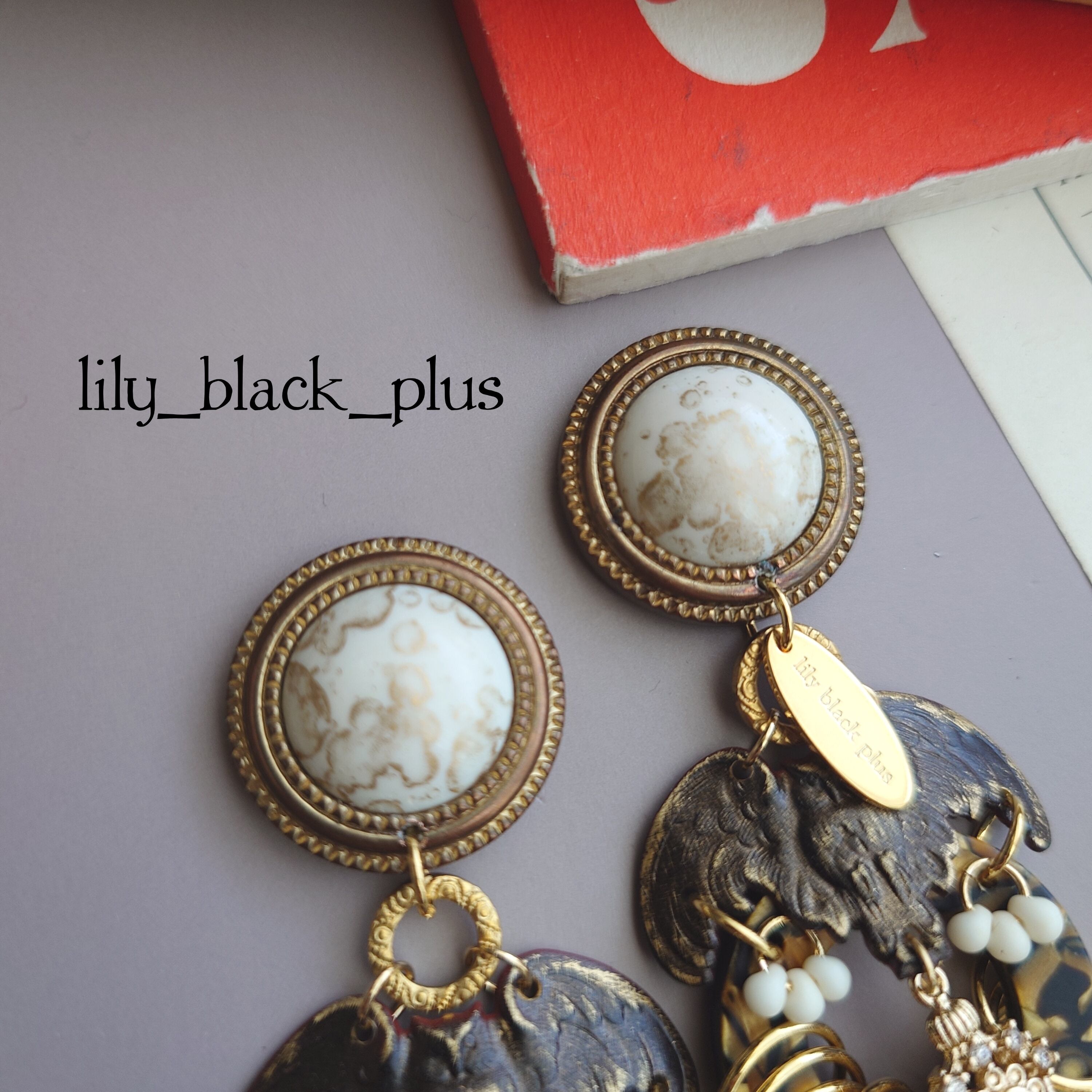 模様の入ったボタンをトップにブラックにペイントした真鍮フクロウとブラウンのヴィンテージプレートリングを組み合わせ、ヴィンテージの小さなコネクターと真鍮チャームを合わせたアクセサリーです。
