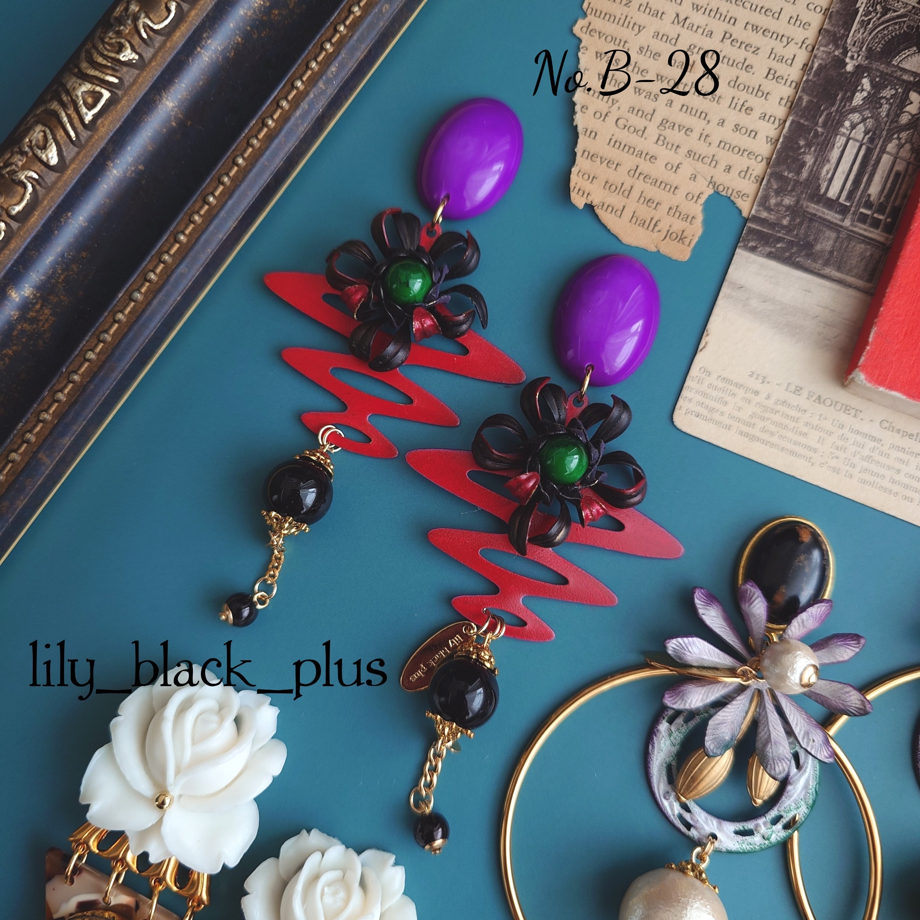 パープルのヴィンテージカボションをトップに、赤にペイントした大きなヴィンテージ真鍮プレートと大きな真鍮フラワーを立体的に曲げて組み合わせ、ブラックビーズを合わせたアクセサリーです。