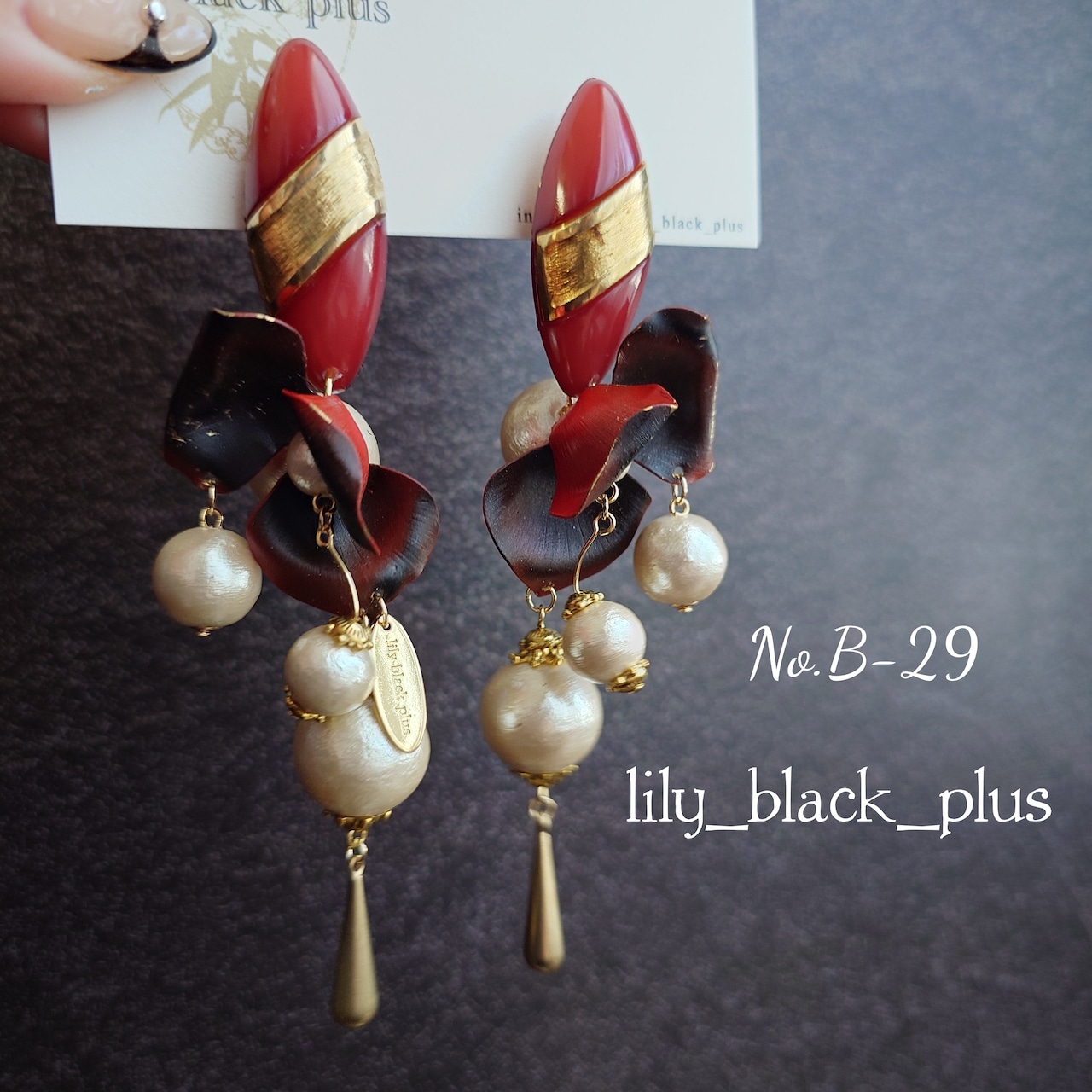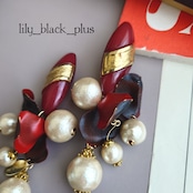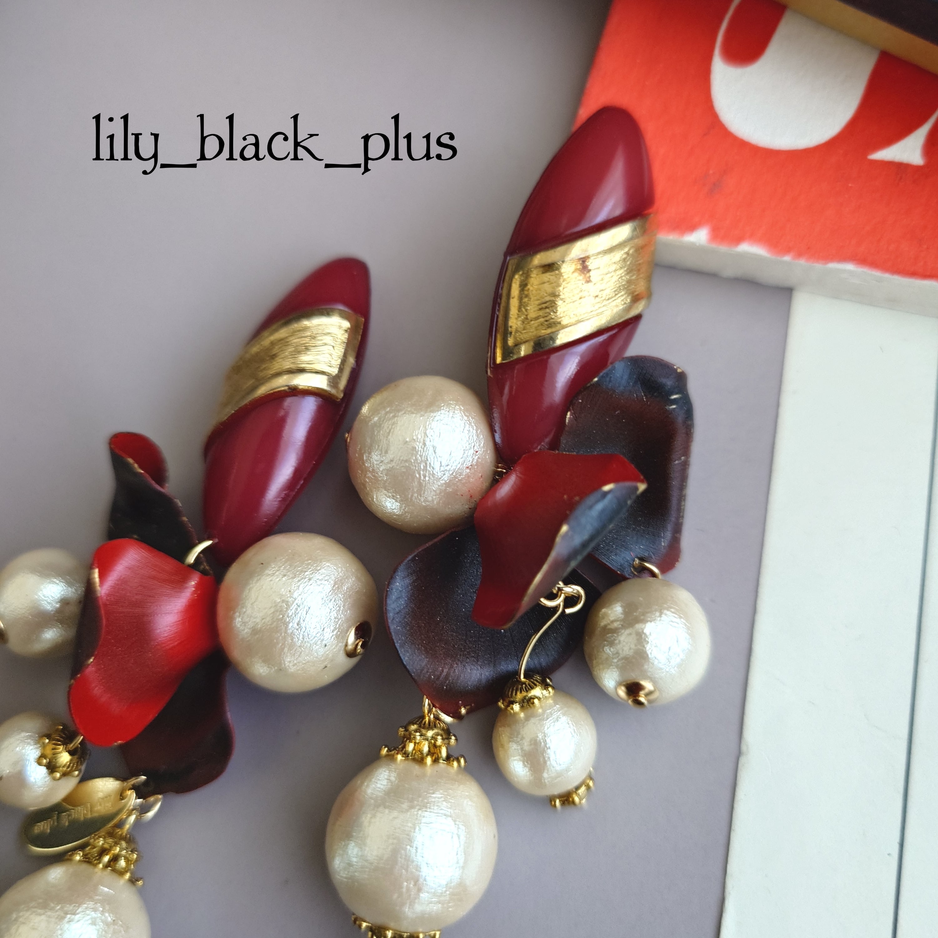 細長い赤のボタンをトップに、裏表とカラーを変えてペイントした大きな真鍮フラワーと大きなコットンパールを合わせたアクセサリーです。バランスなどにこだわりながら配置したコットンパールが揺れると可愛らしいデザインです。