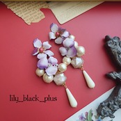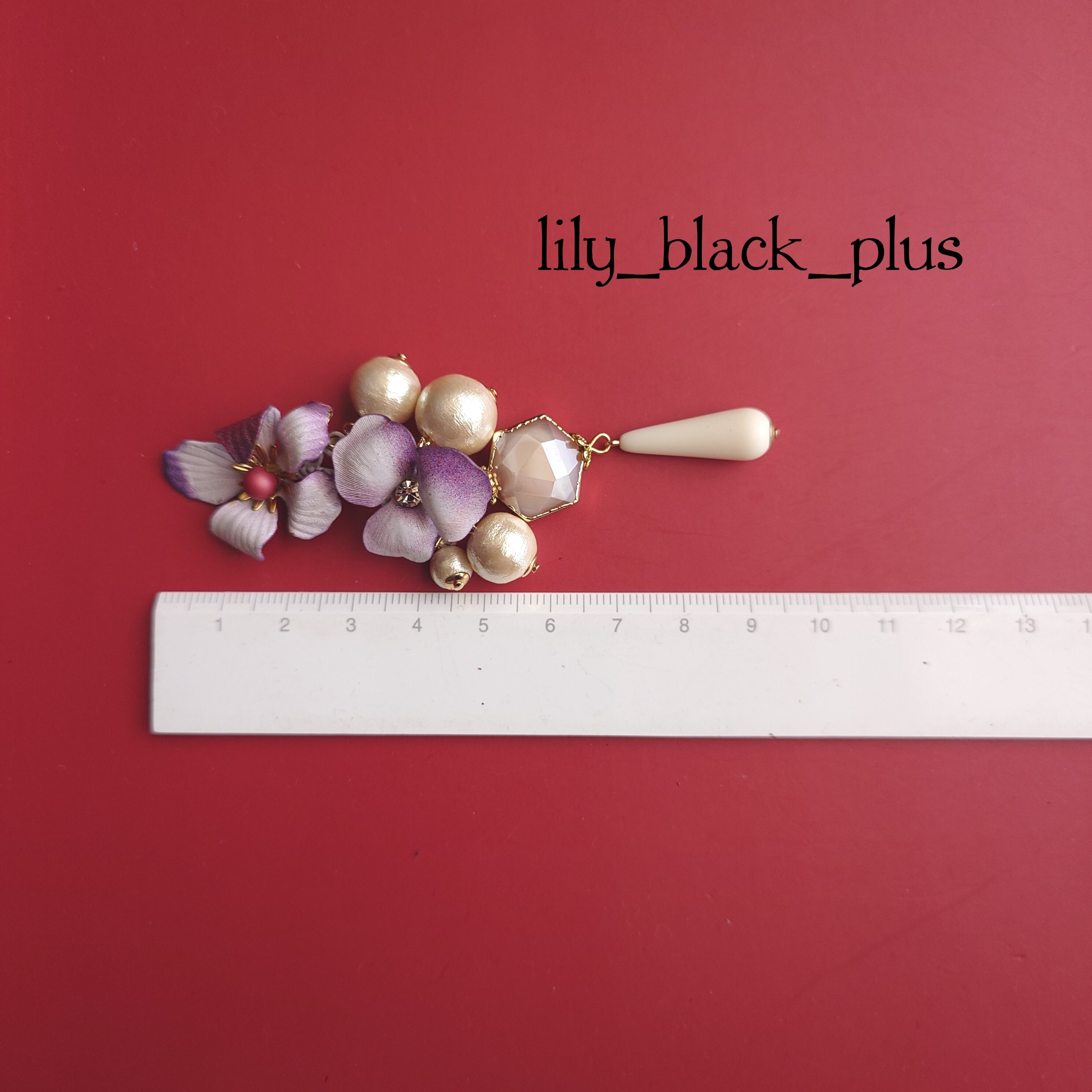 ホワイトパープルにペイントした真鍮フラワーと真鍮チャーム、フラワーを組み合わせ、コットンパールとピンクのガラスビーズ、ヴィンテージのホワイトビーズを合わせたアクセサリーです。