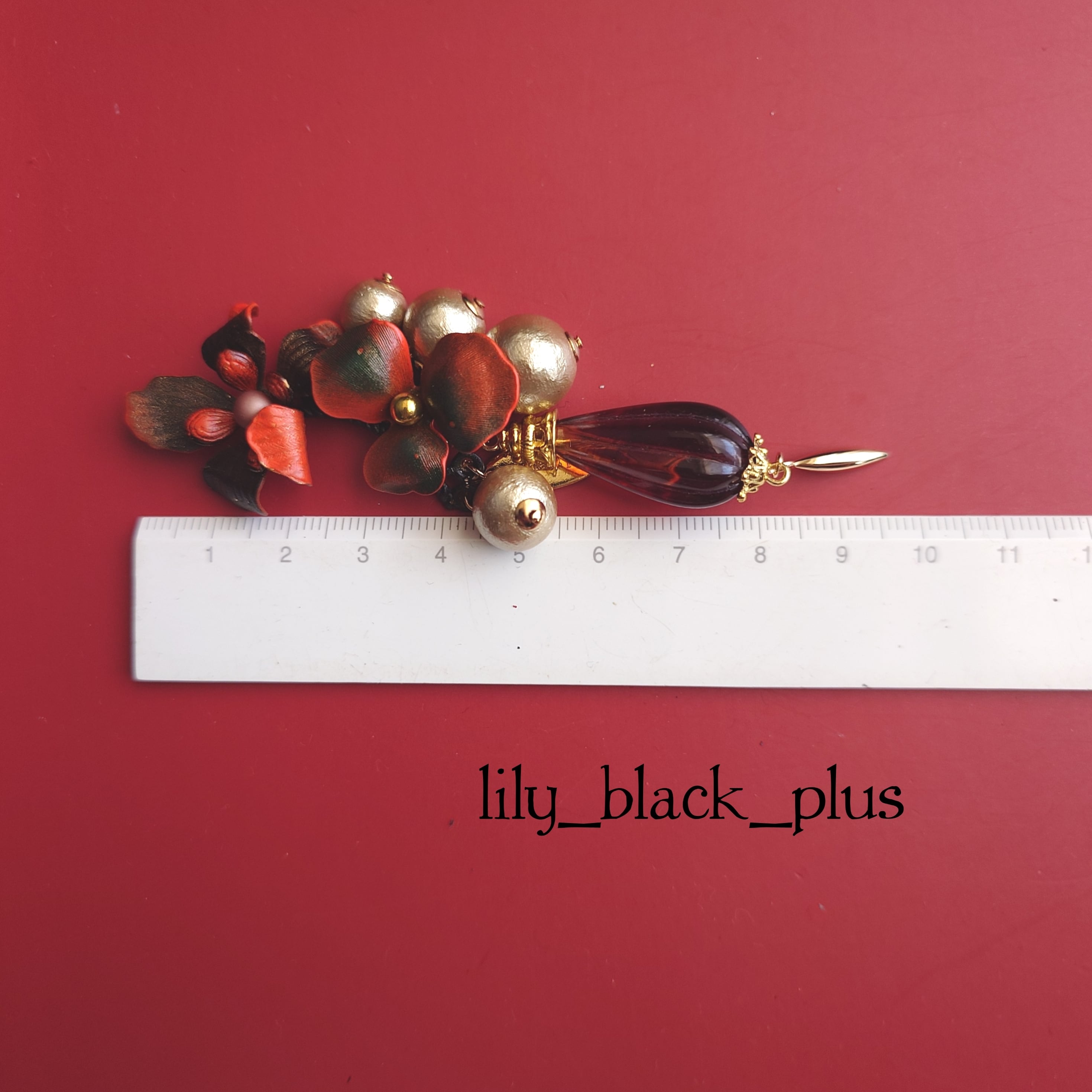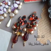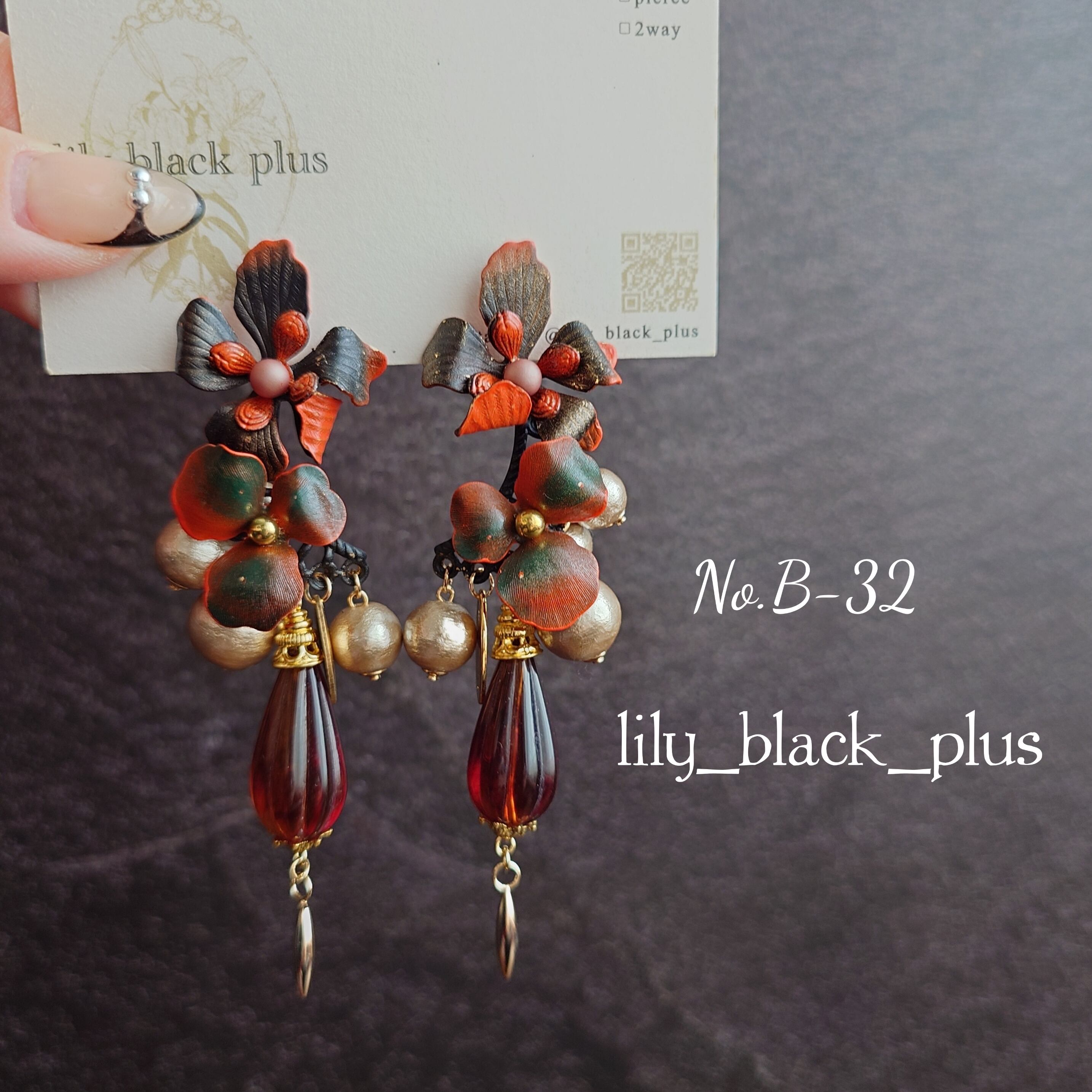 ブラックとオレンジにペイントした真鍮フラワーと真鍮チャーム、真鍮フラワーを組み合わせ、ゴールドのコットンパールとブラウンのクリアビーズを合わせたアクセサリーです。