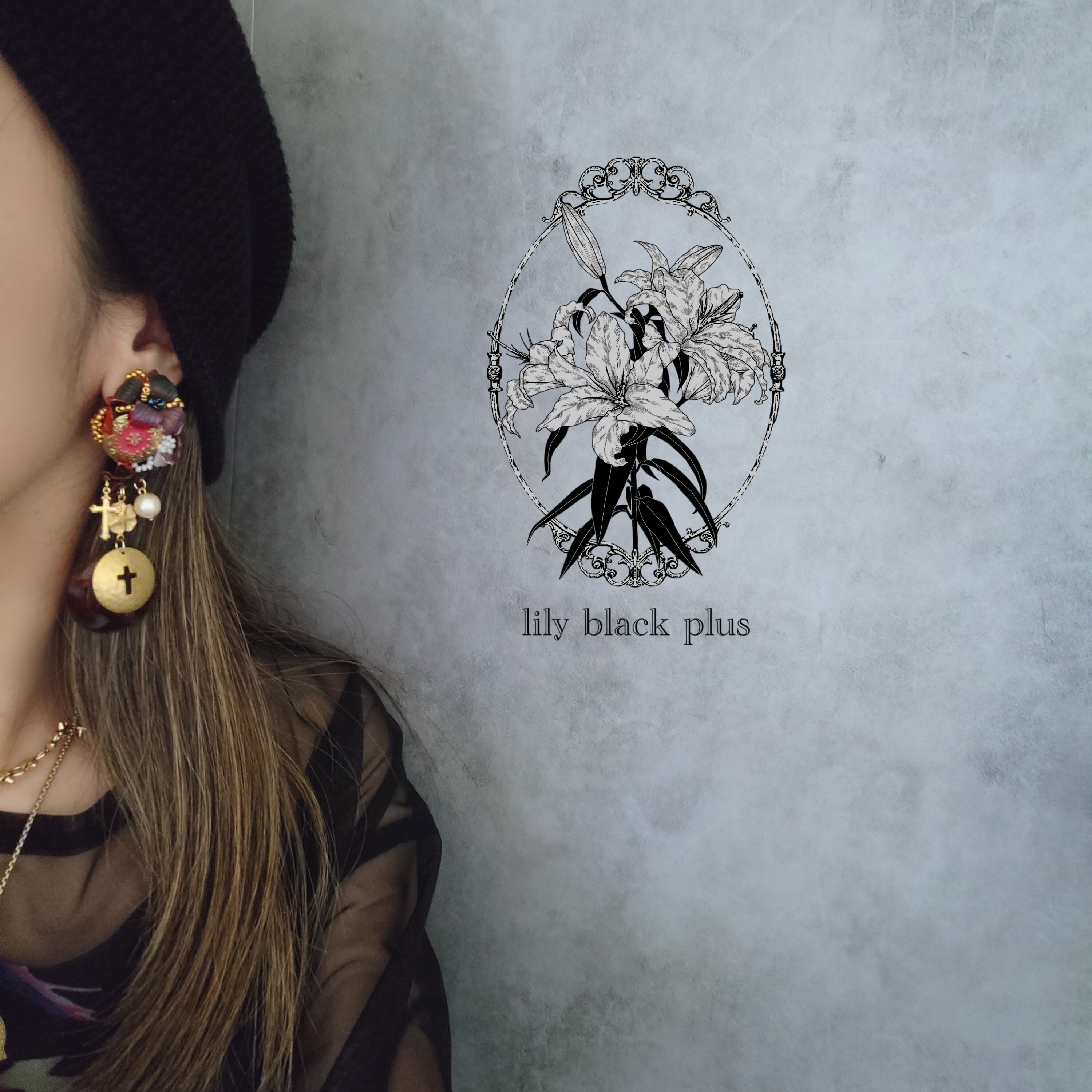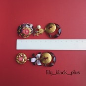 反対側にはピンクのメタルボタンをトップにブラックにペイントした真鍮プレートにホワイトの真鍮フラワーを重ね、真鍮プレートとリングを合わせたアクセサリーです。