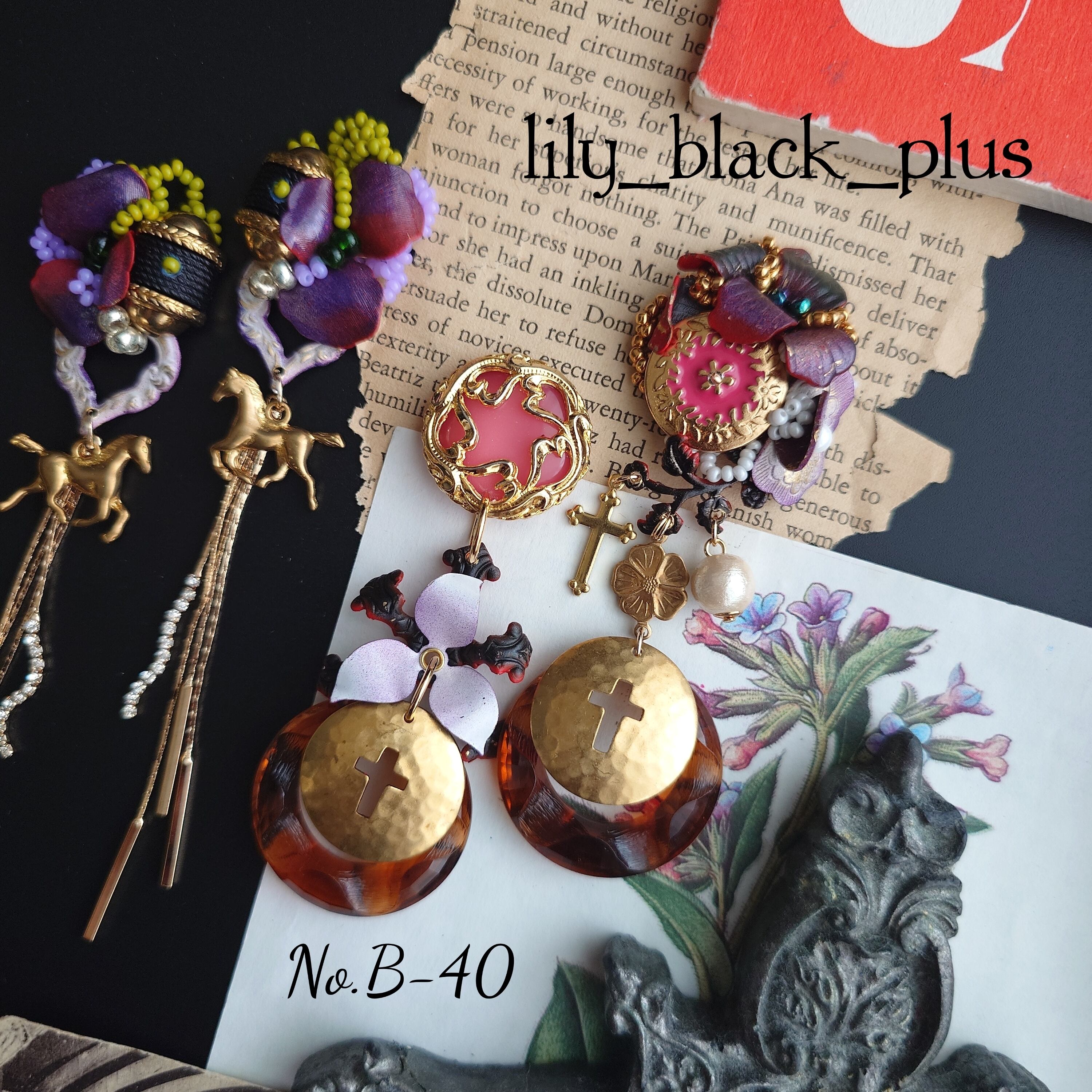 右側はピンクのボタンとペイントした真鍮フラワーを組み合わせ、十字架の真鍮チャームと十字架にくり抜かれたプレートチャーム、ヴィンテージのブラウンリングを、