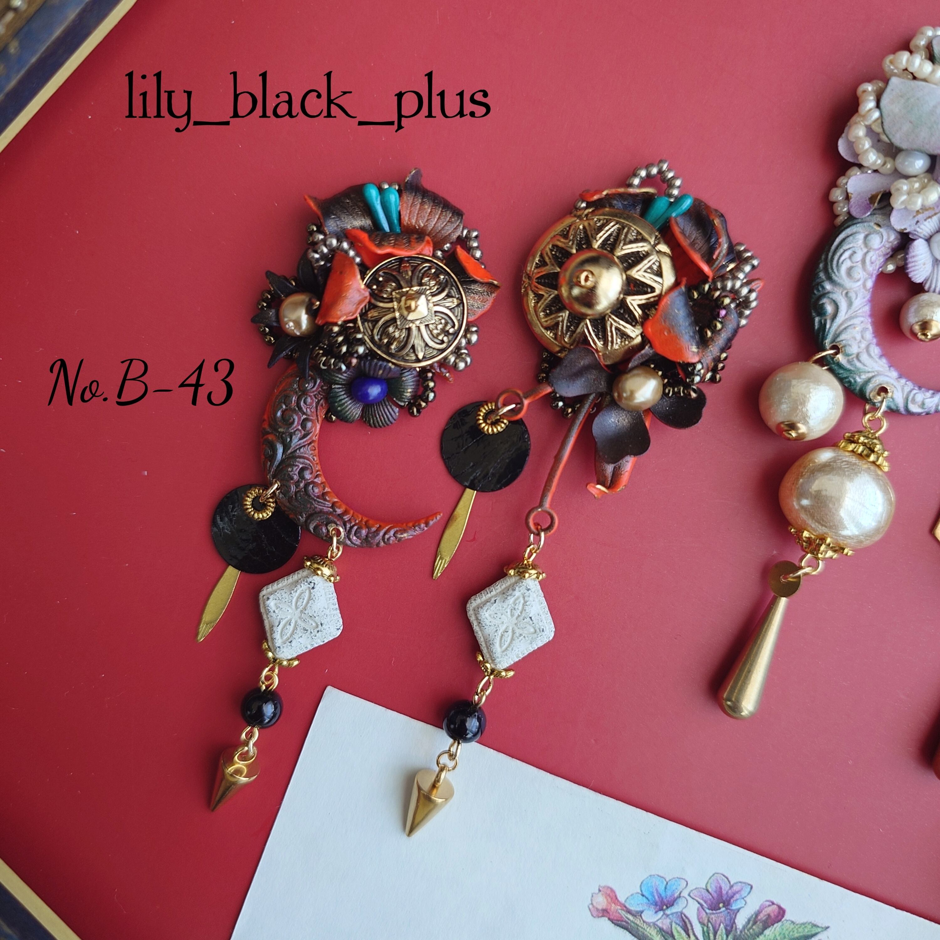 ボタンにペイントした真鍮、ビーズを編み込んだトップにブラックのシェルチャーム、ヴィンテージビーズを合わせたアクセサリーです。