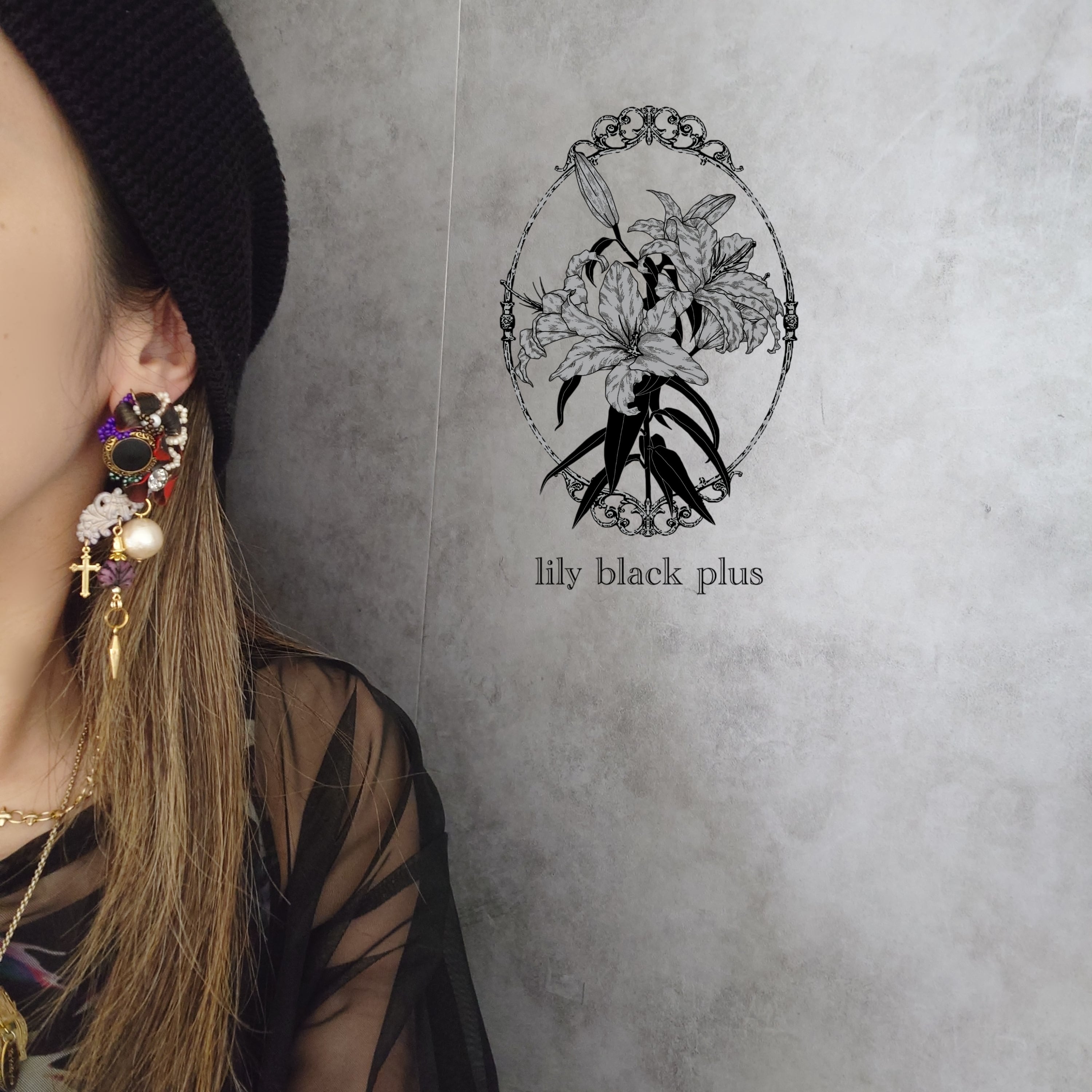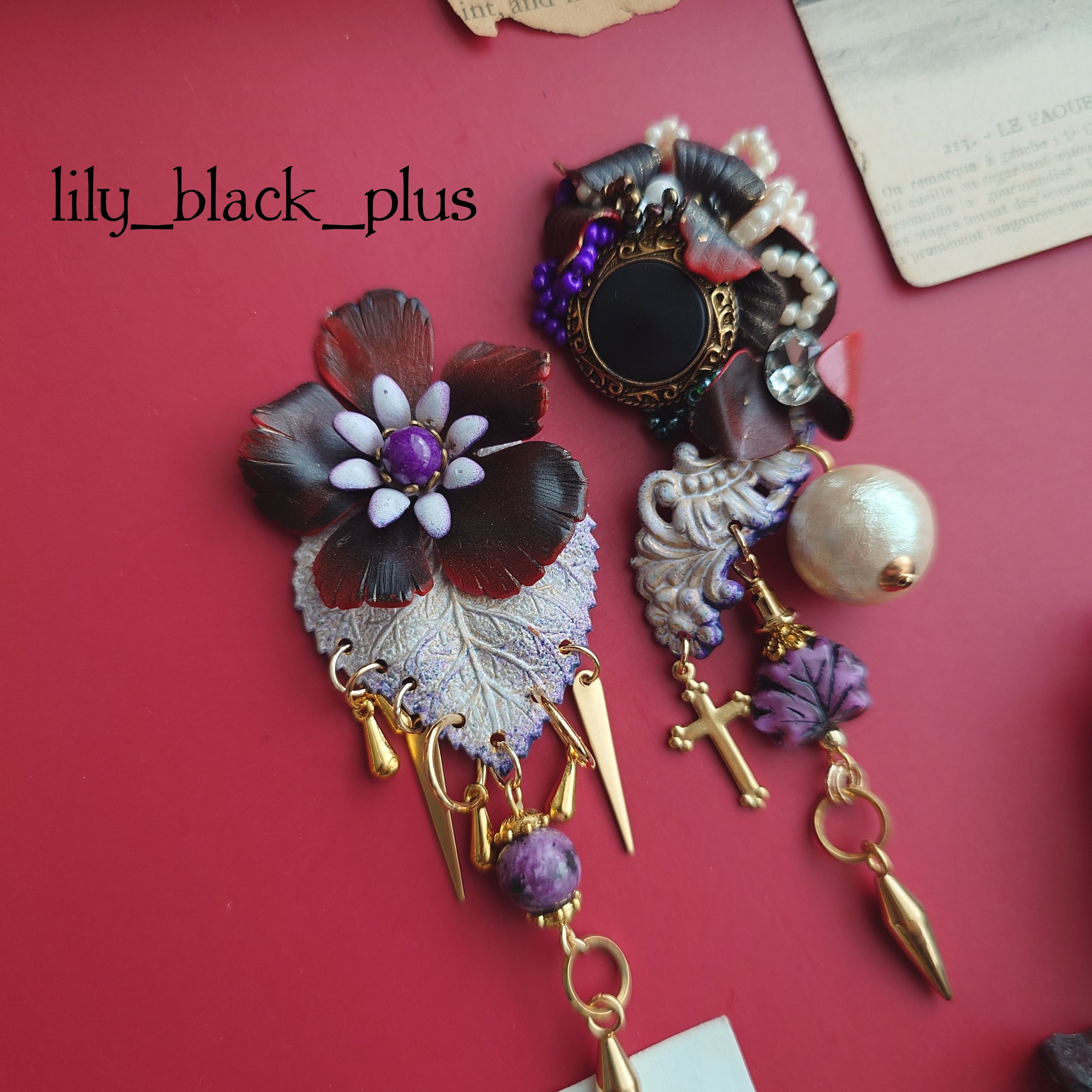 反対側にはペイントした大きな真鍮フラワーとリーフを組み合わせ真鍮チャームとパープルのビーズを合わせたアクセサリーです。