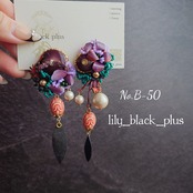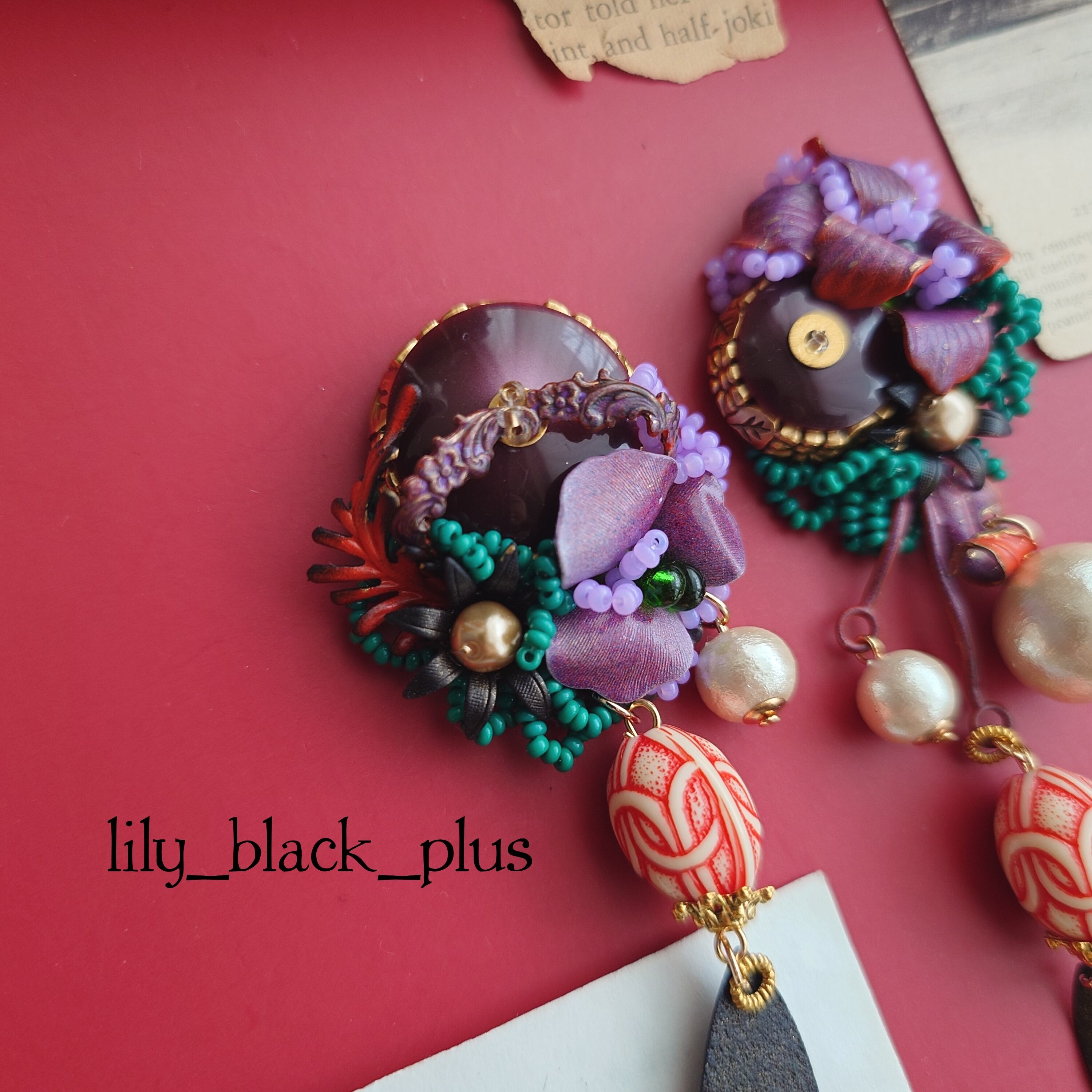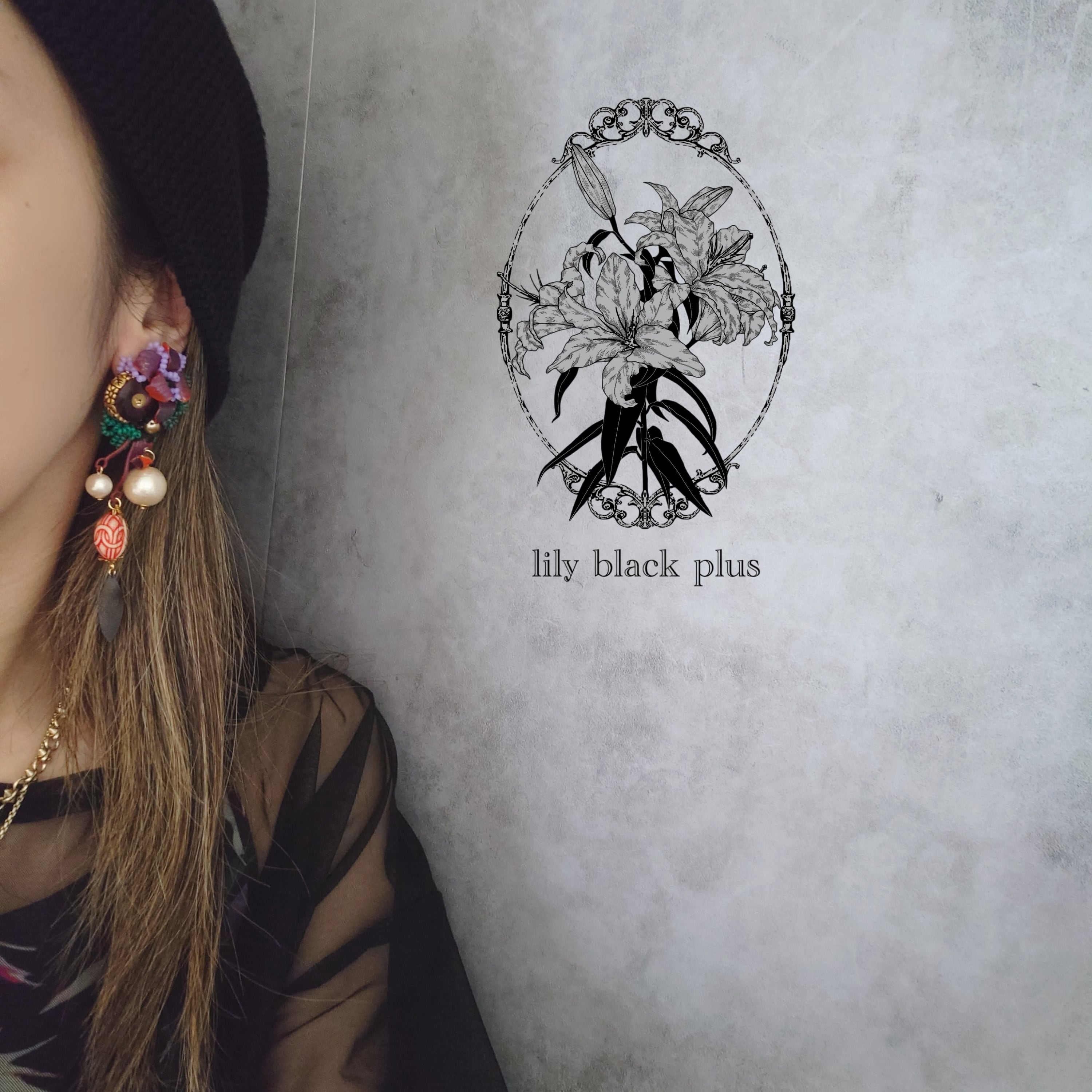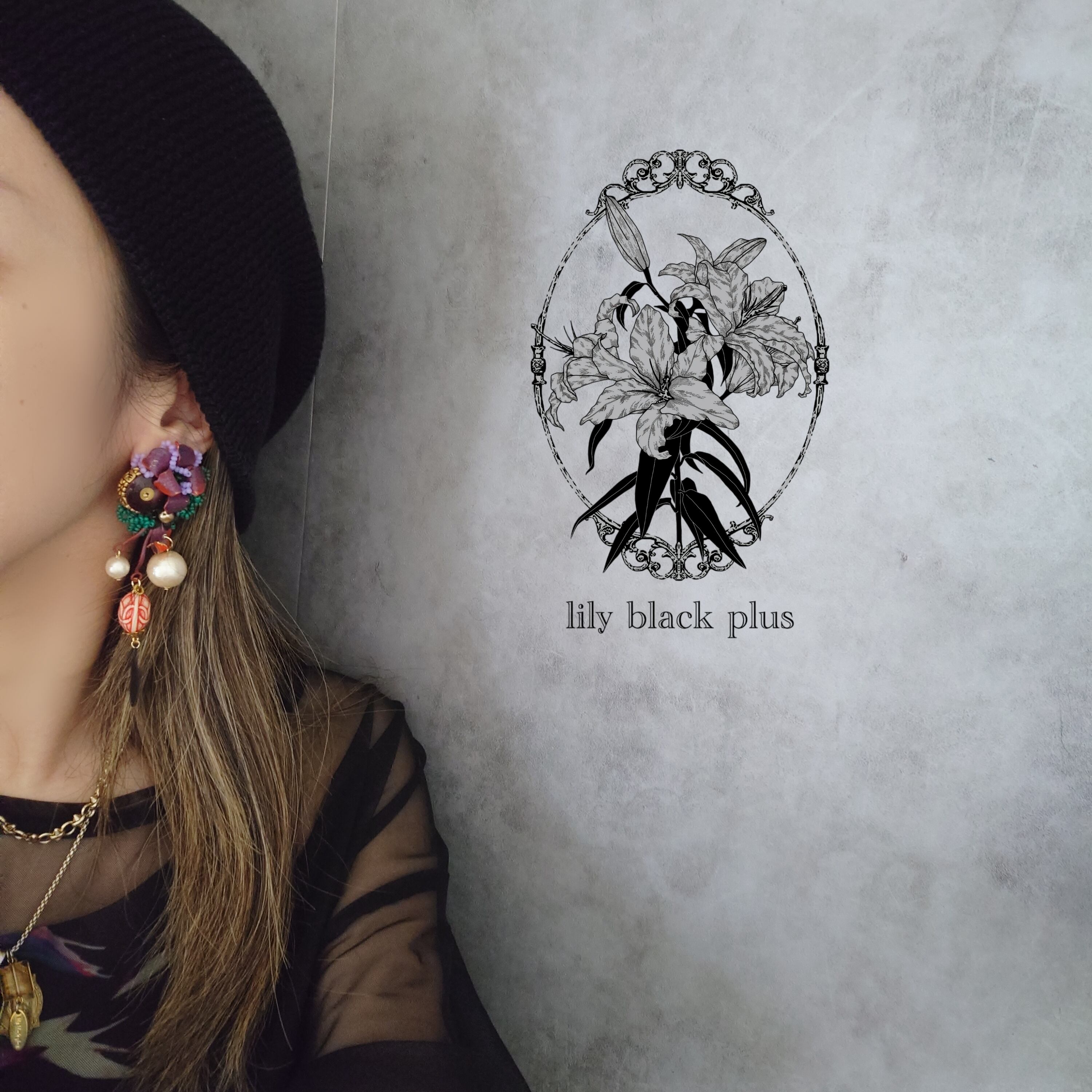 ボタンにペイントした真鍮、ビーズを編み込んだトップにコットンパールとヴィンテージビーズ、ブラックにペイントした真鍮チャームを合わせたアクセサリーです。