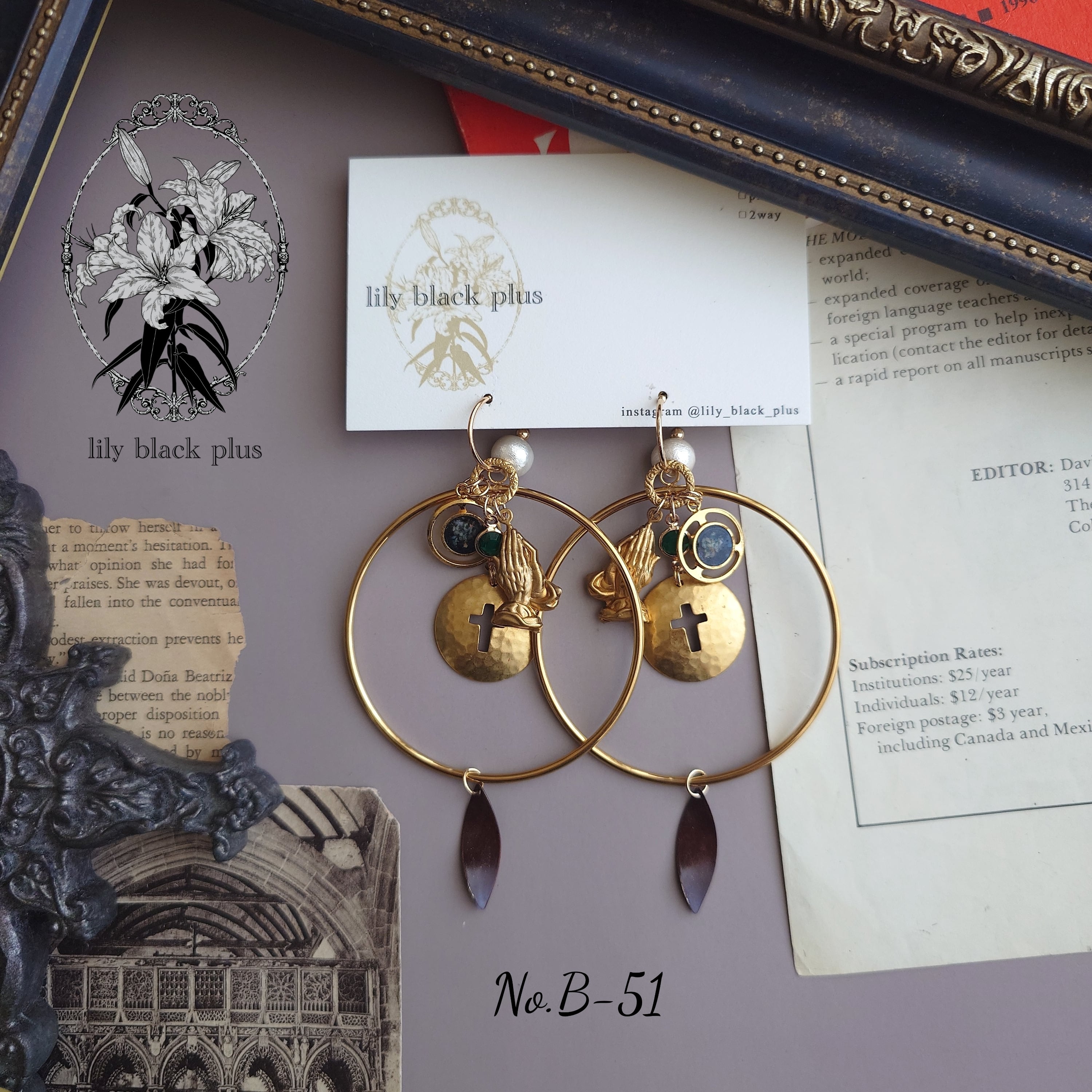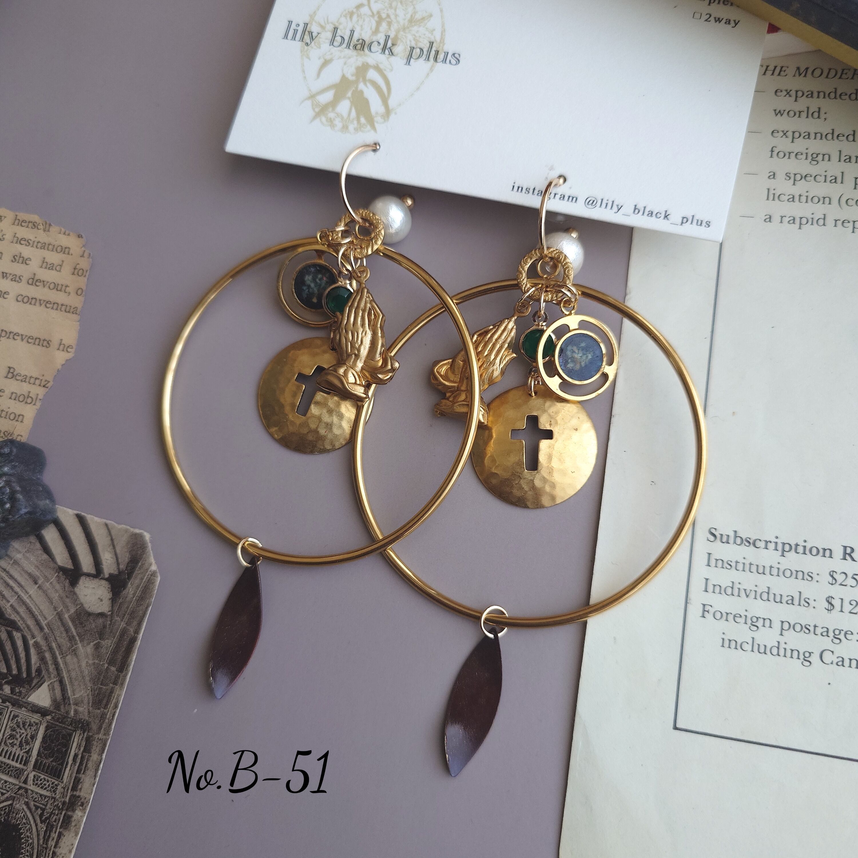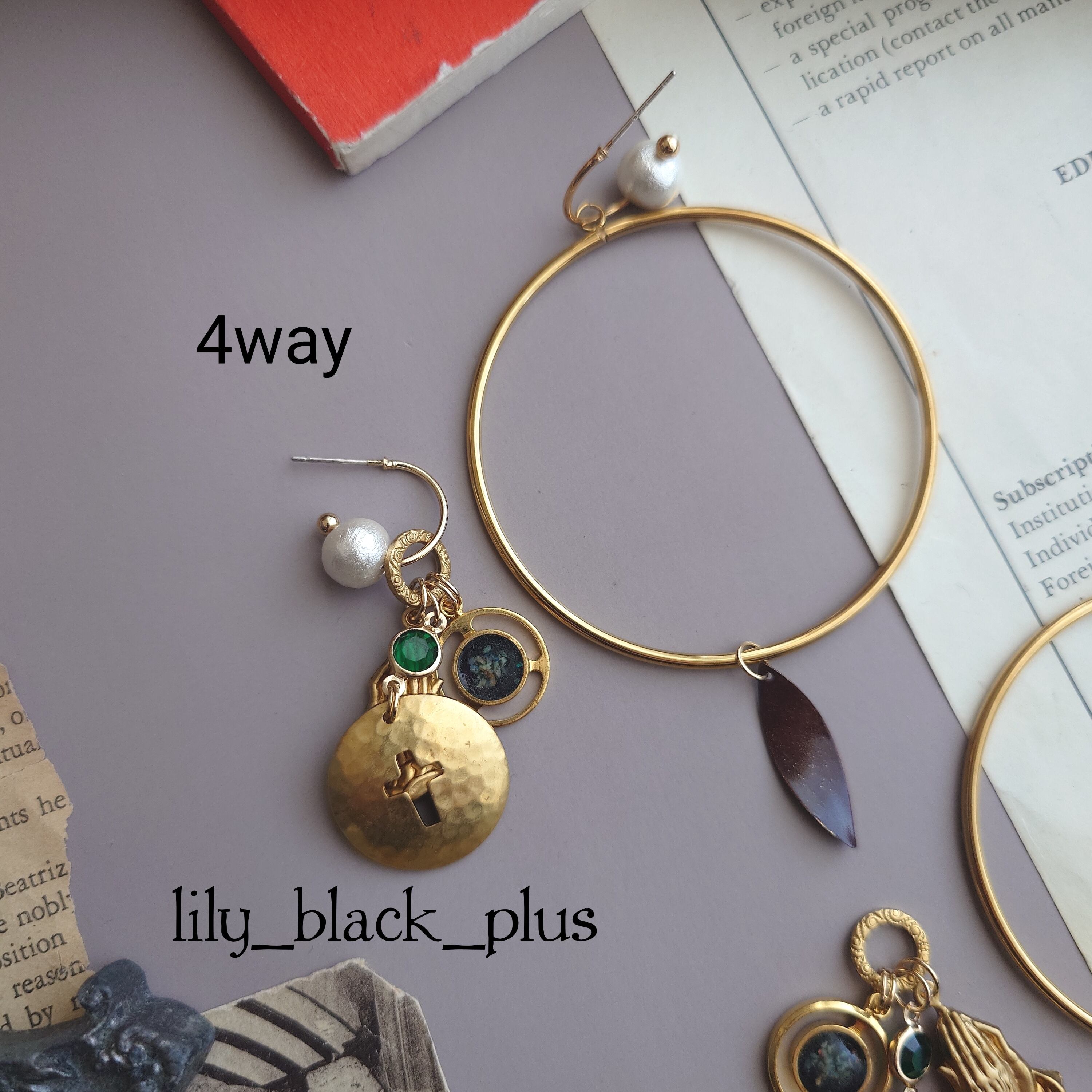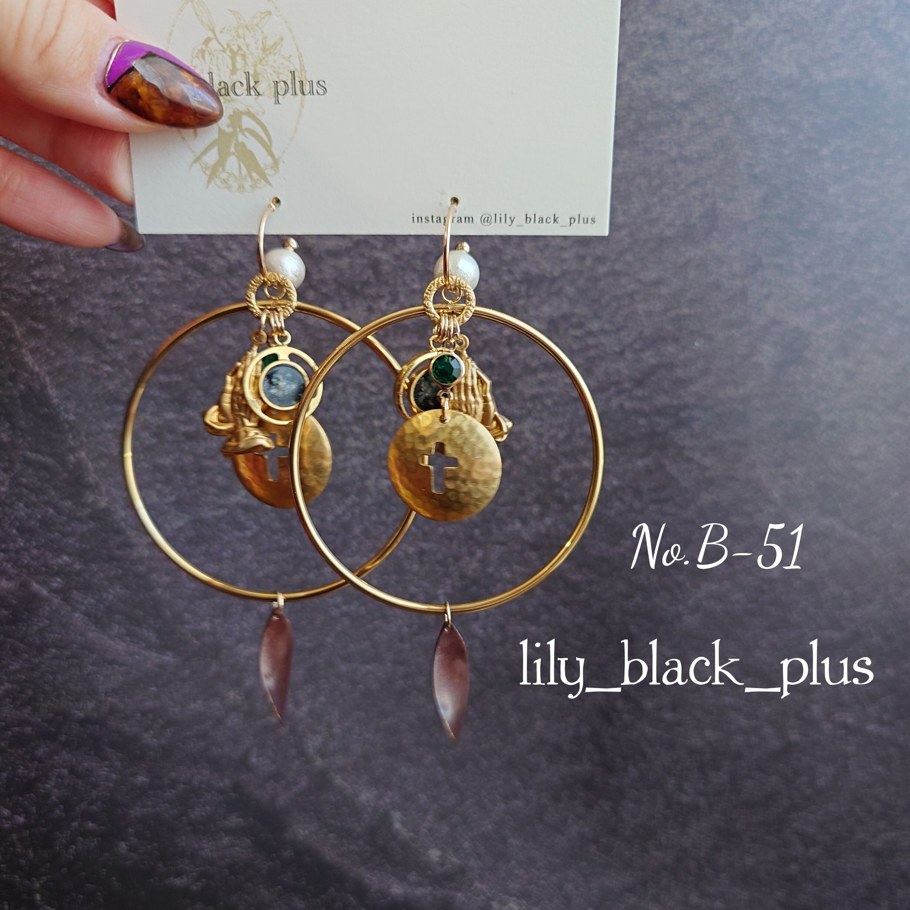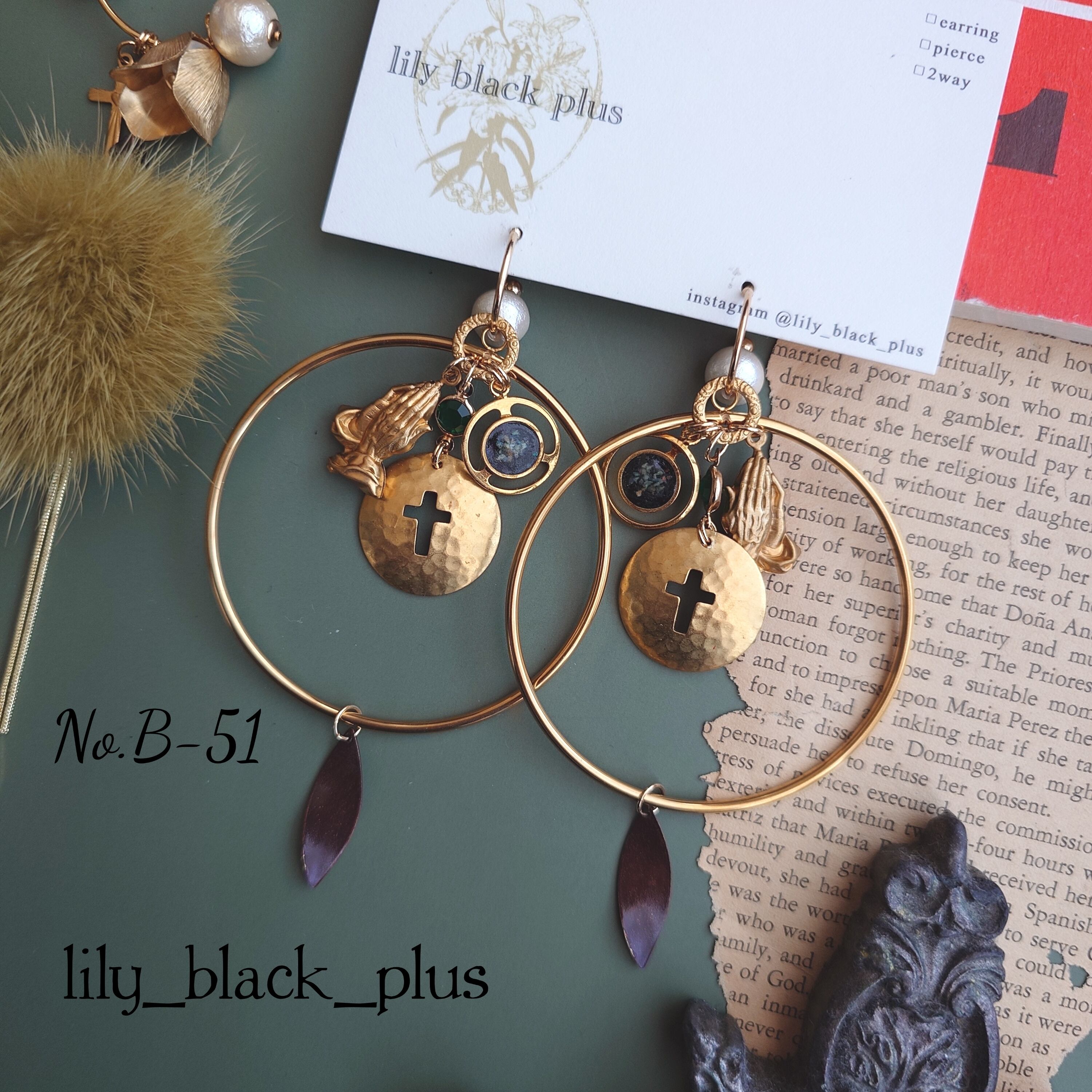 【ピアス商品】No.B-51 Vintageチャームと真鍮クロスのリングフープピアス