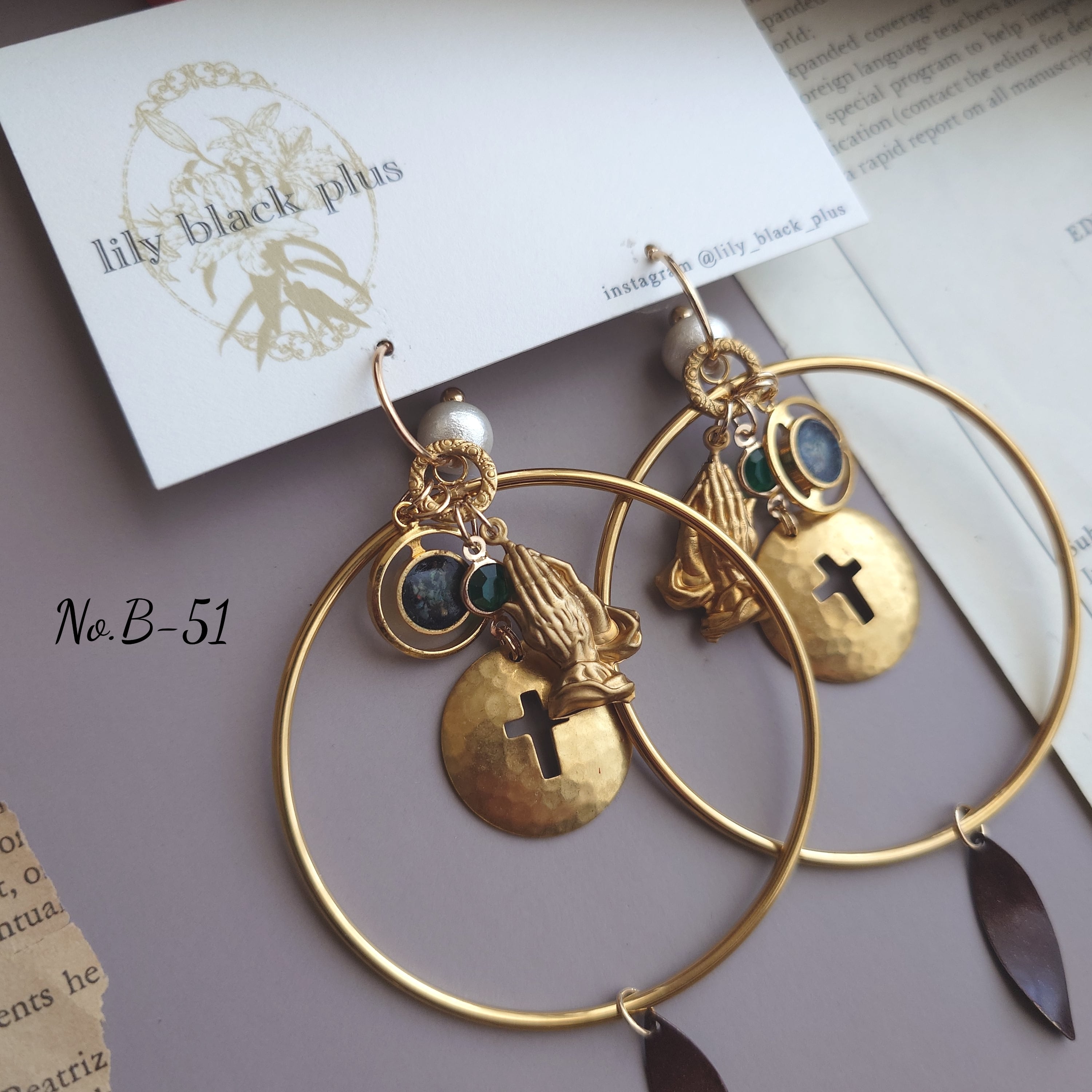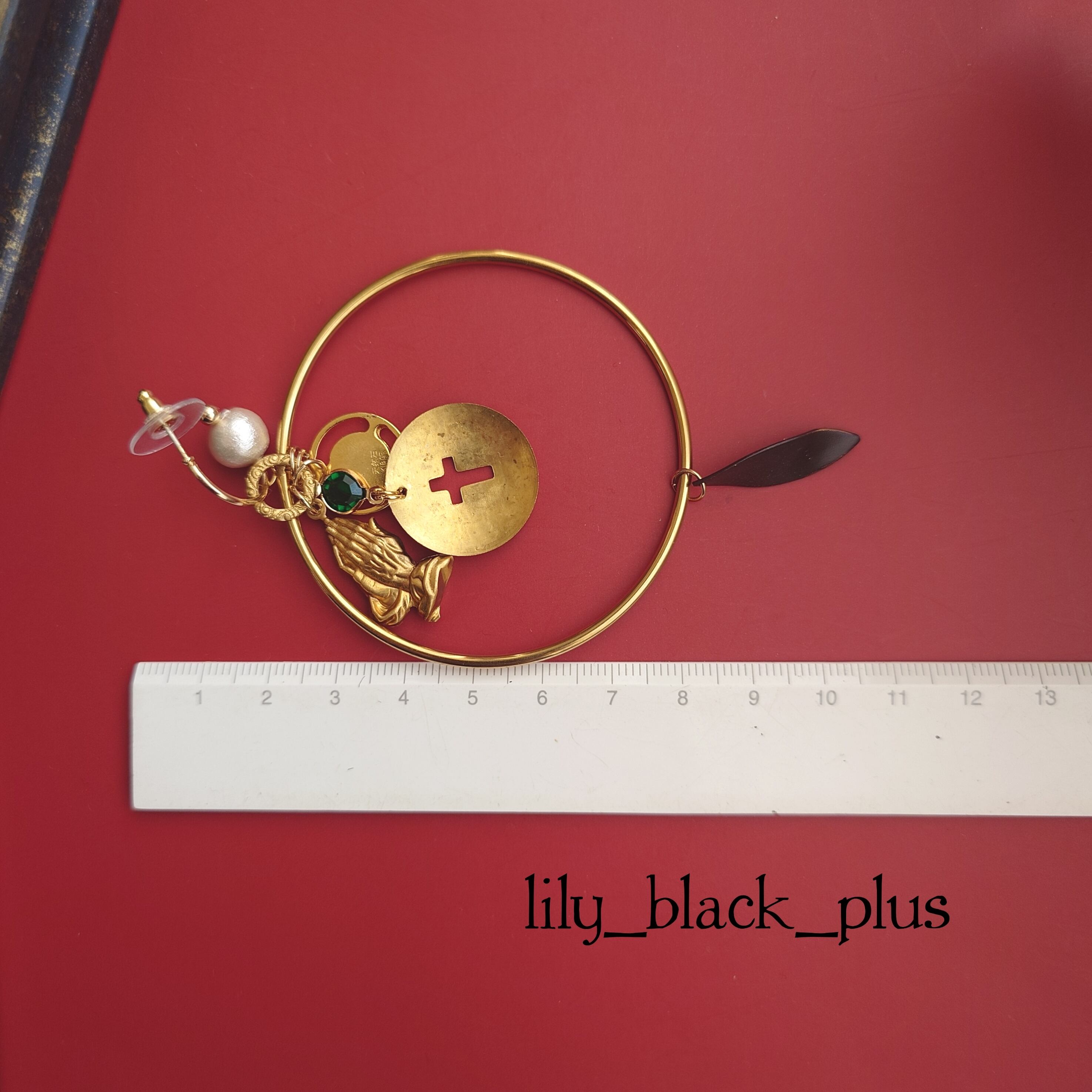 大きなリングにヴィンテージのチャームと手を合わせた立体的デザインの真鍮チャーム、十字架の真鍮プレートを合わせたアクセサリーです。