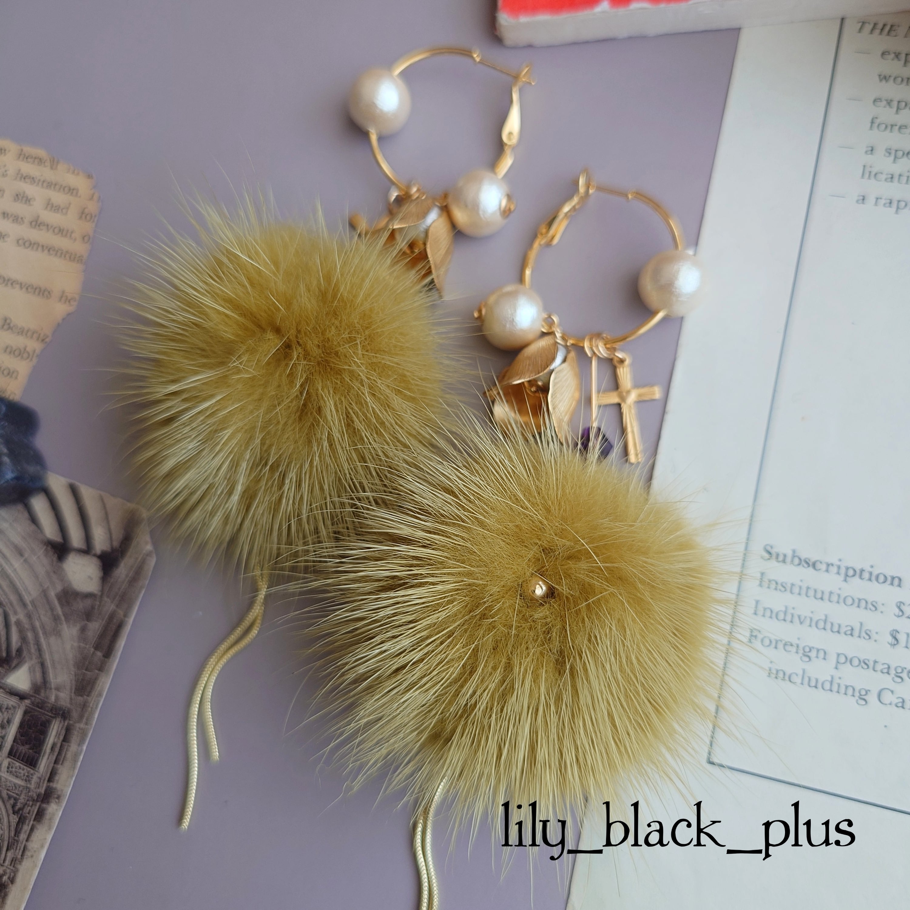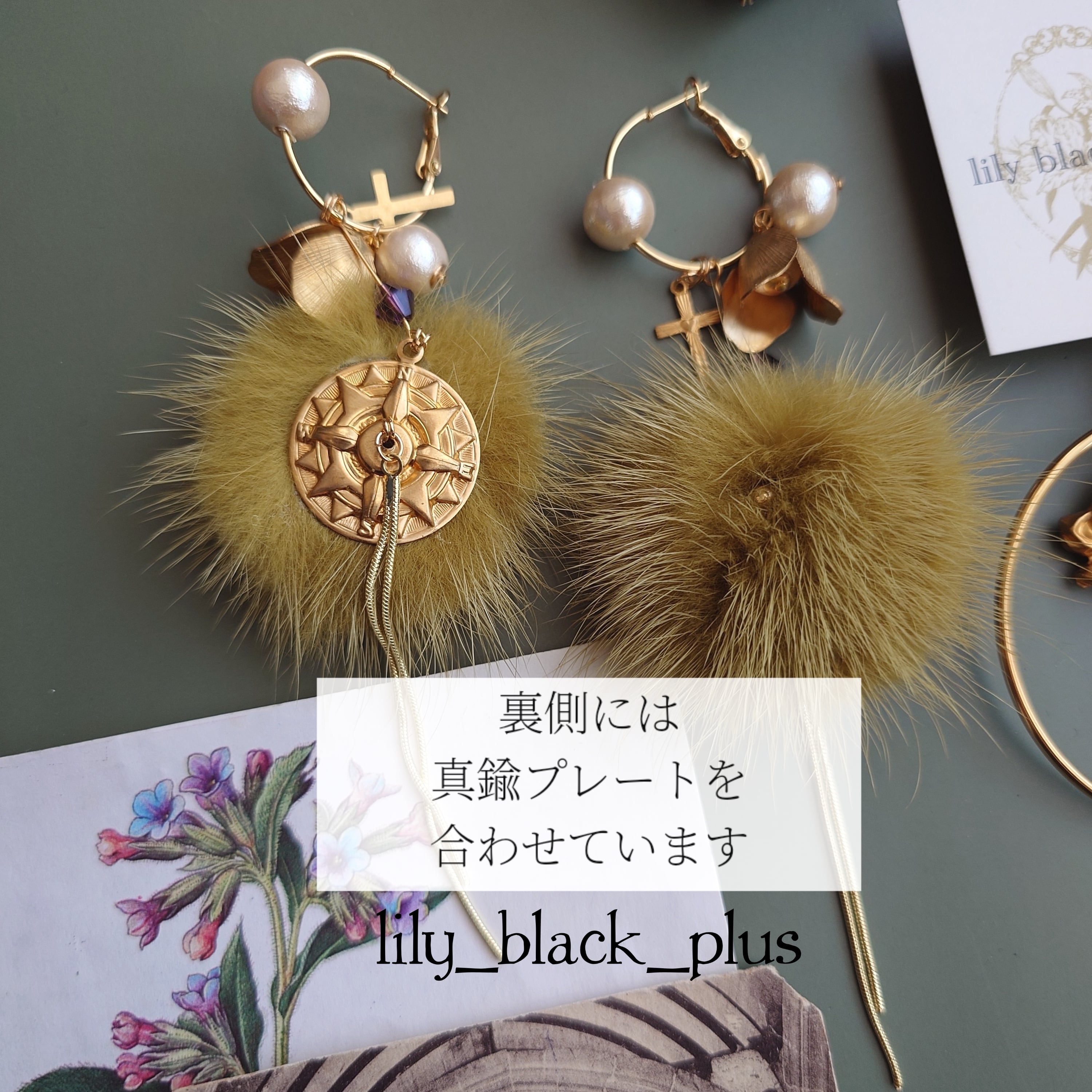 十字架の真鍮チャームとつぼみ真鍮、カーキカラーのふわふわとしたファーチャームを合わせたアクセサリーです。