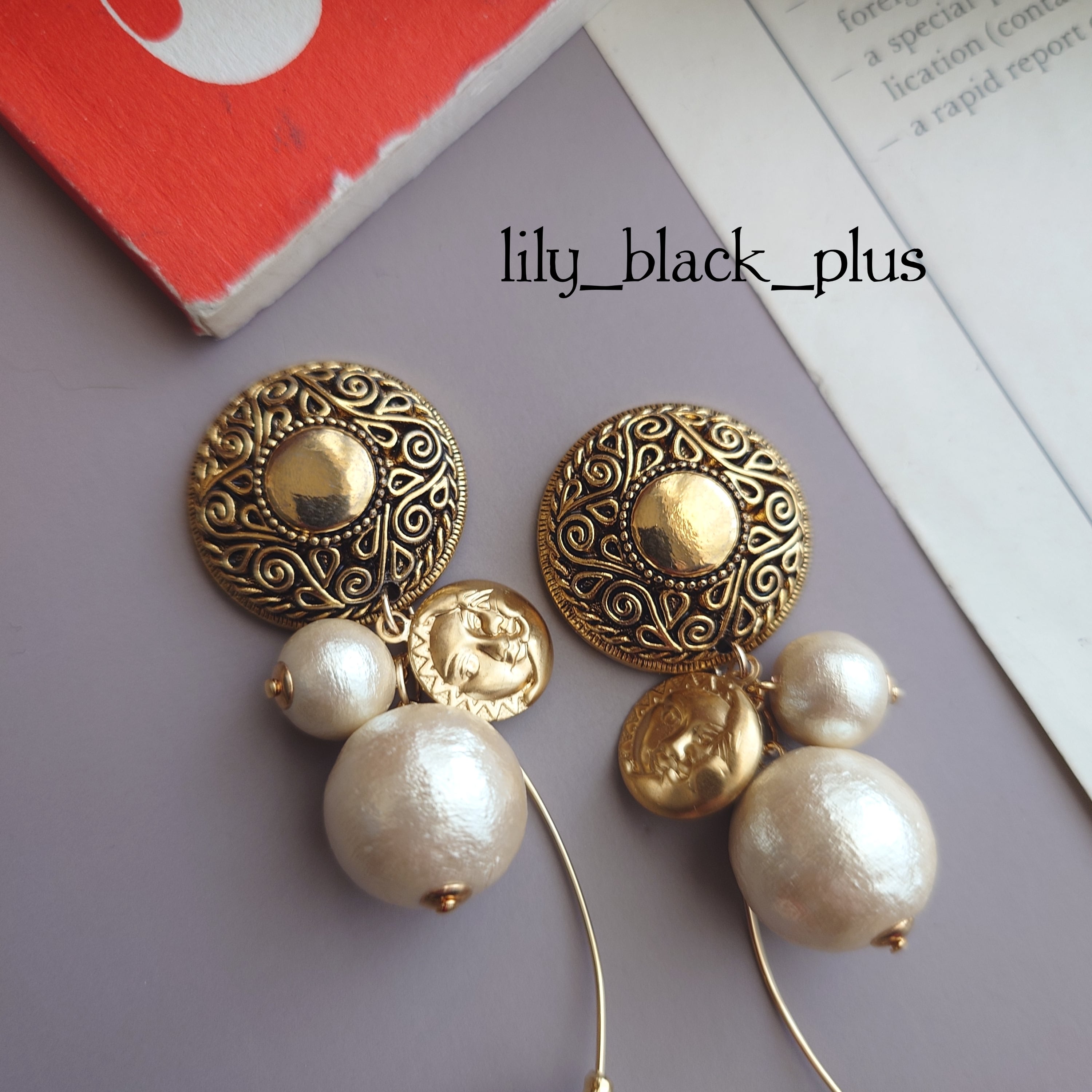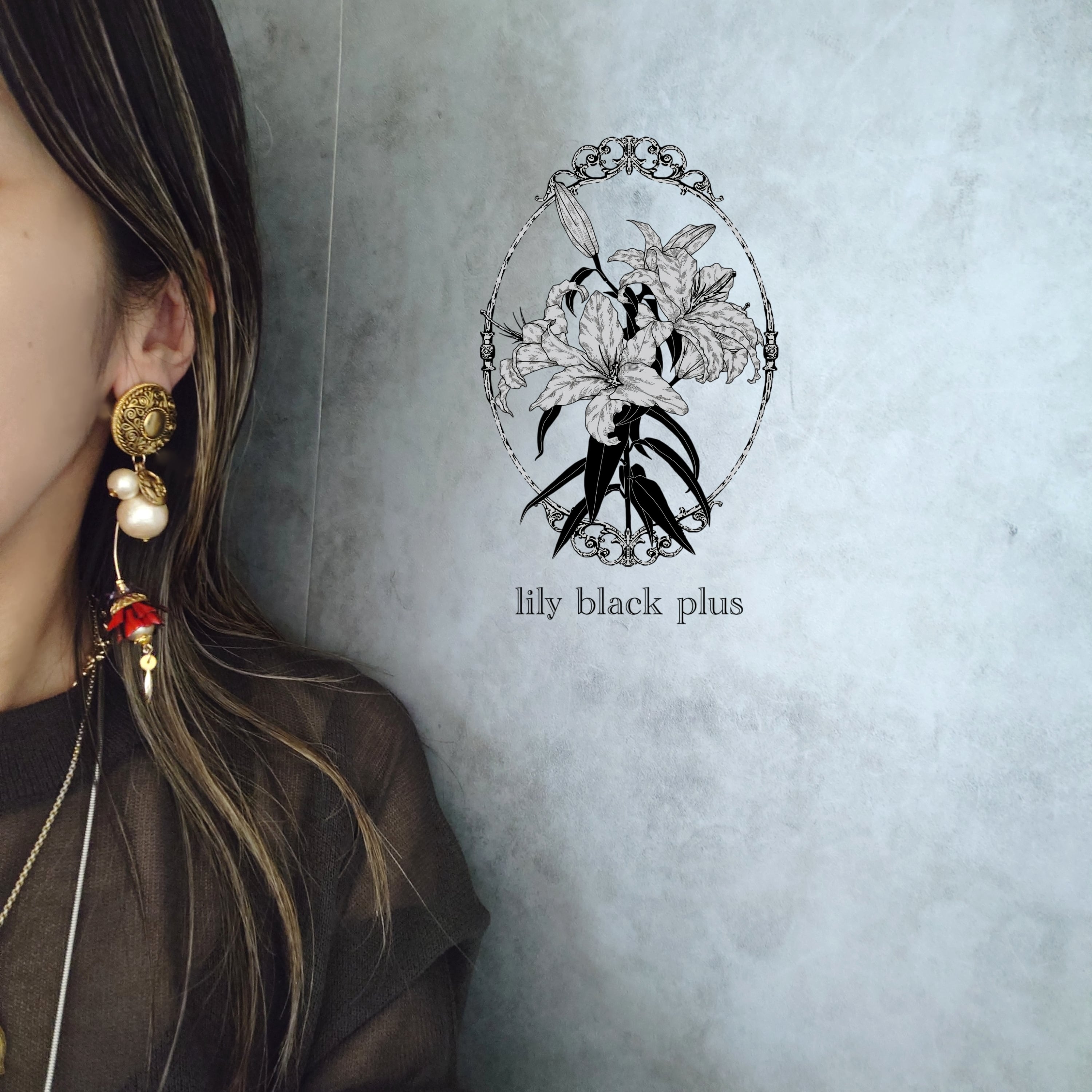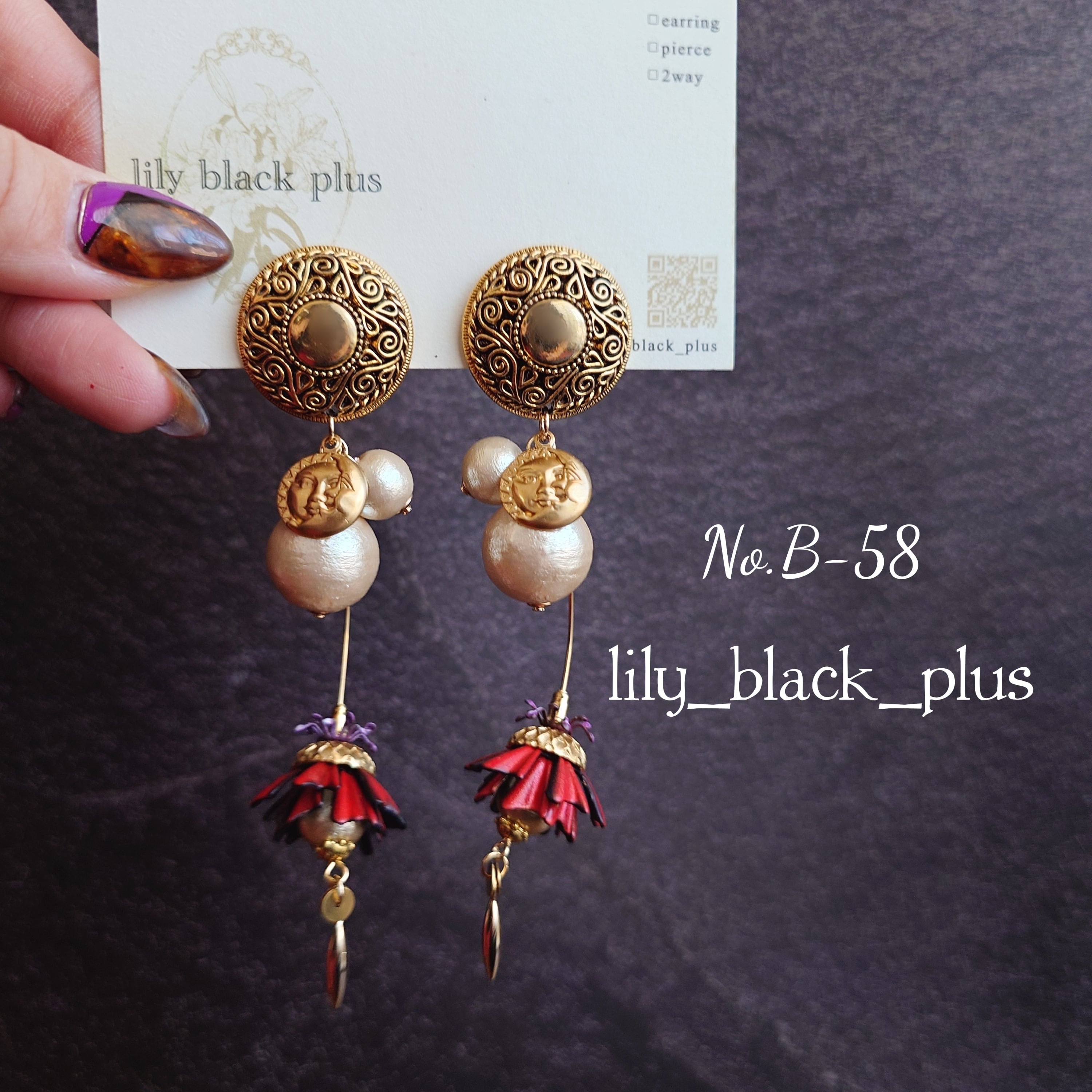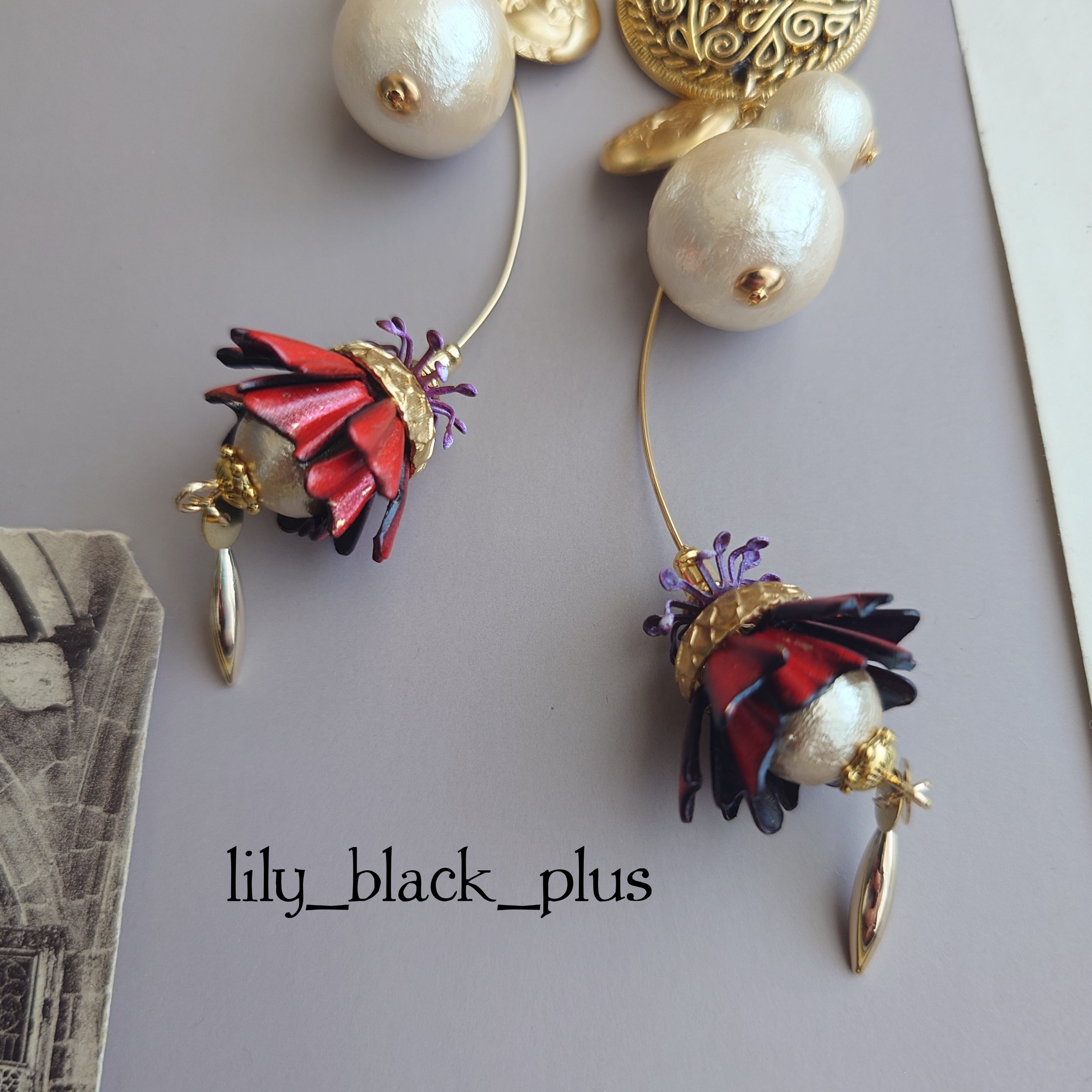 ゴールドのボタンをトップに大きなコットンパールと太陽と月のデザインの真鍮チャーム、カーブを付けたスティックの先に赤にペイントした真鍮フラワーを蕾のように組み合わせたアクセサリーです。