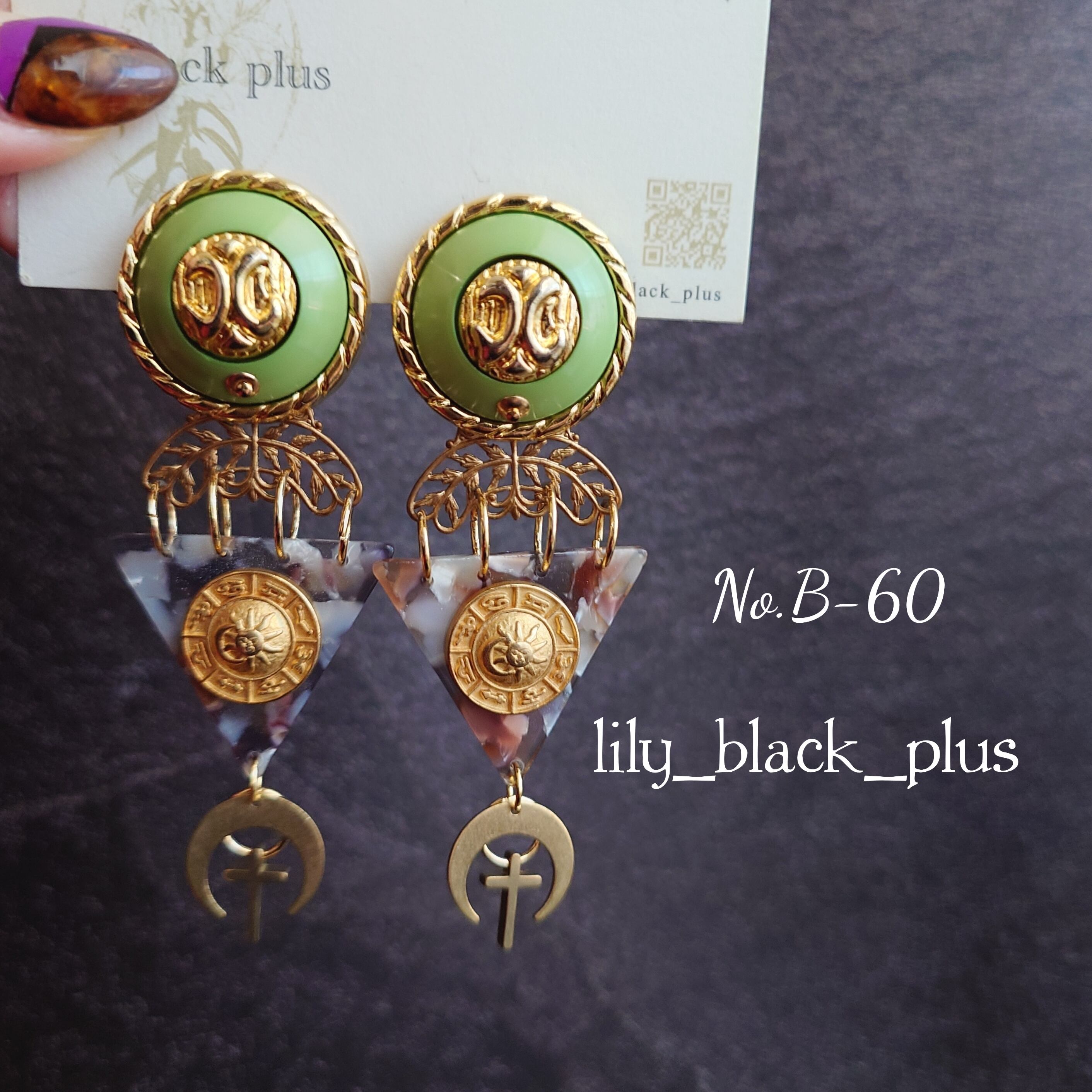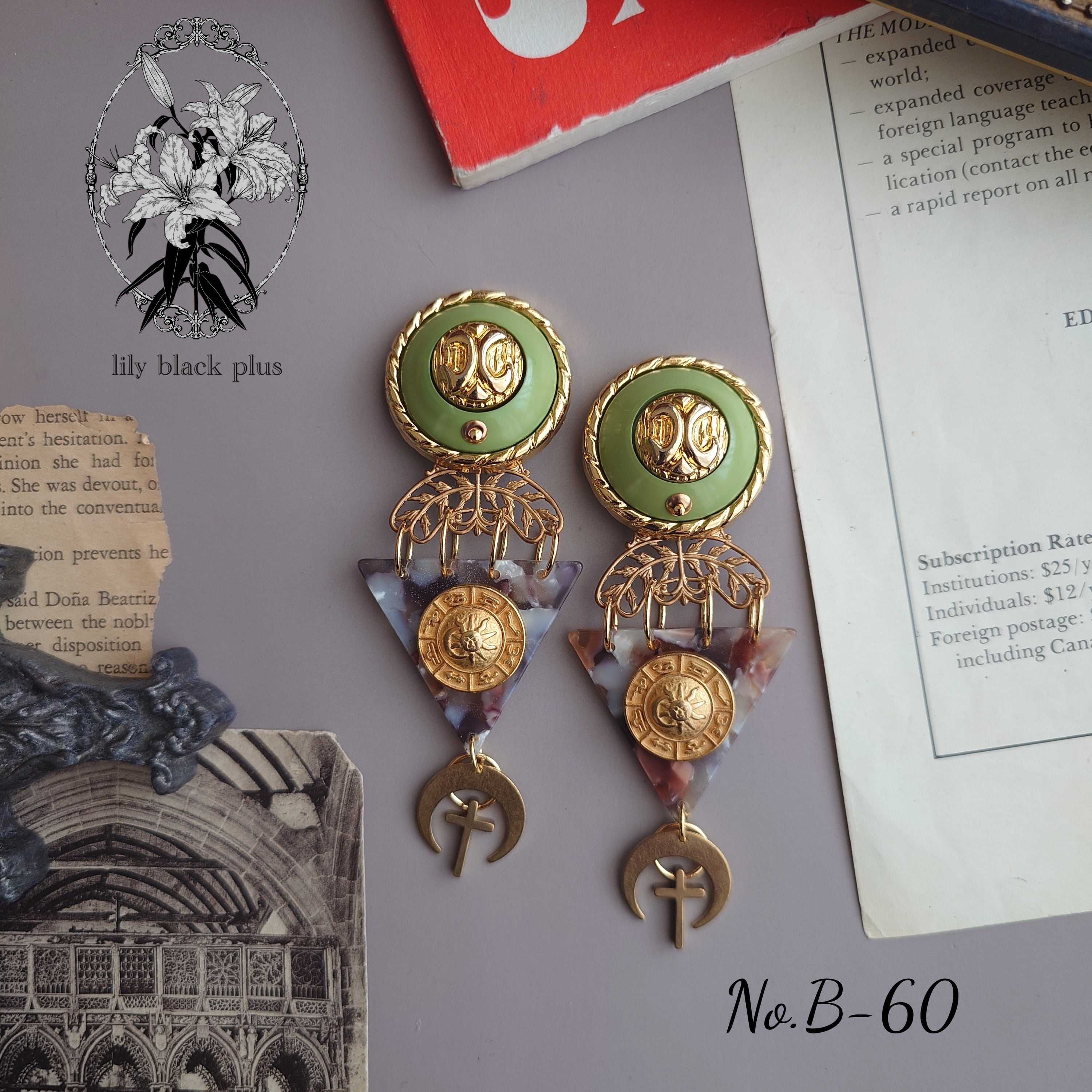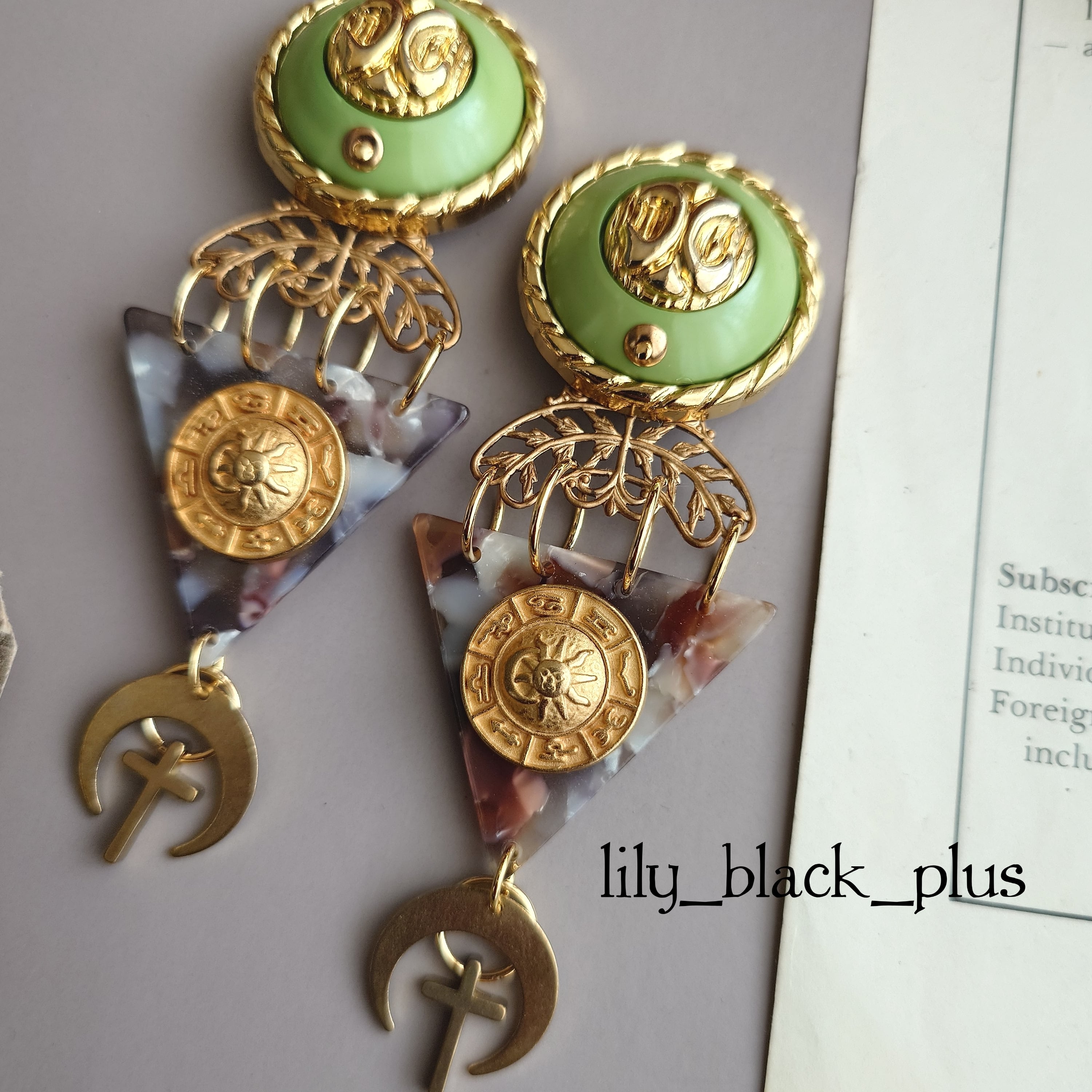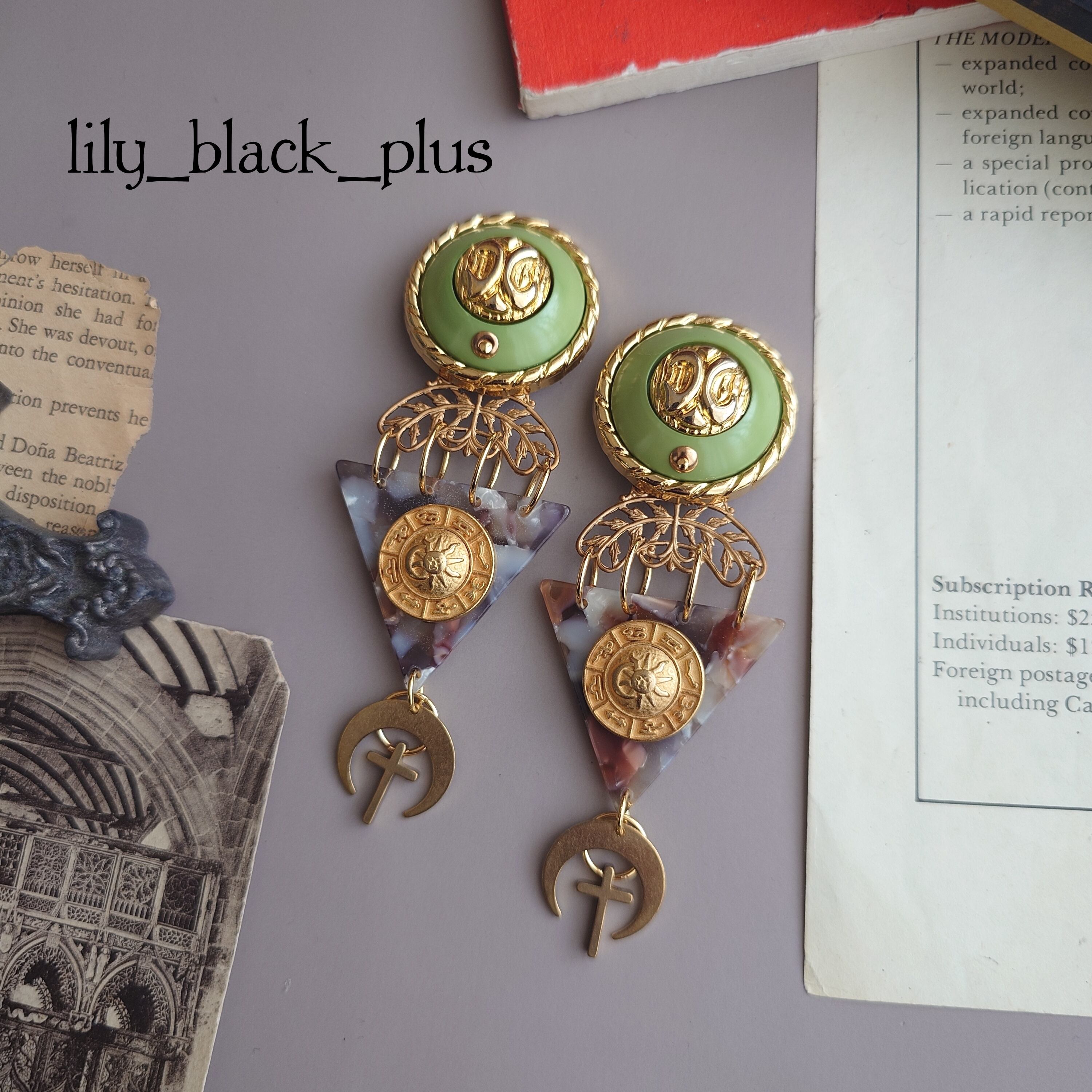 大きなグリーンのボタンと真鍮プレートを組み合わせ、太陽と月のメタルボタンを合わせた三角のプレートをリングで繋ぎ、十字架チャームを合わせたアクセサリーです。