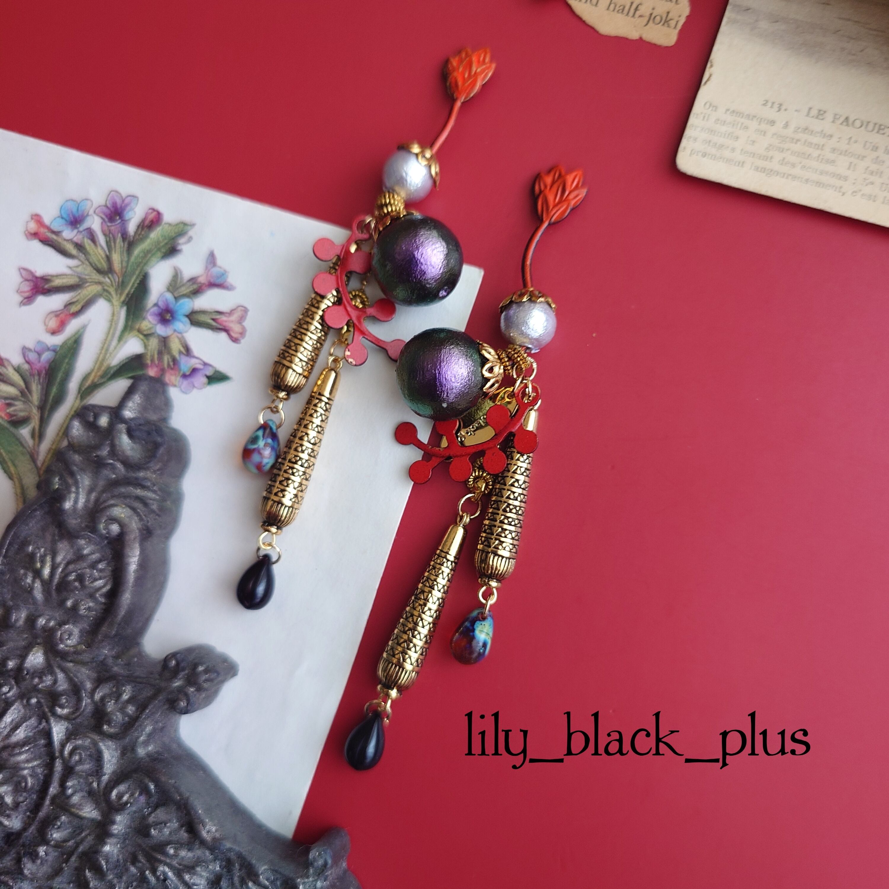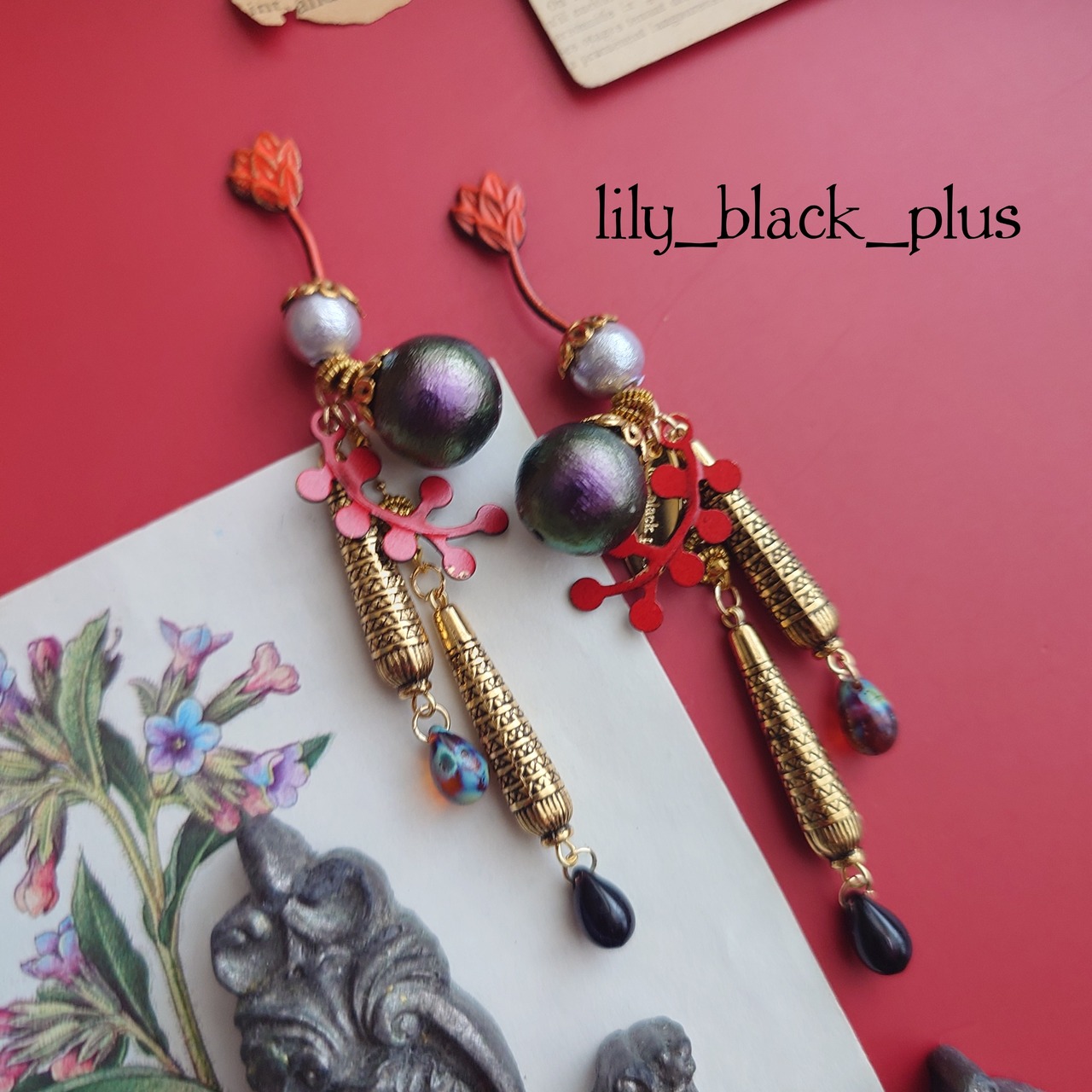 小さなお花の真鍮プレートの先にカラーのコットンパールを合わせ、ペイントした真鍮チャームとゴールドのヴィンテージビーズを合わせたアクセサリーです。