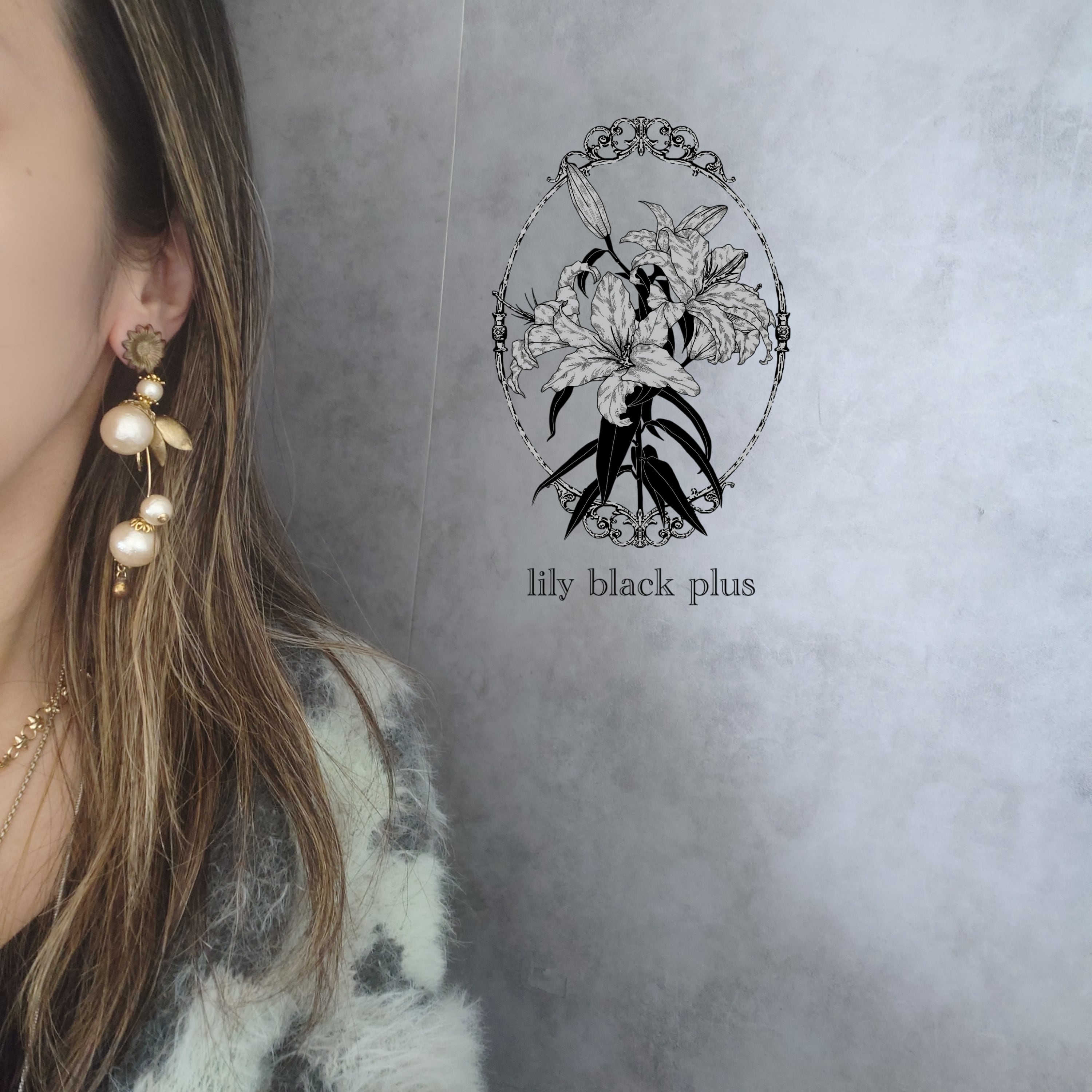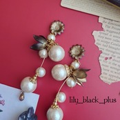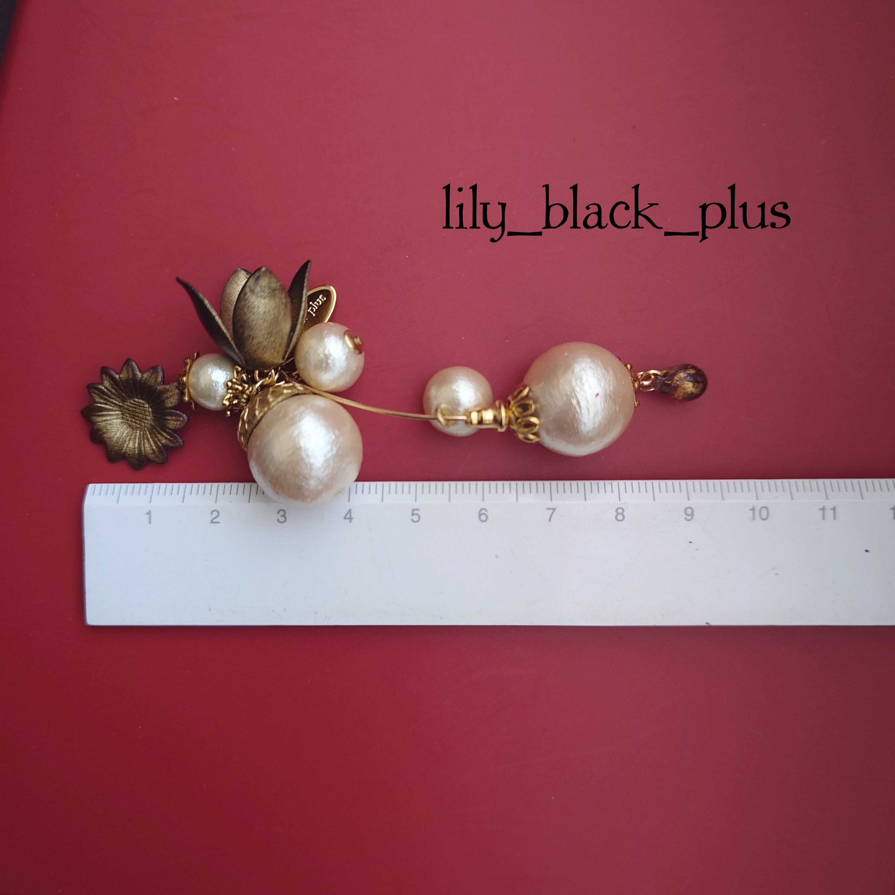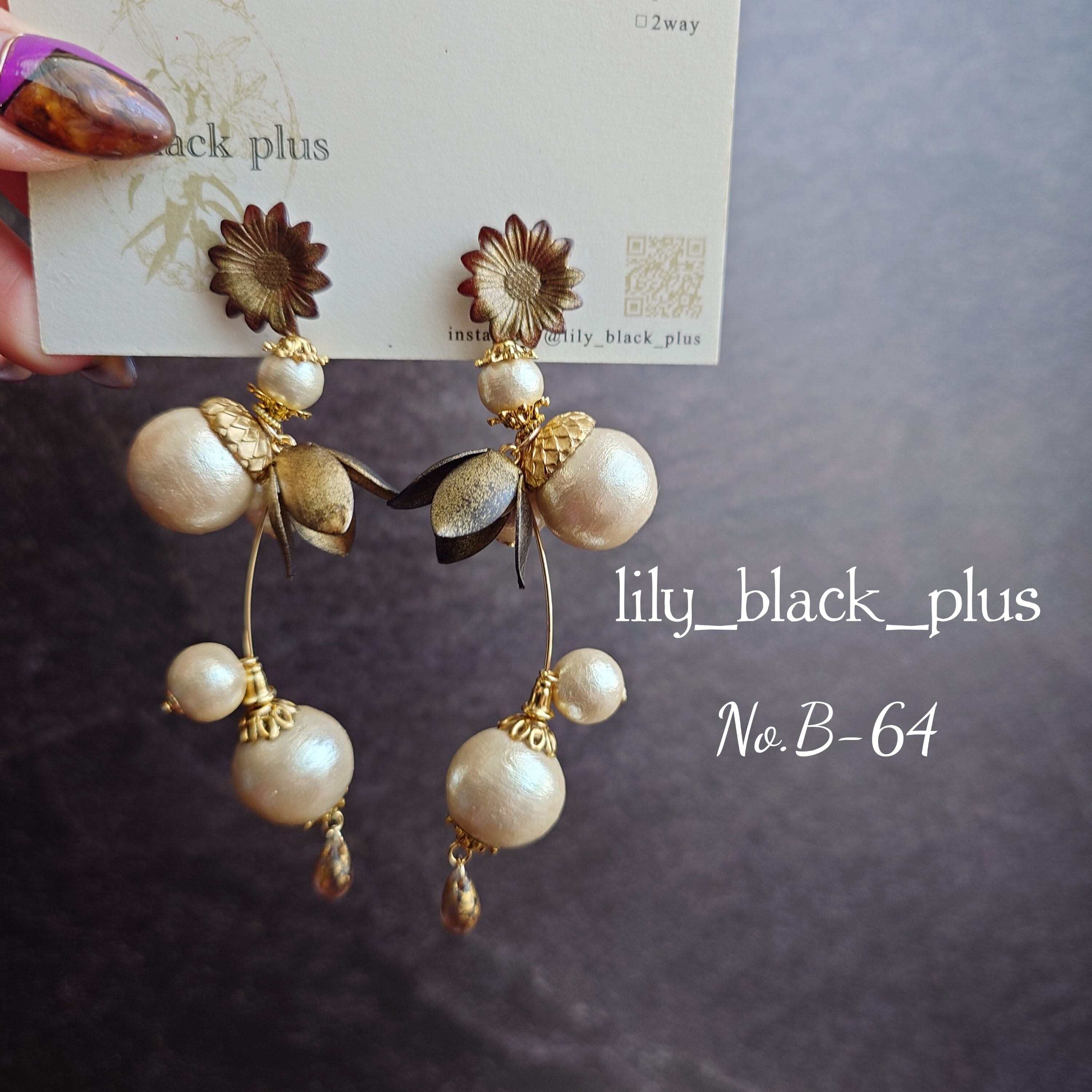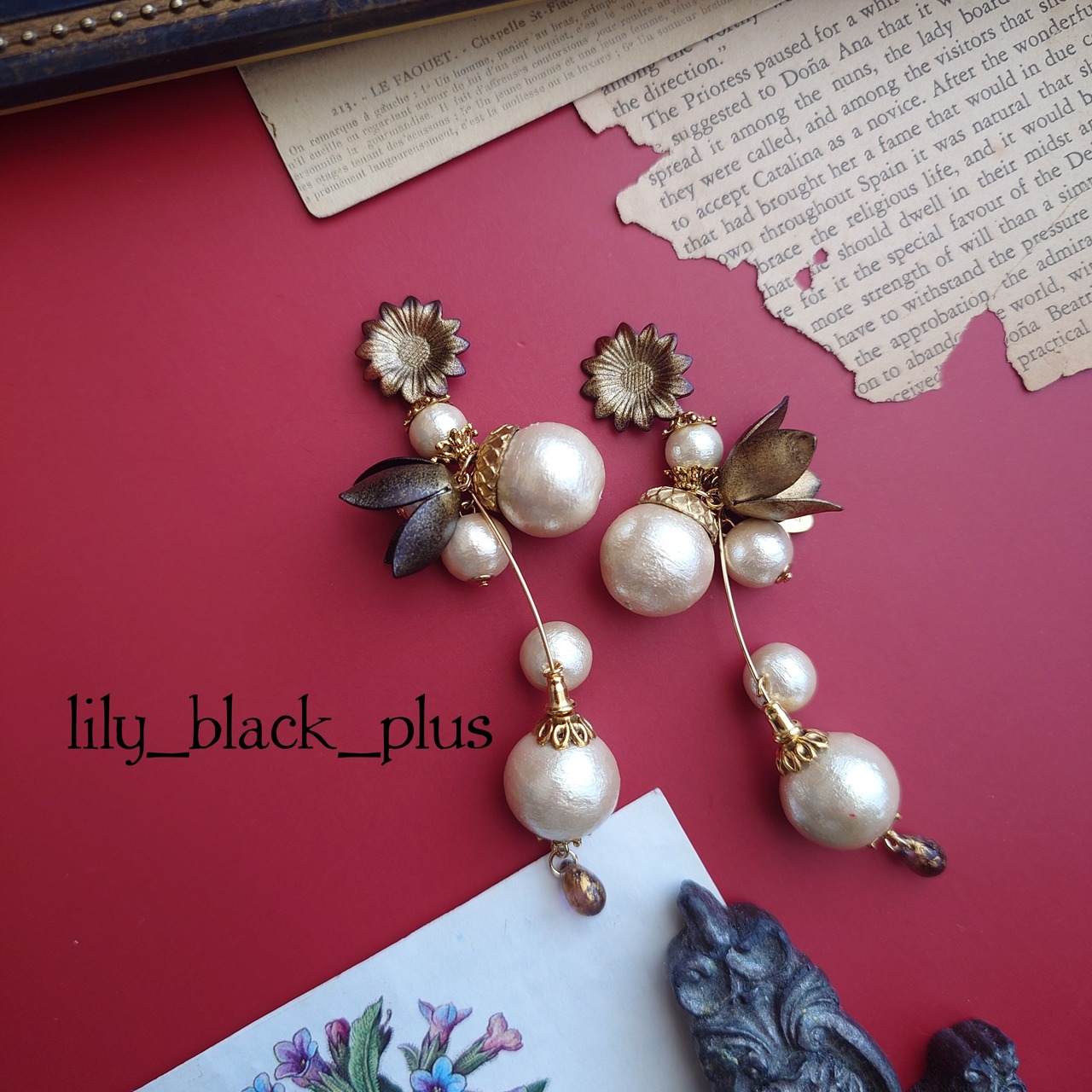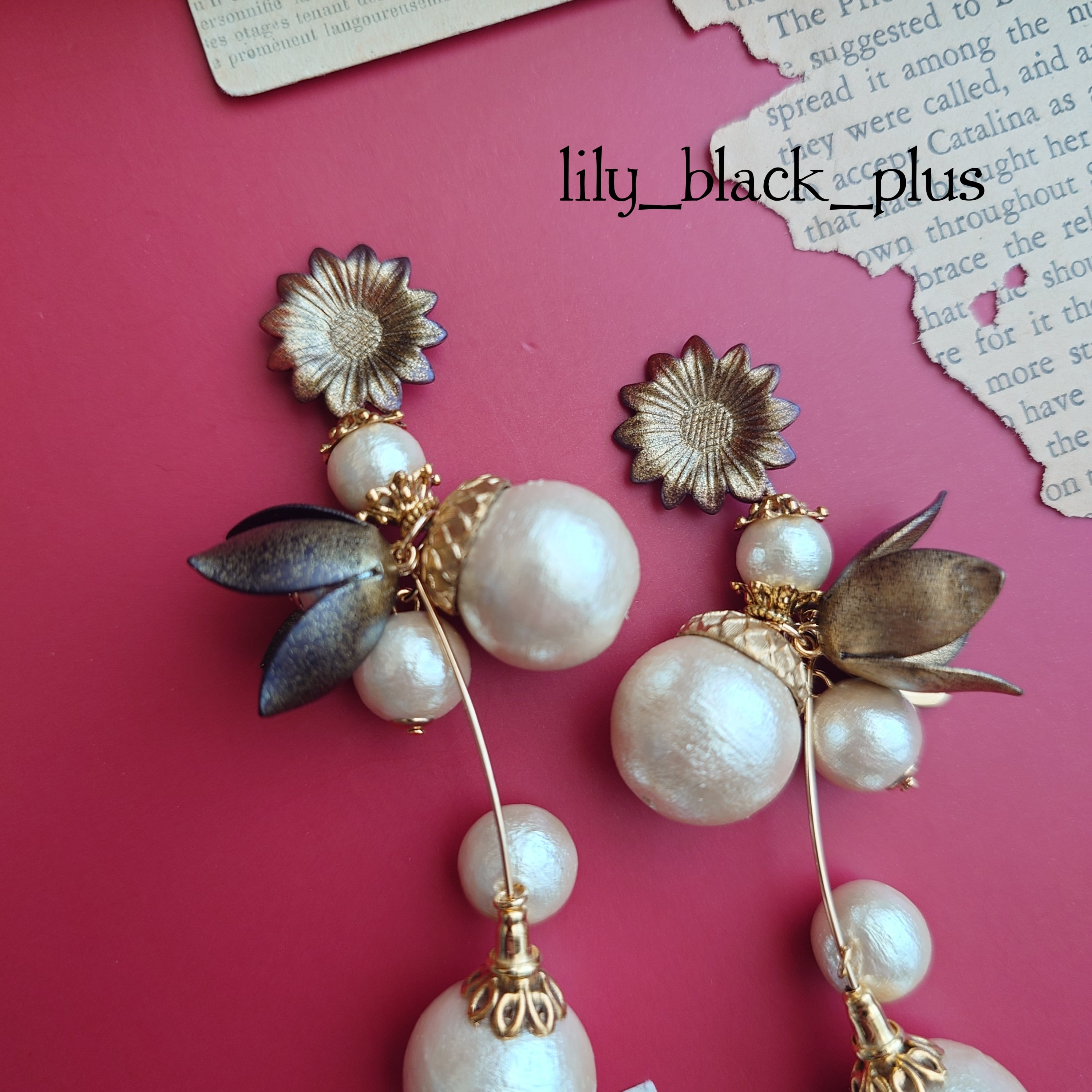 ゴールドブラウンにペイントした小さなお花の真鍮プレートの先にコットンパールやペイントした真鍮フラワーを合わせ、カーブをつけた先に大きなコットンパールを合わせたアクセサリーです。