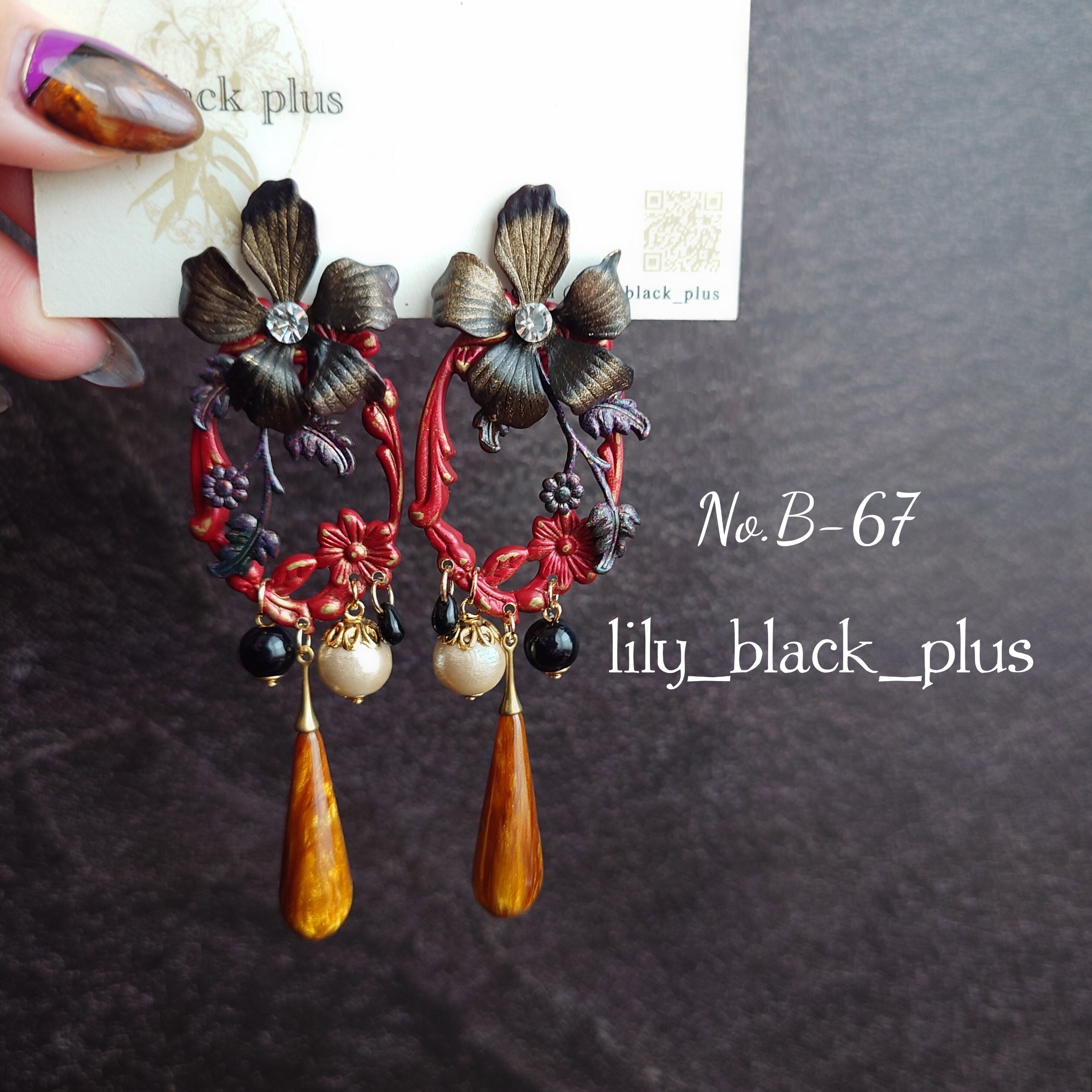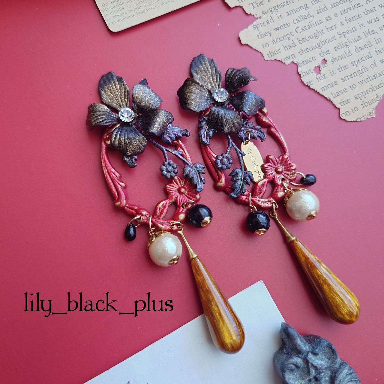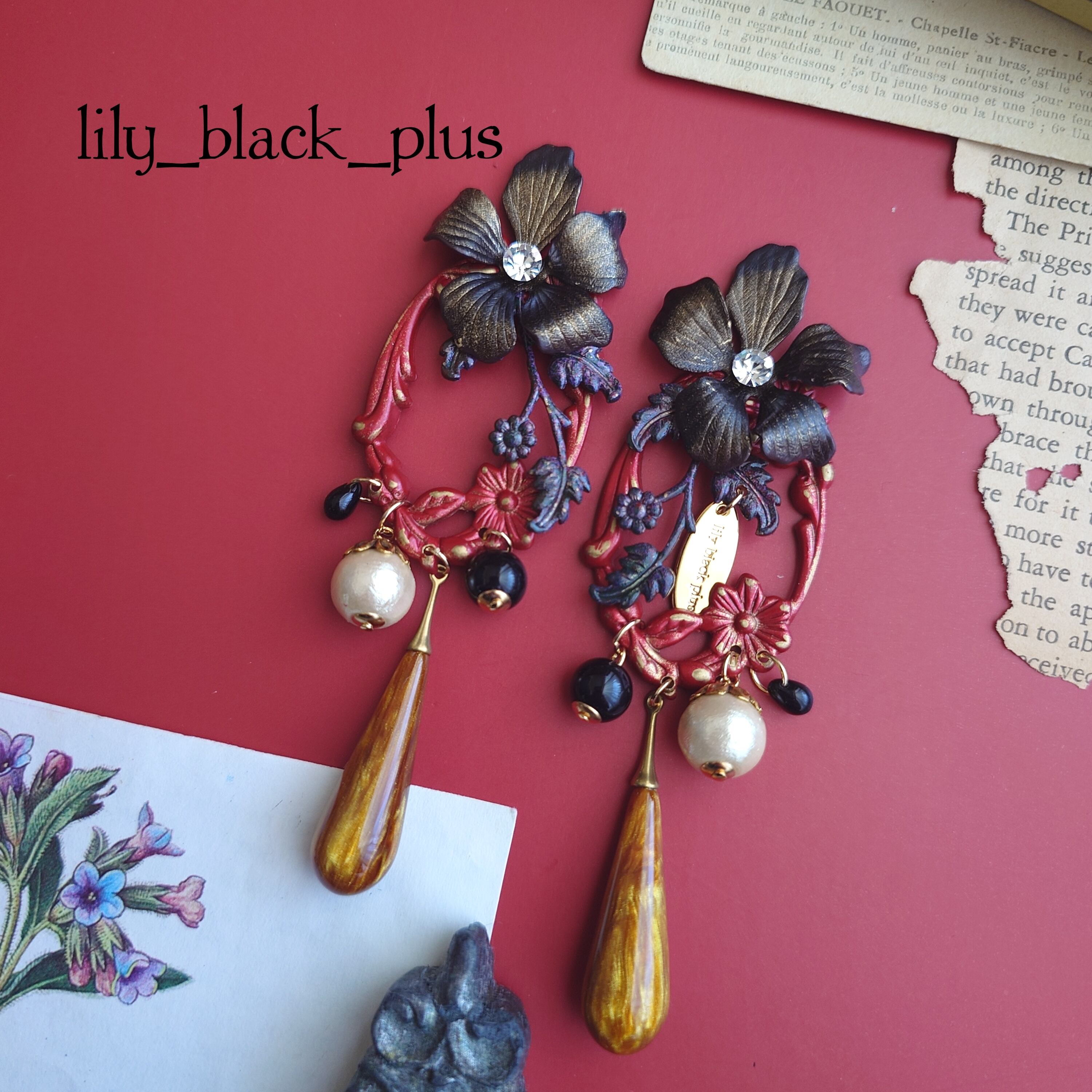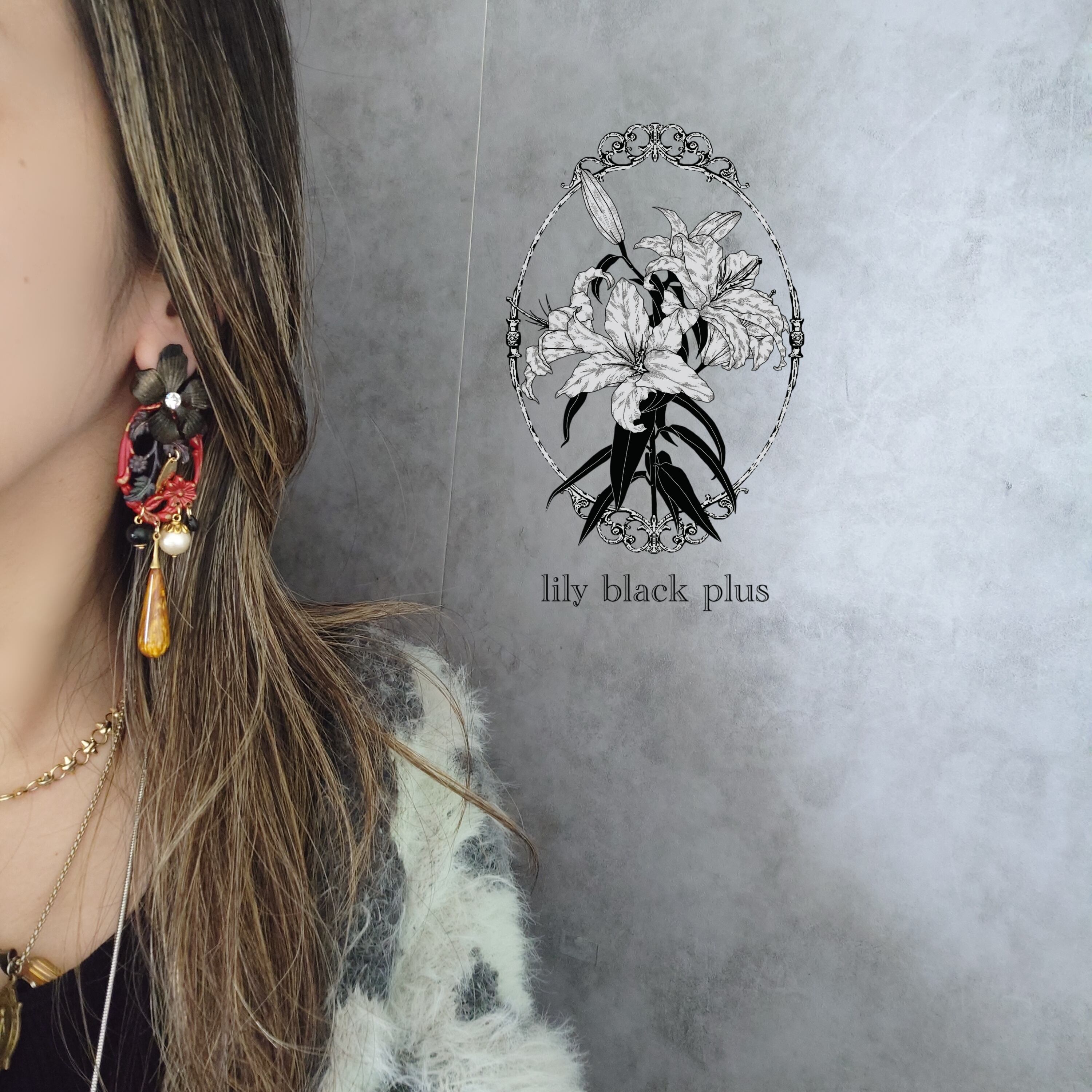 ブラックにペイントした真鍮フラワーと赤にペイントした大きな真鍮プレート、真鍮リーフを組み合わせ、コットンパールやブラウンのビーズを合わせたアクセサリーです。存在感がありながら普段使いにも合わせやすいデザインです。