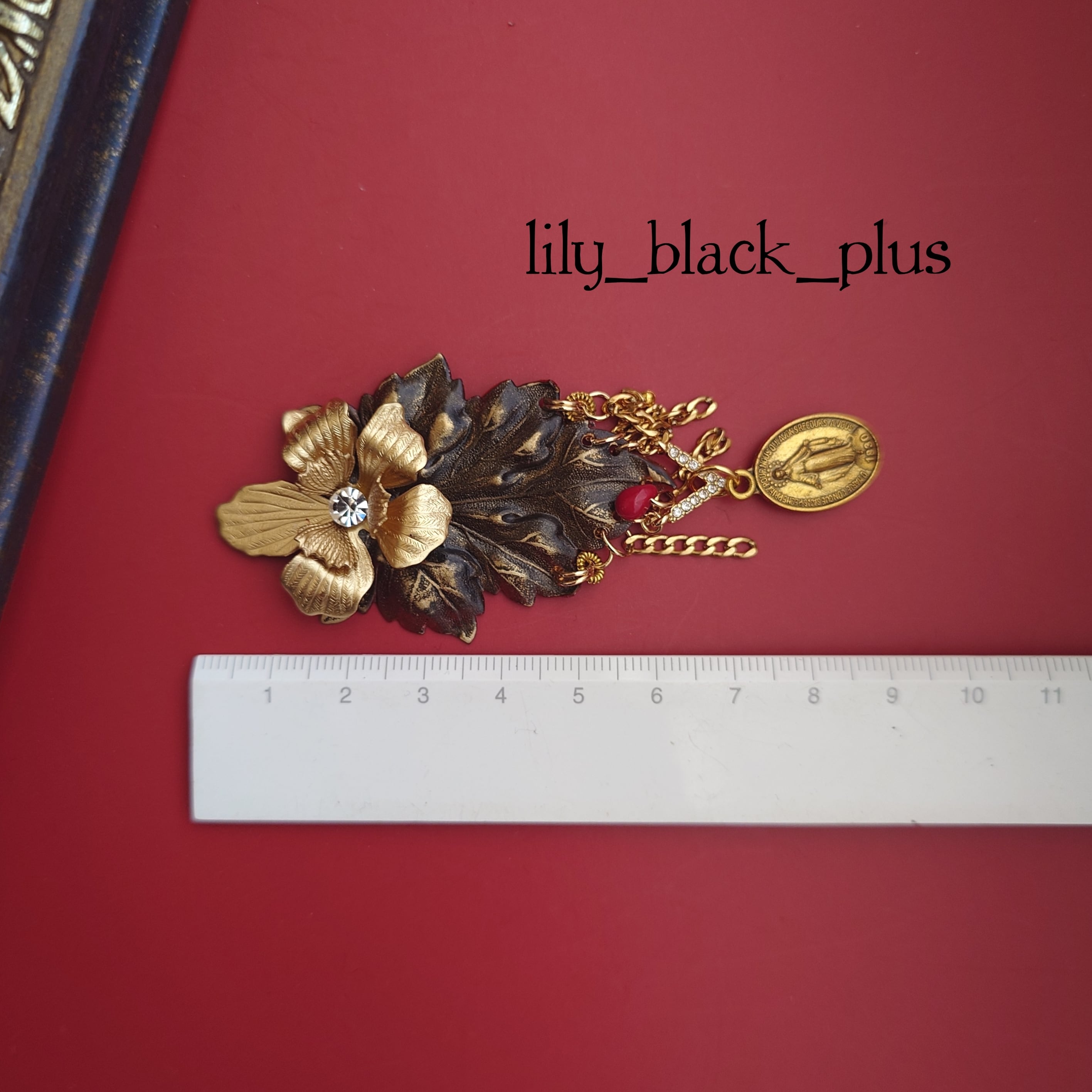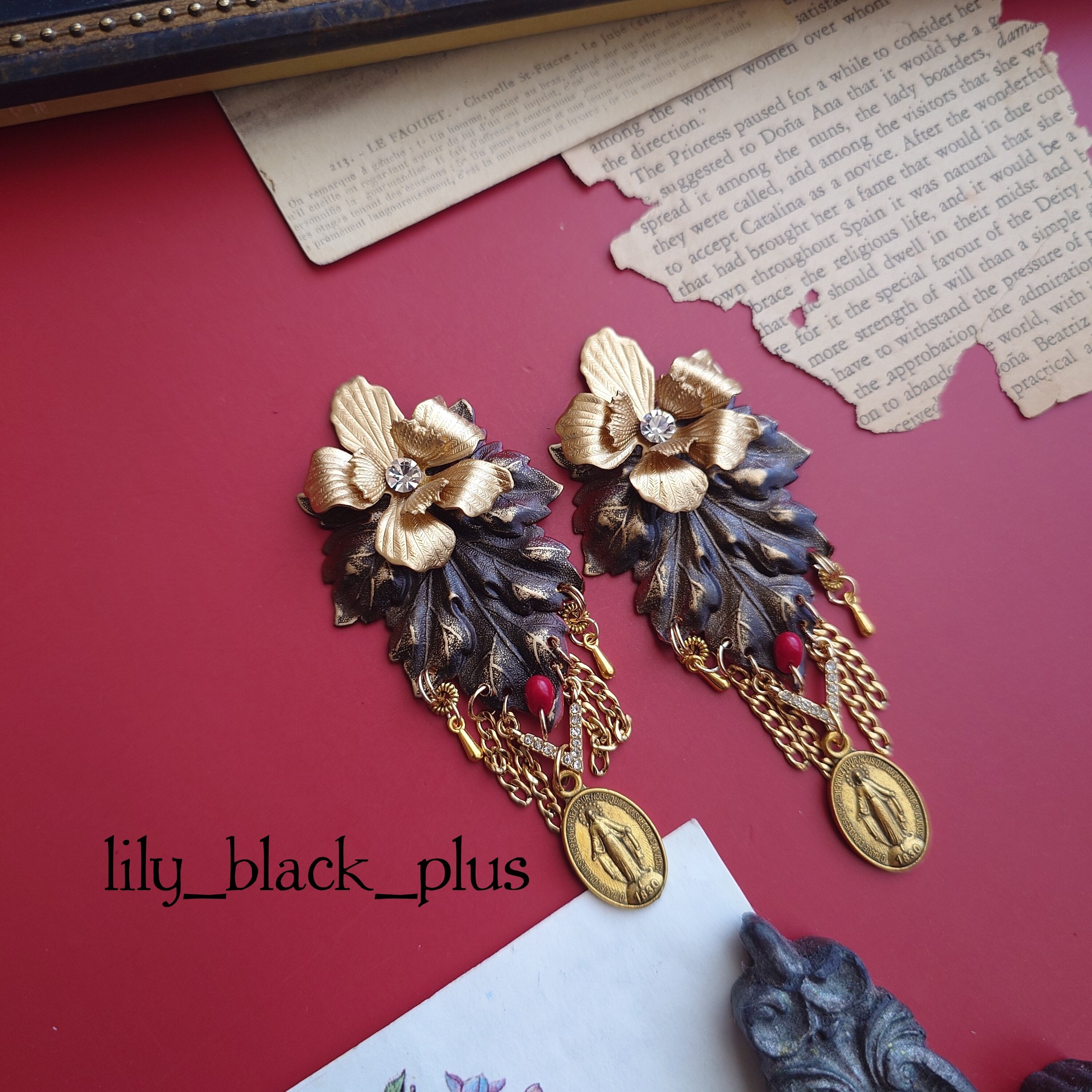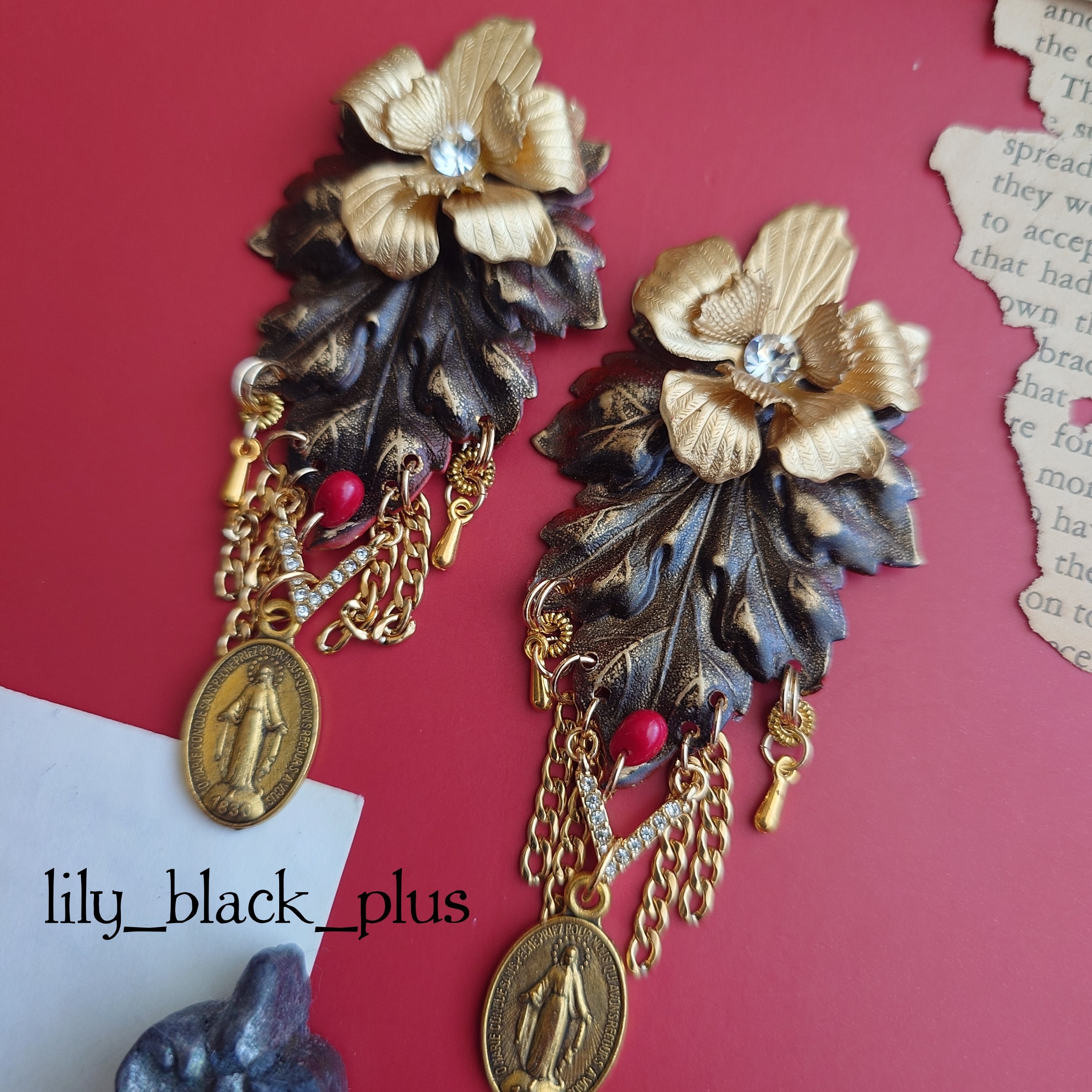真鍮フラワーとブラックにペイントした大きな真鍮リーフプレートを組み合わせ、チェーンとキラキラチャーム、メダイチャームを合わせたアクセサリーです。