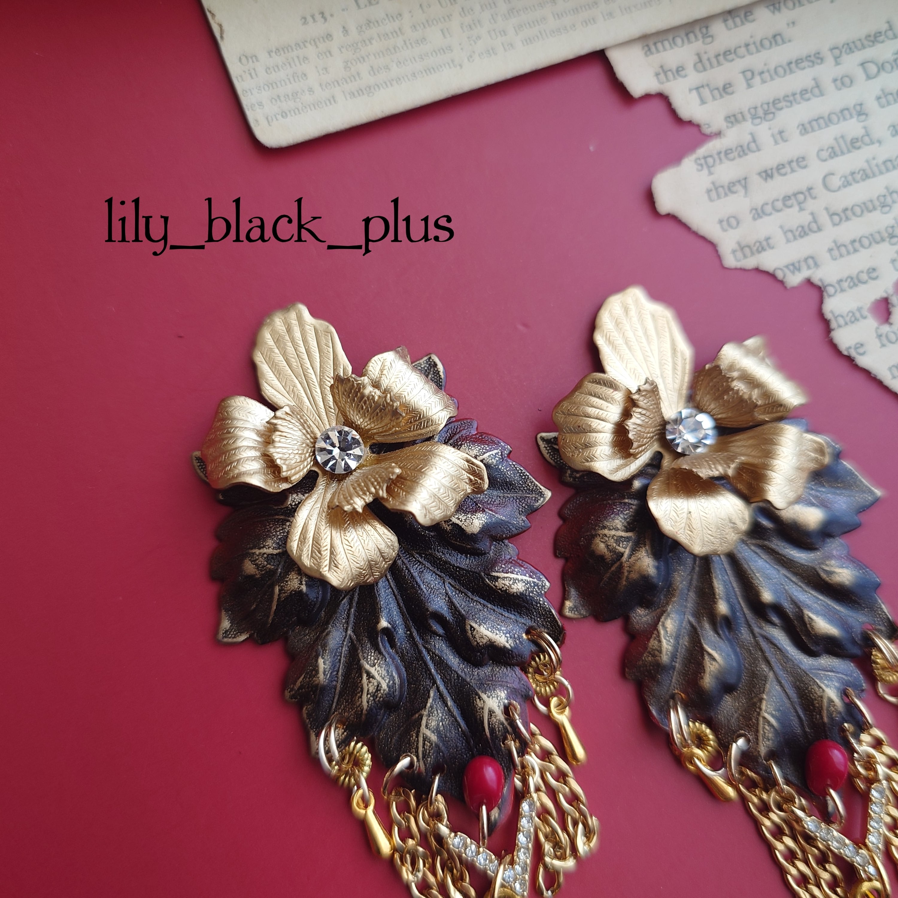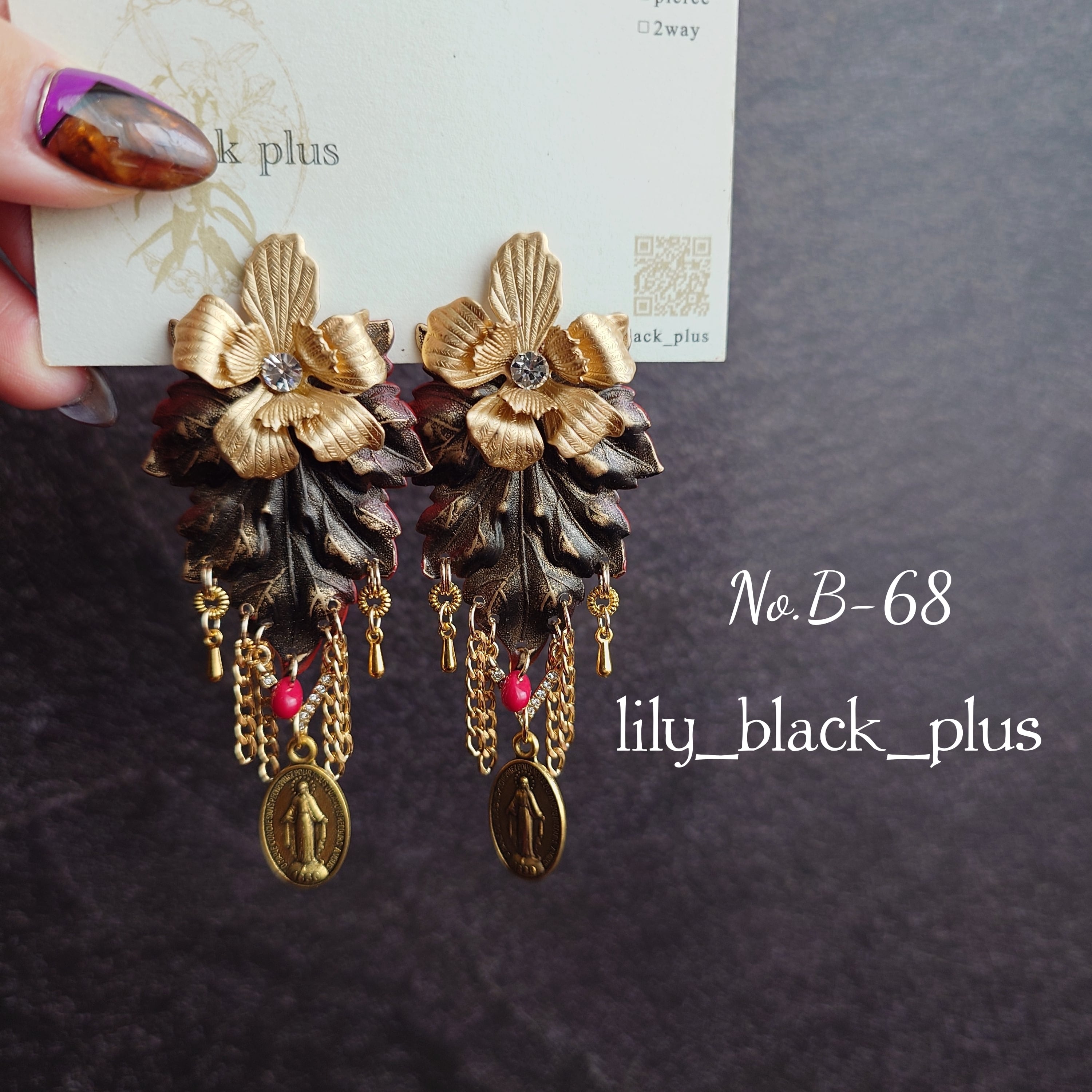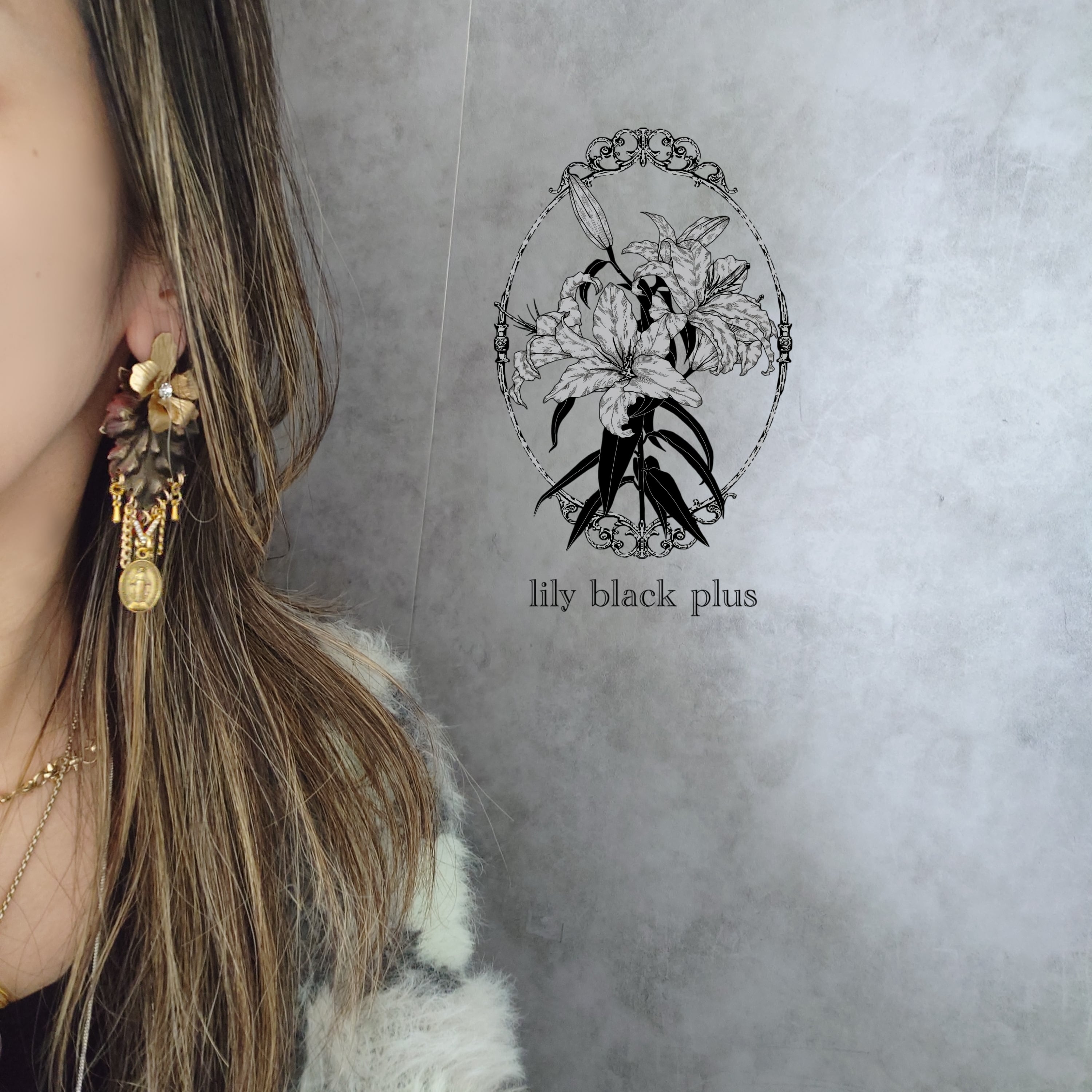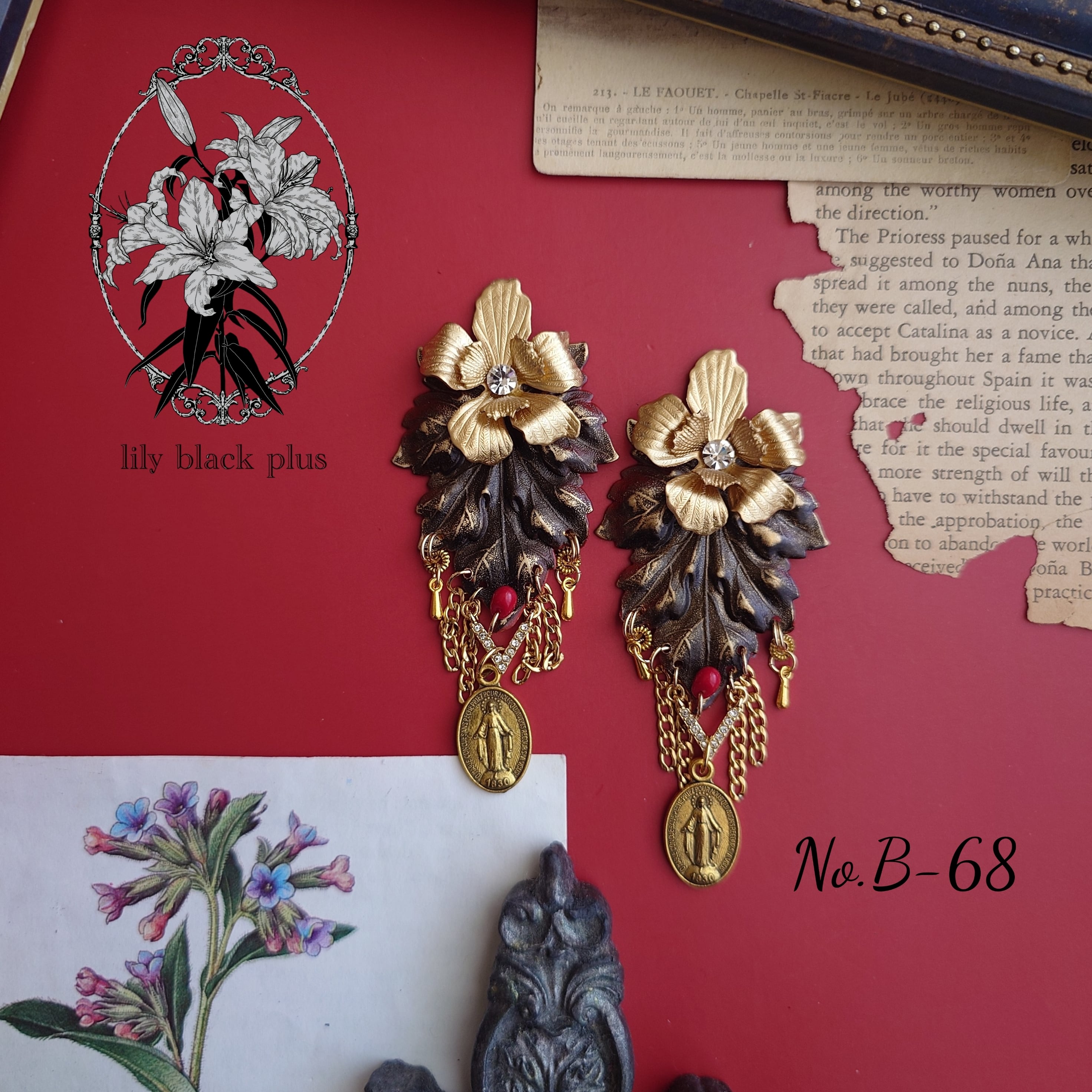 真鍮フラワーとブラックにペイントした大きな真鍮リーフプレートを組み合わせ、チェーンとキラキラチャーム、メダイチャームを合わせたアクセサリーです。