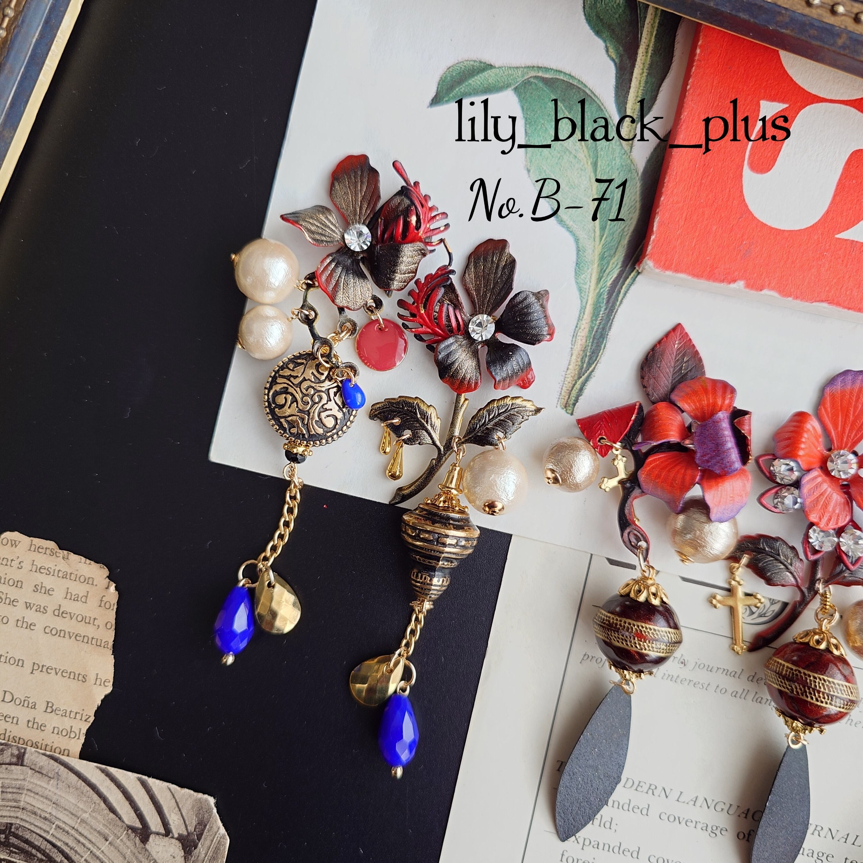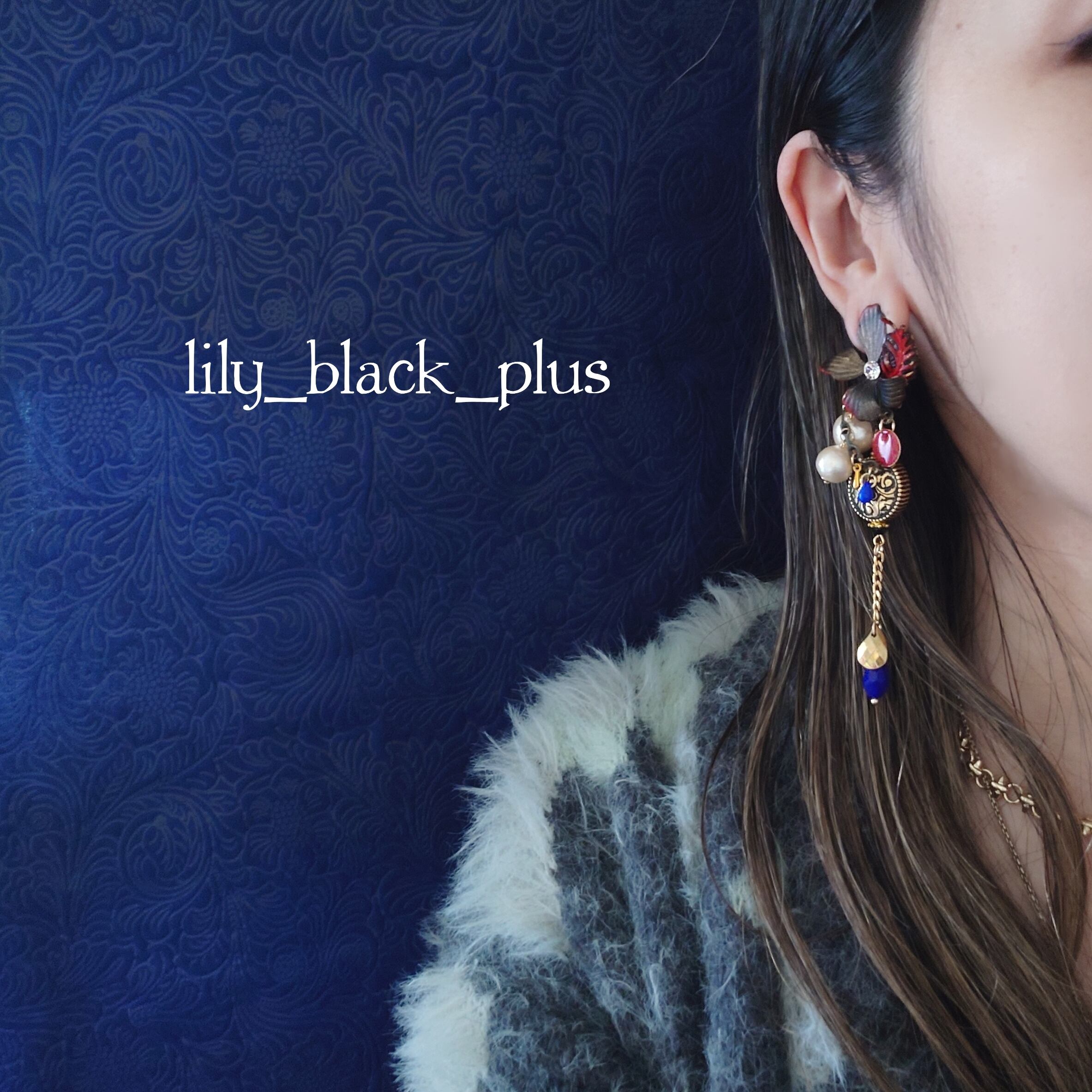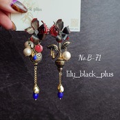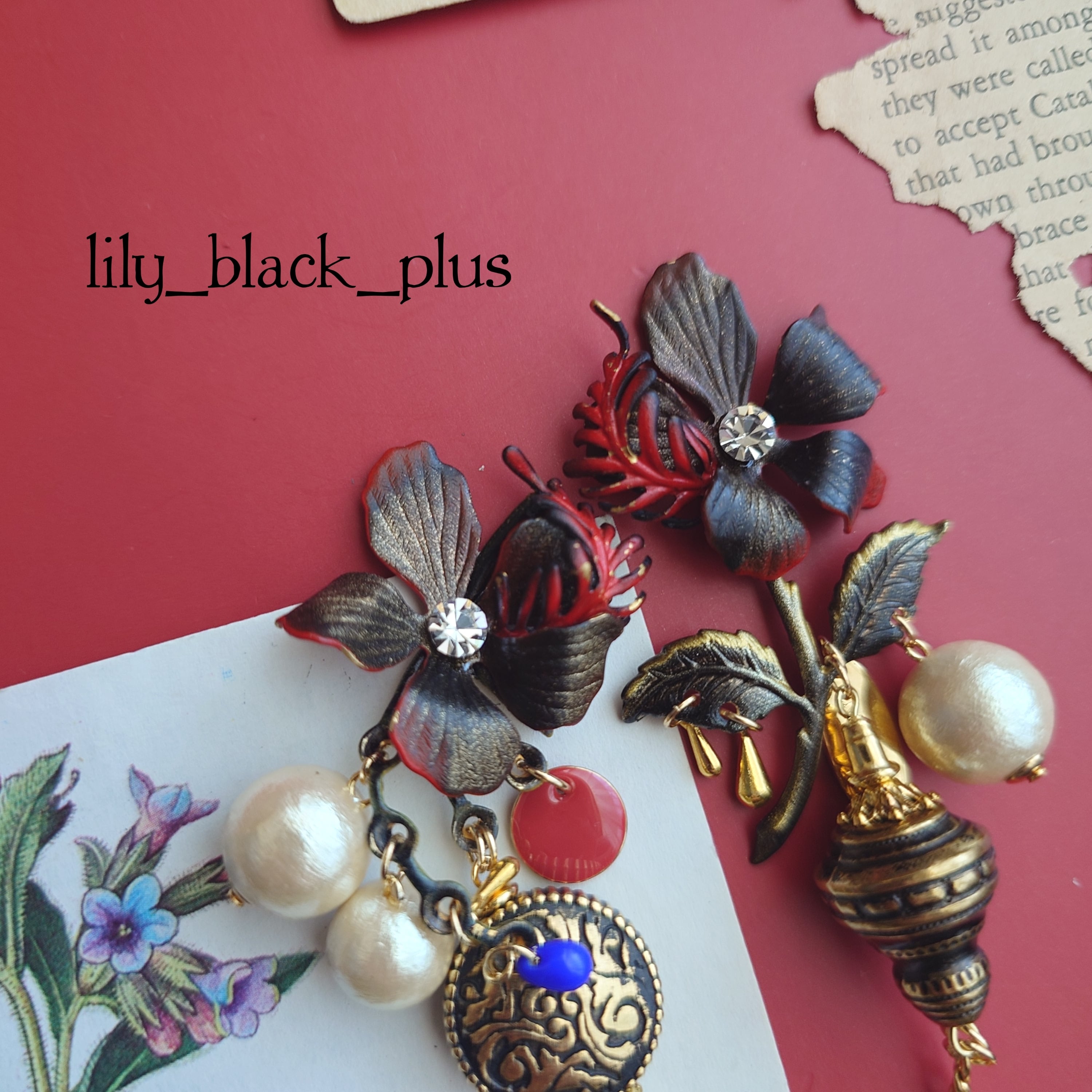 ブラックにペイントした真鍮フラワーに巻き付くように真鍮リーフを組み合わせ、コットンパールやヴィンテージビーズ、チェーンとブルーのビーズを合わせたアクセサリーです。