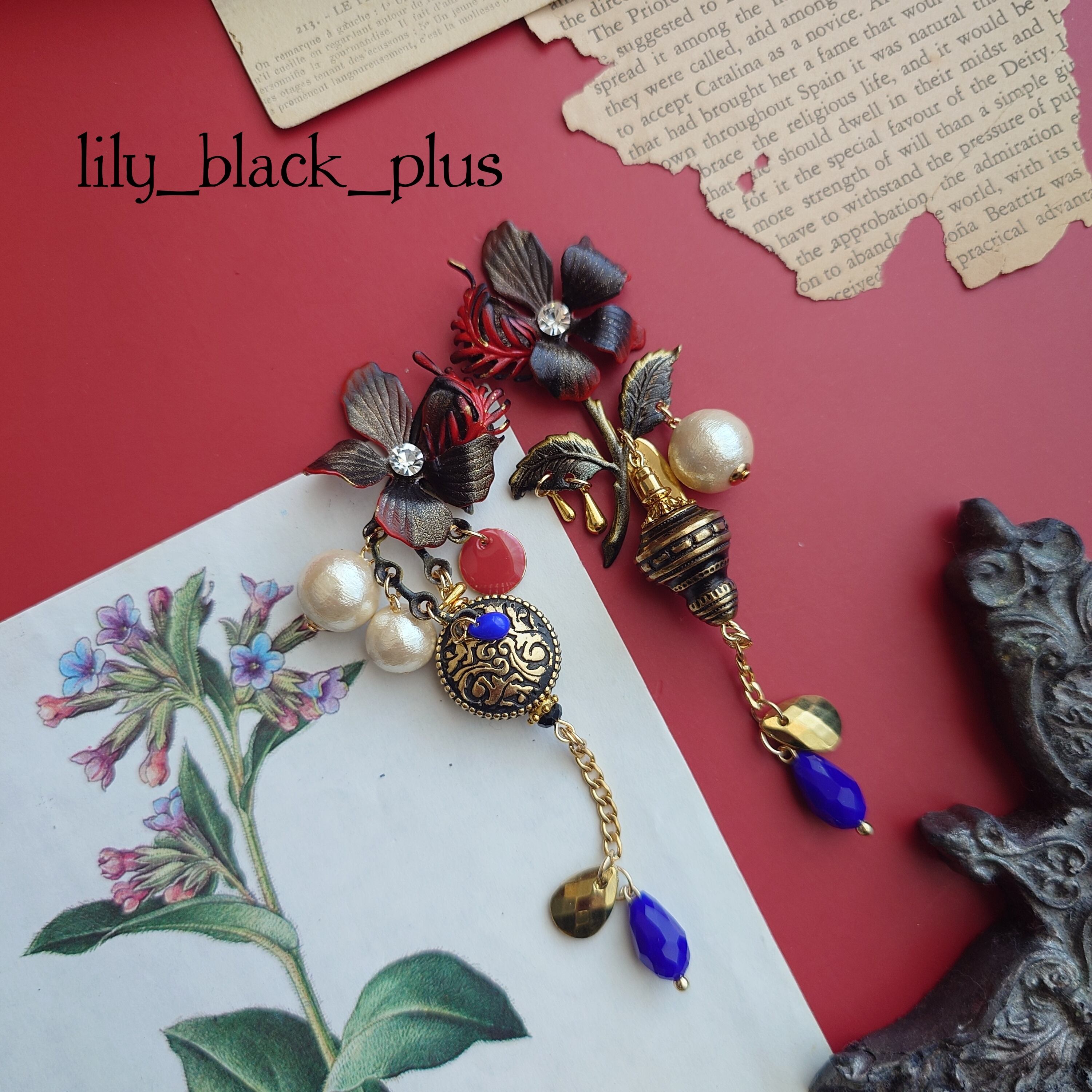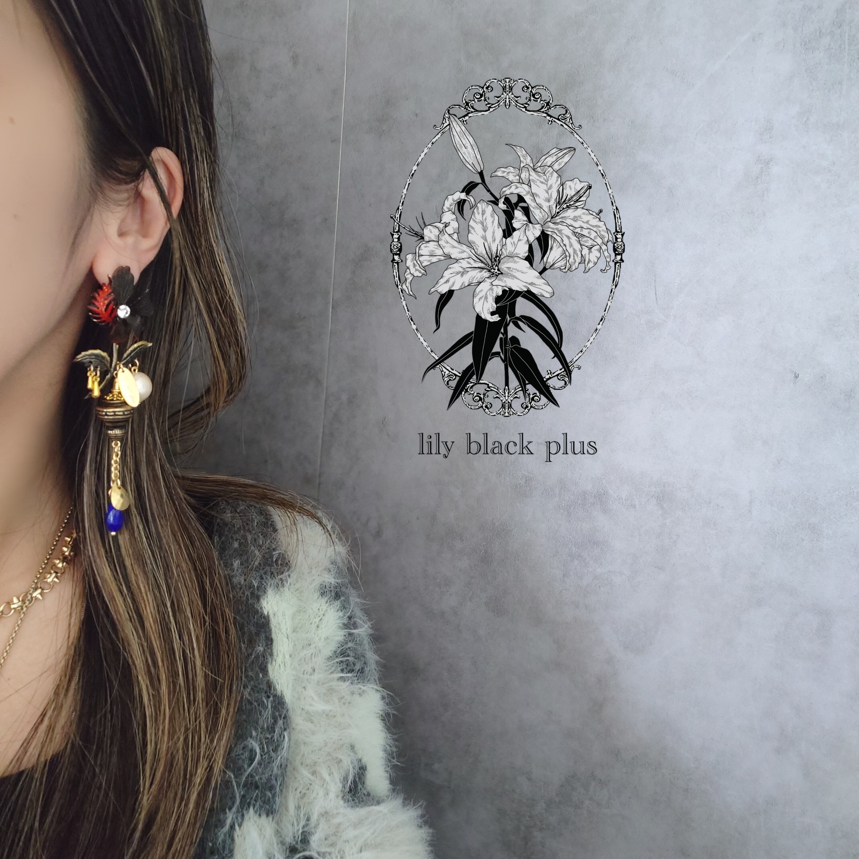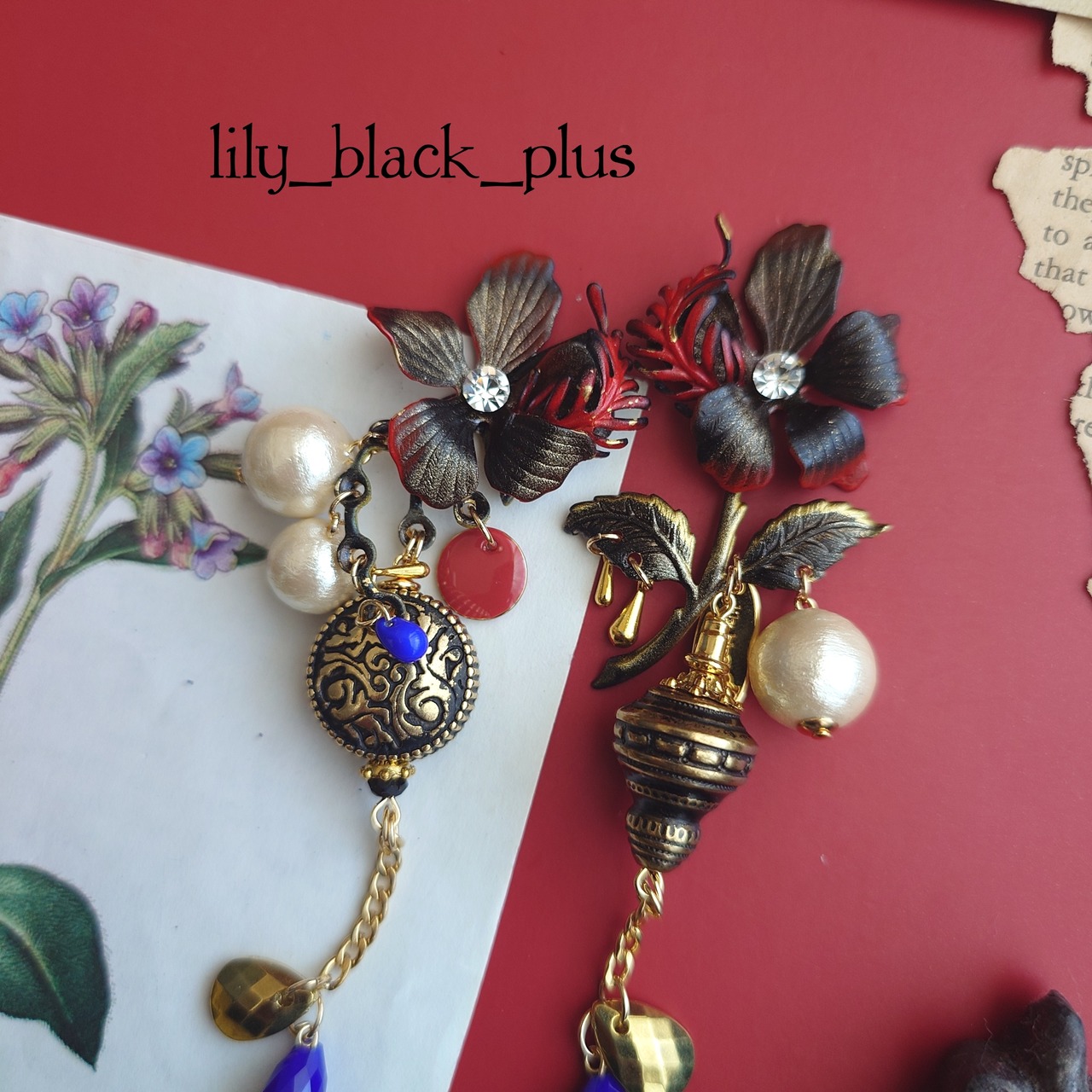 ブラックにペイントした真鍮フラワーに巻き付くように真鍮リーフを組み合わせ、コットンパールやヴィンテージビーズ、チェーンとブルーのビーズを合わせたアクセサリーです。
