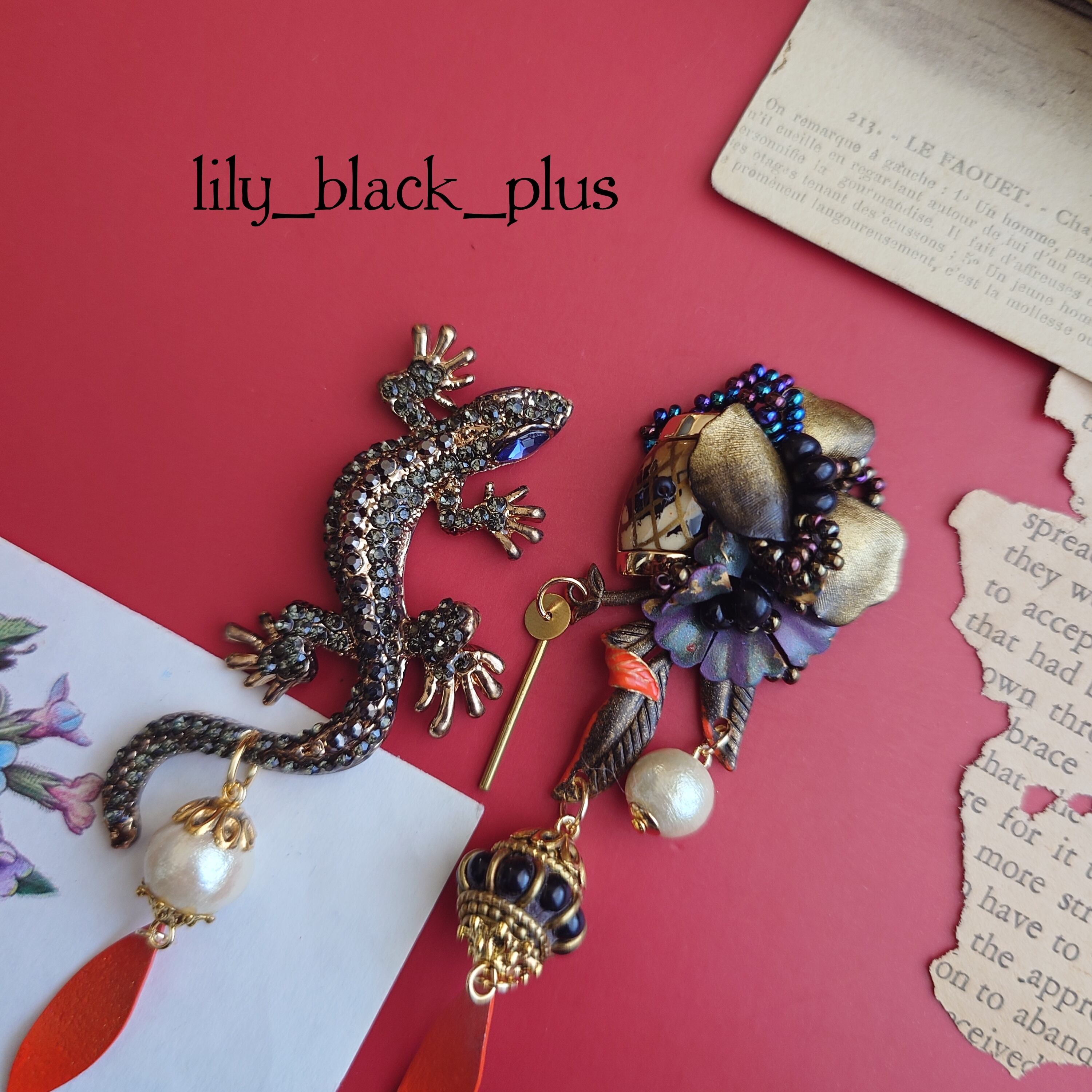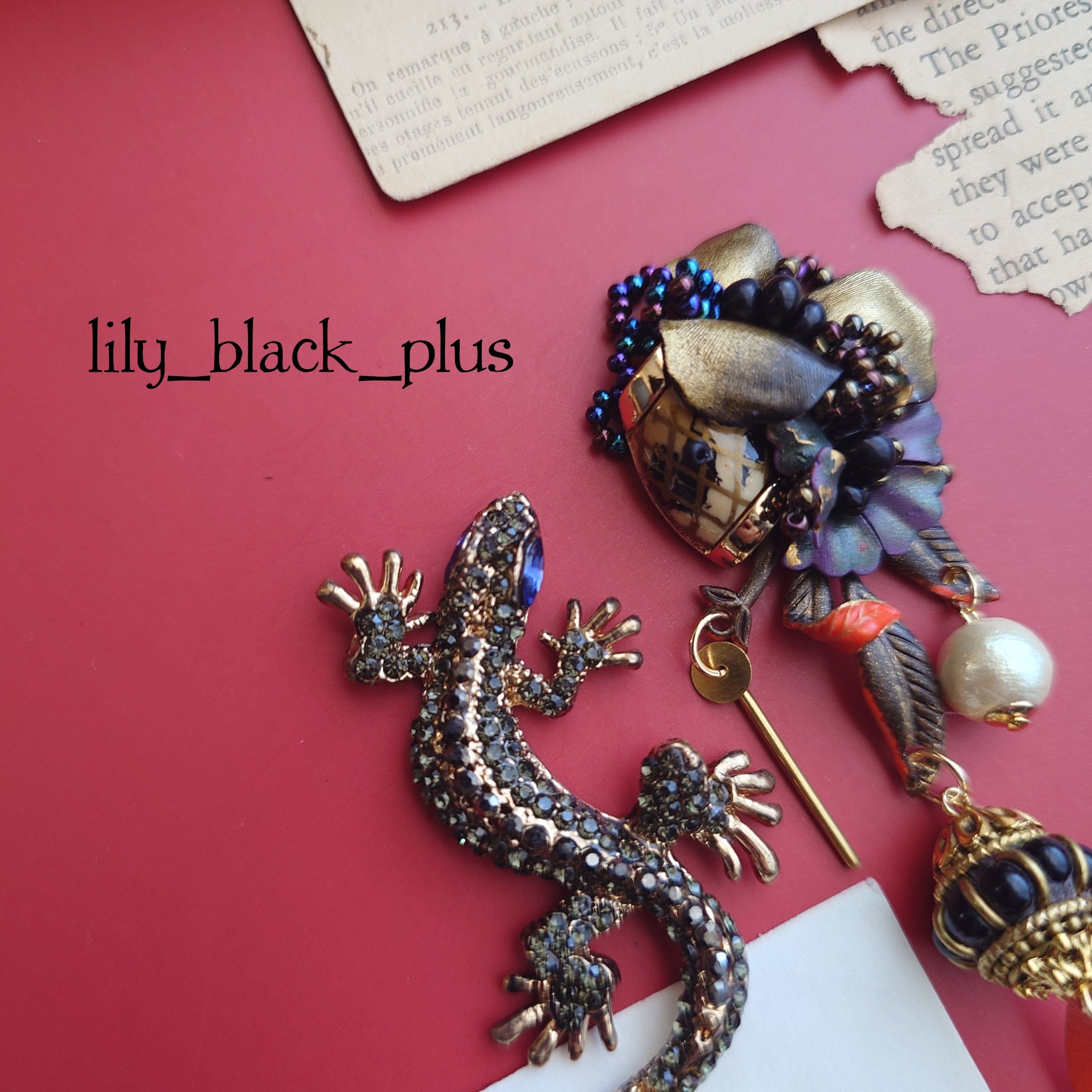 反対側にはキラキラの付いたトカゲにコットンパールとチャームを合わせたアクセサリーです。