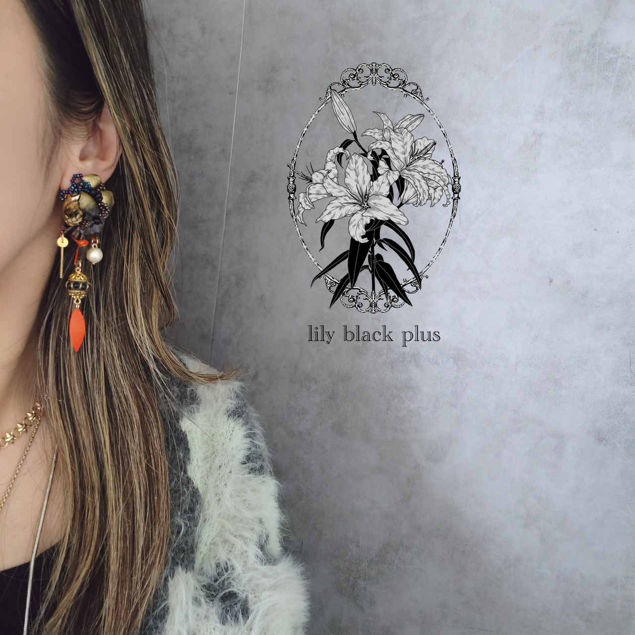 右側にはボタンやペイントした真鍮フラワーを組み合わせ、下側にはコットンパールとビーズ、オレンジにペイントした真鍮チャームを合わせました。