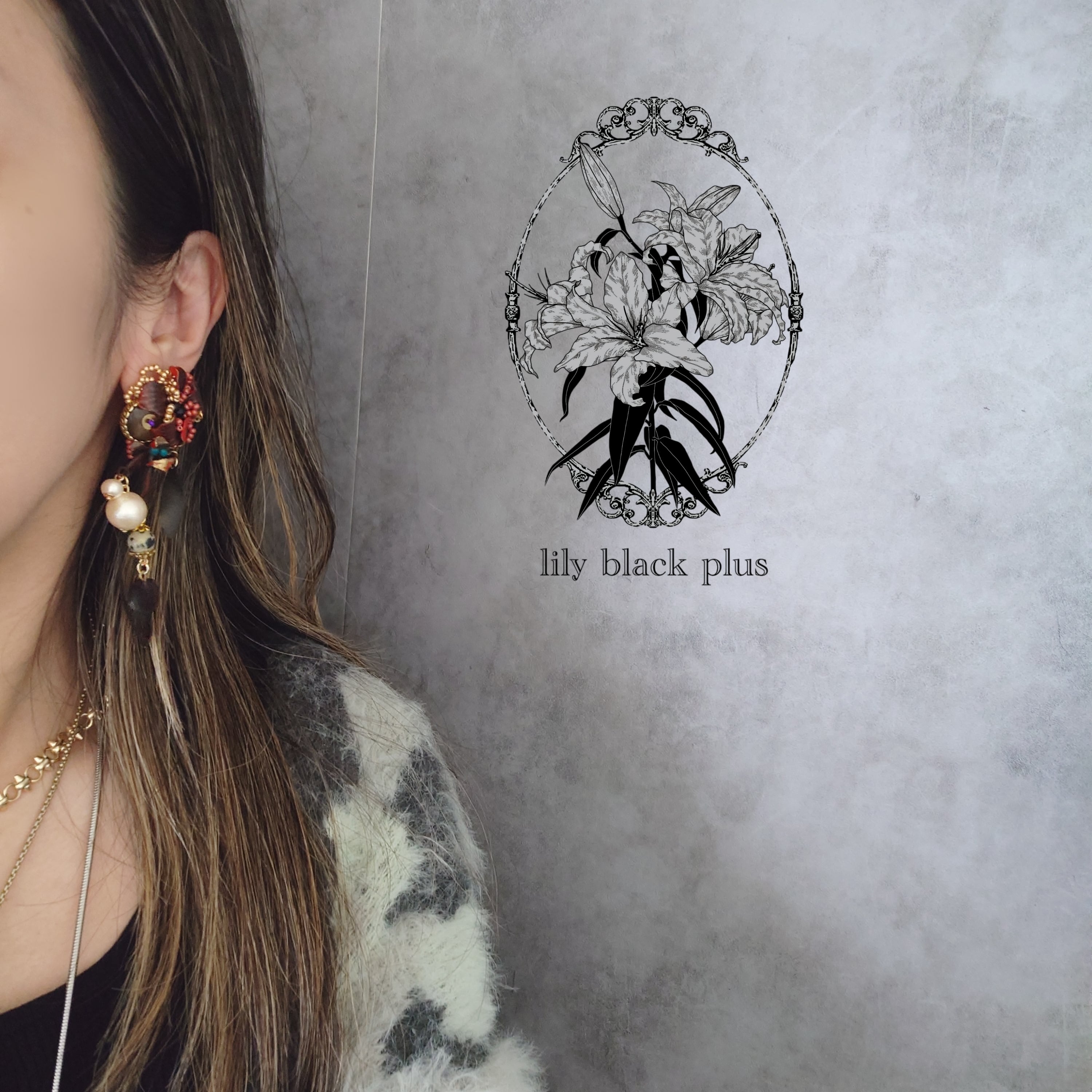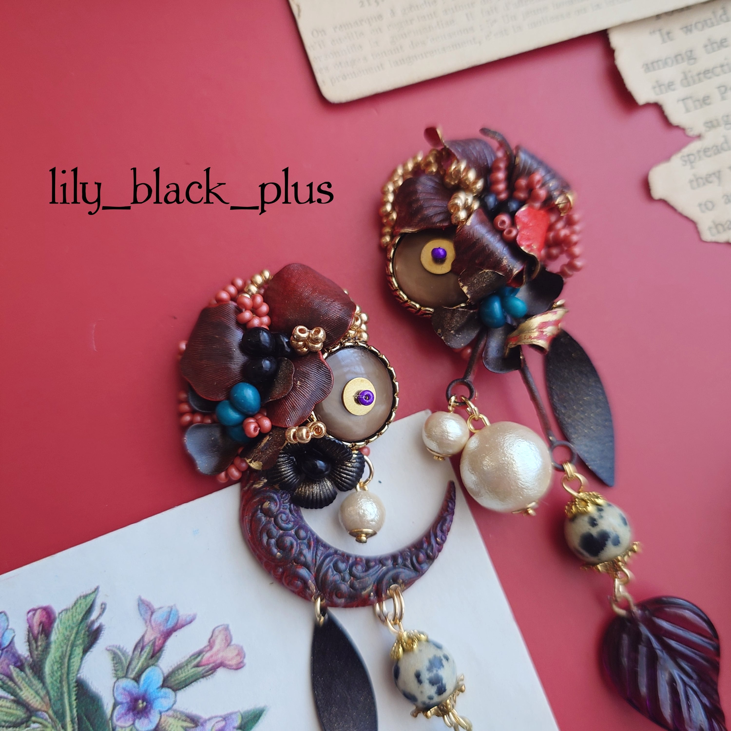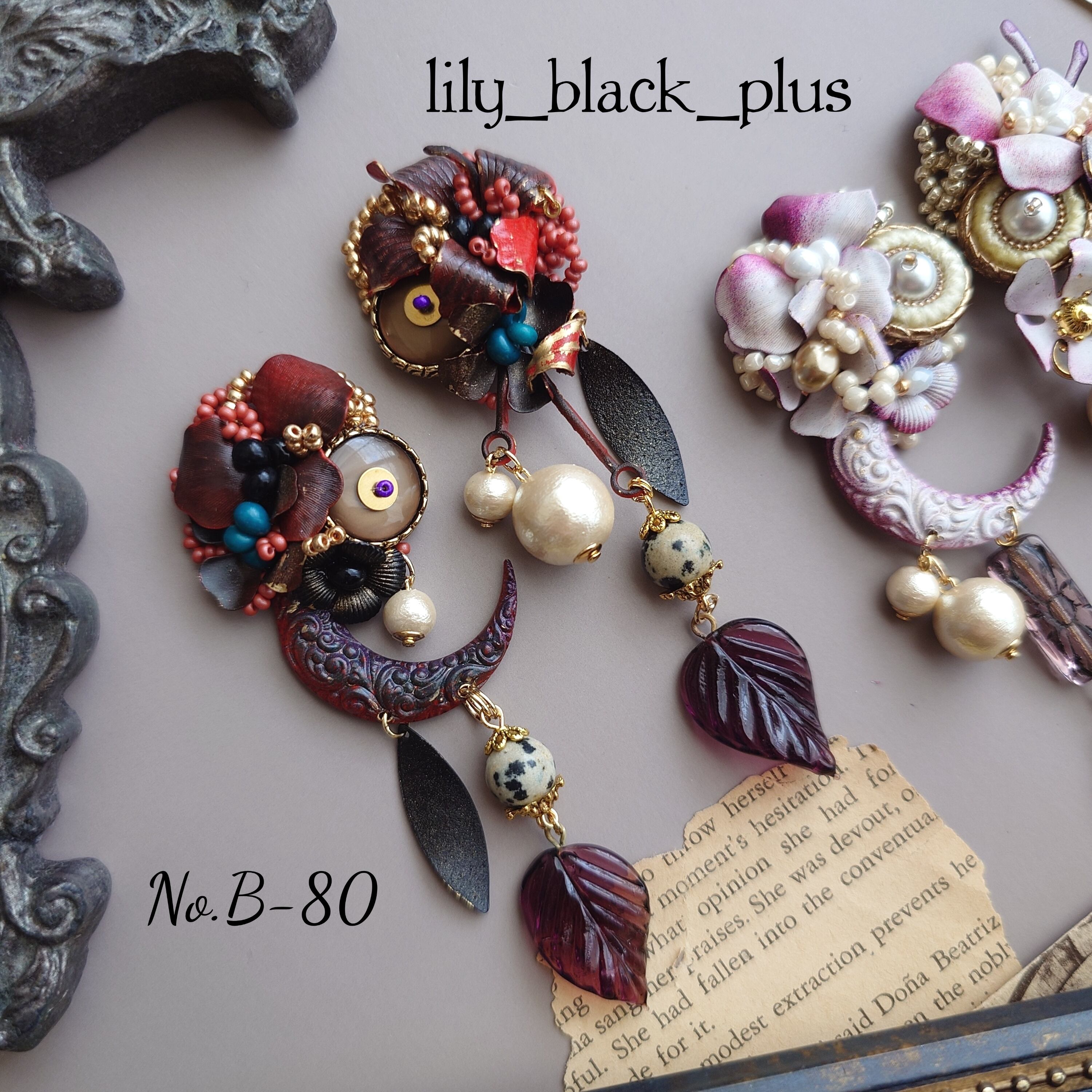 下側にはダルメシアンジャスパーとヴィンテージのガラスリーフチャーム、ブラックにペイントした真鍮チャームを合わせたアクセサリーです。