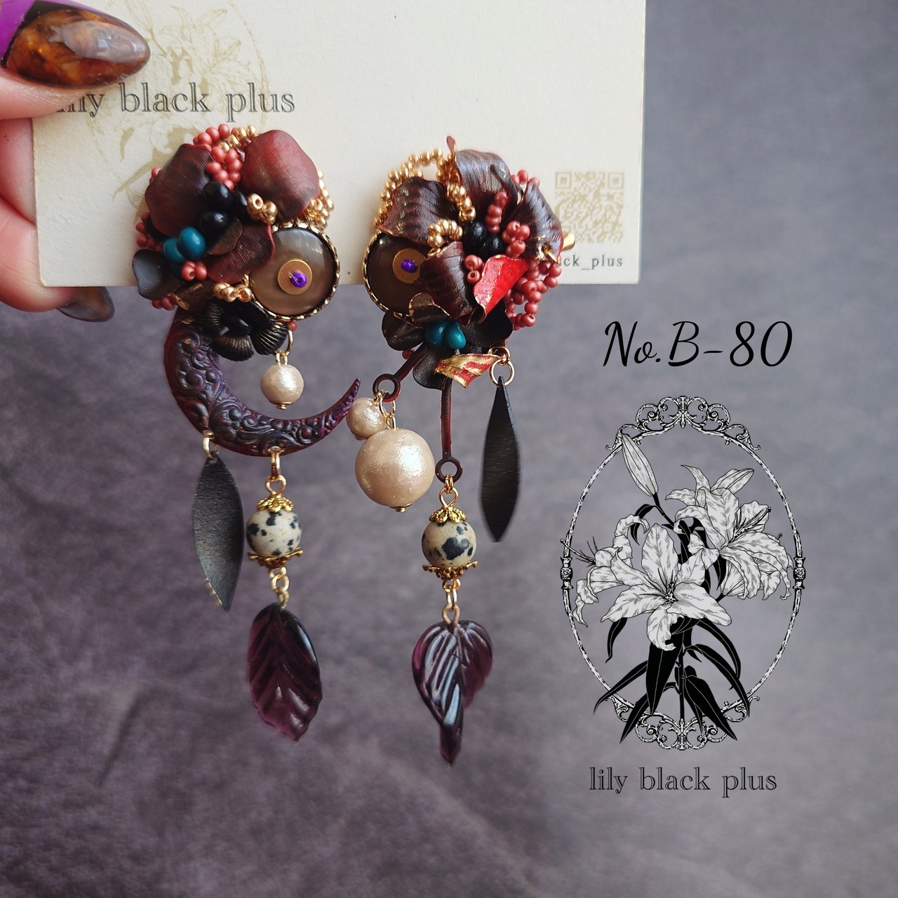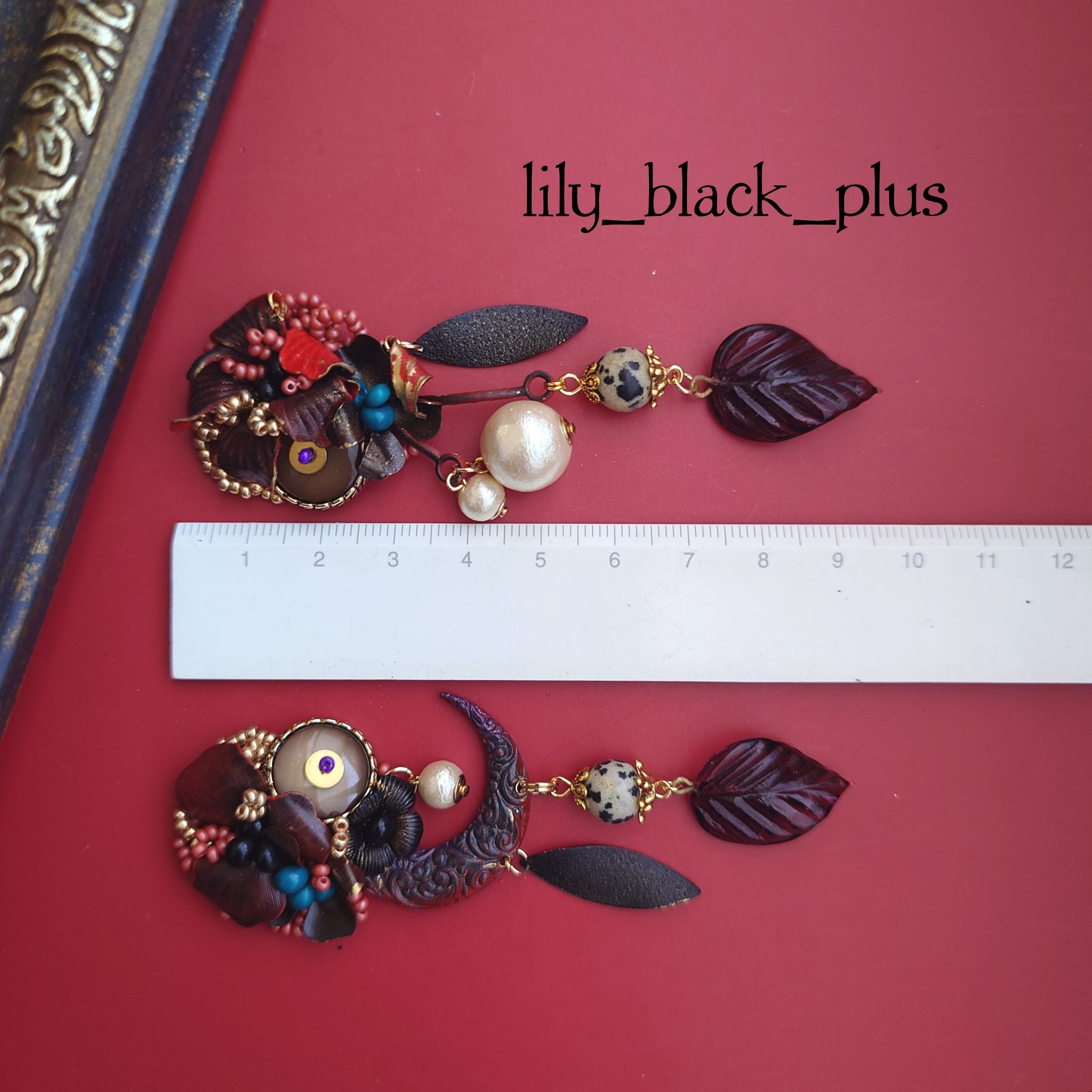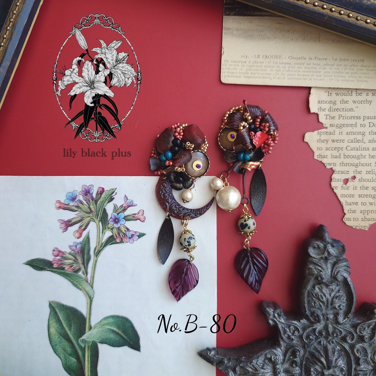 下側にはダルメシアンジャスパーとヴィンテージのガラスリーフチャーム、ブラックにペイントした真鍮チャームを合わせたアクセサリーです。