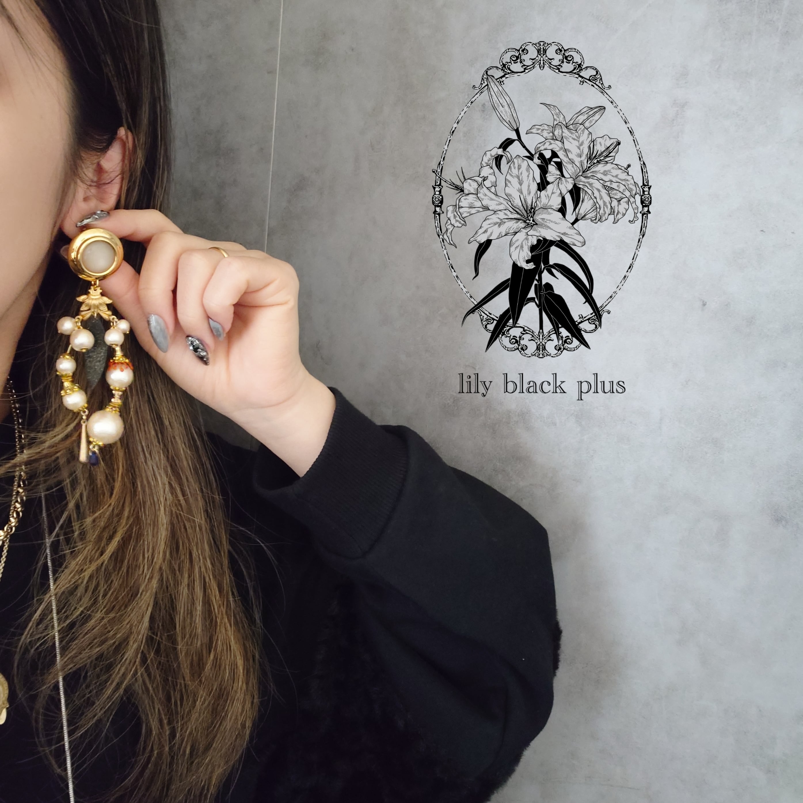 厚みのあるボタンをトップに真鍮チャームの2連に重なるようコットンパールを合わせて曲げたデザインのアクセサリーです。中央にはブラックにペイントした真鍮チャームを合わせました。