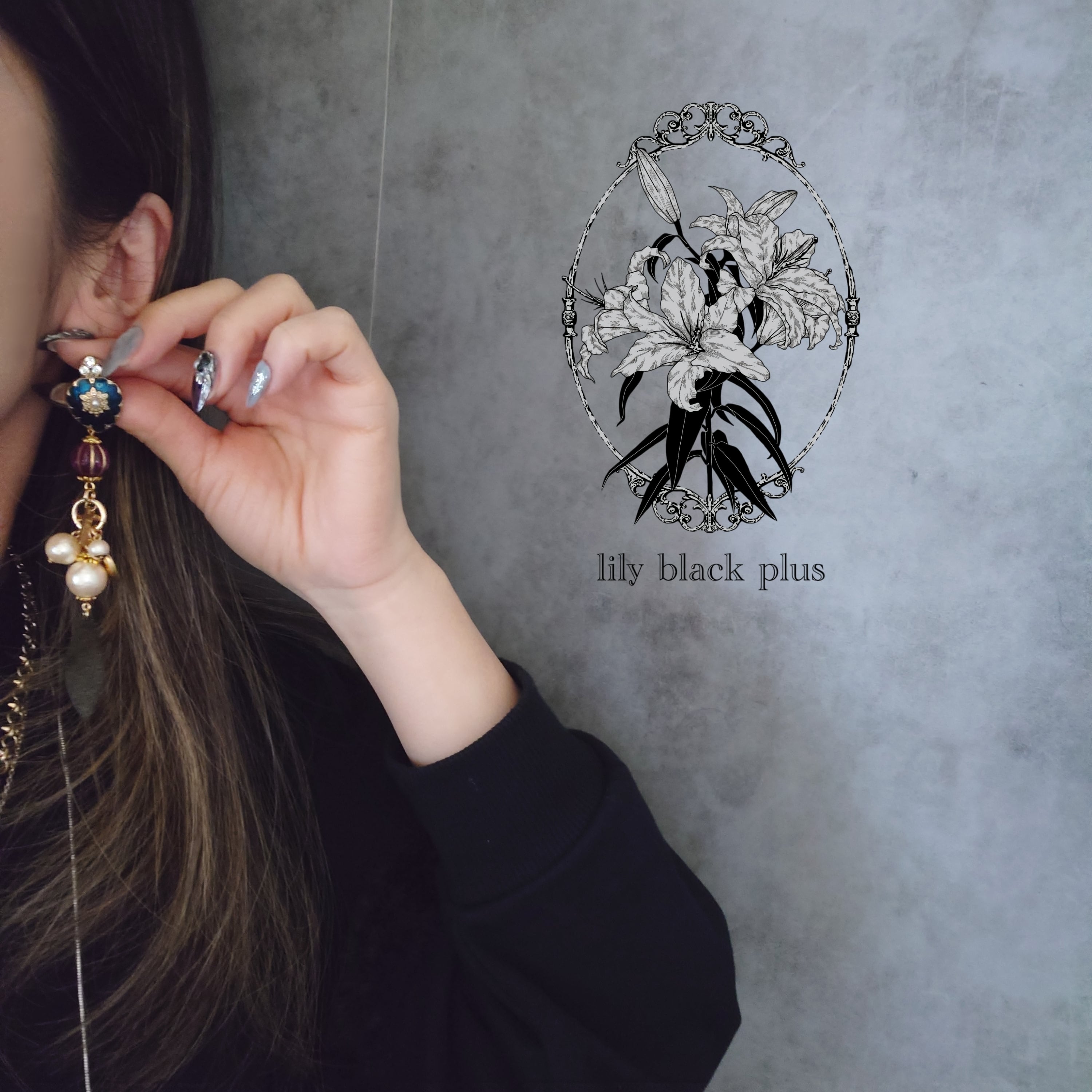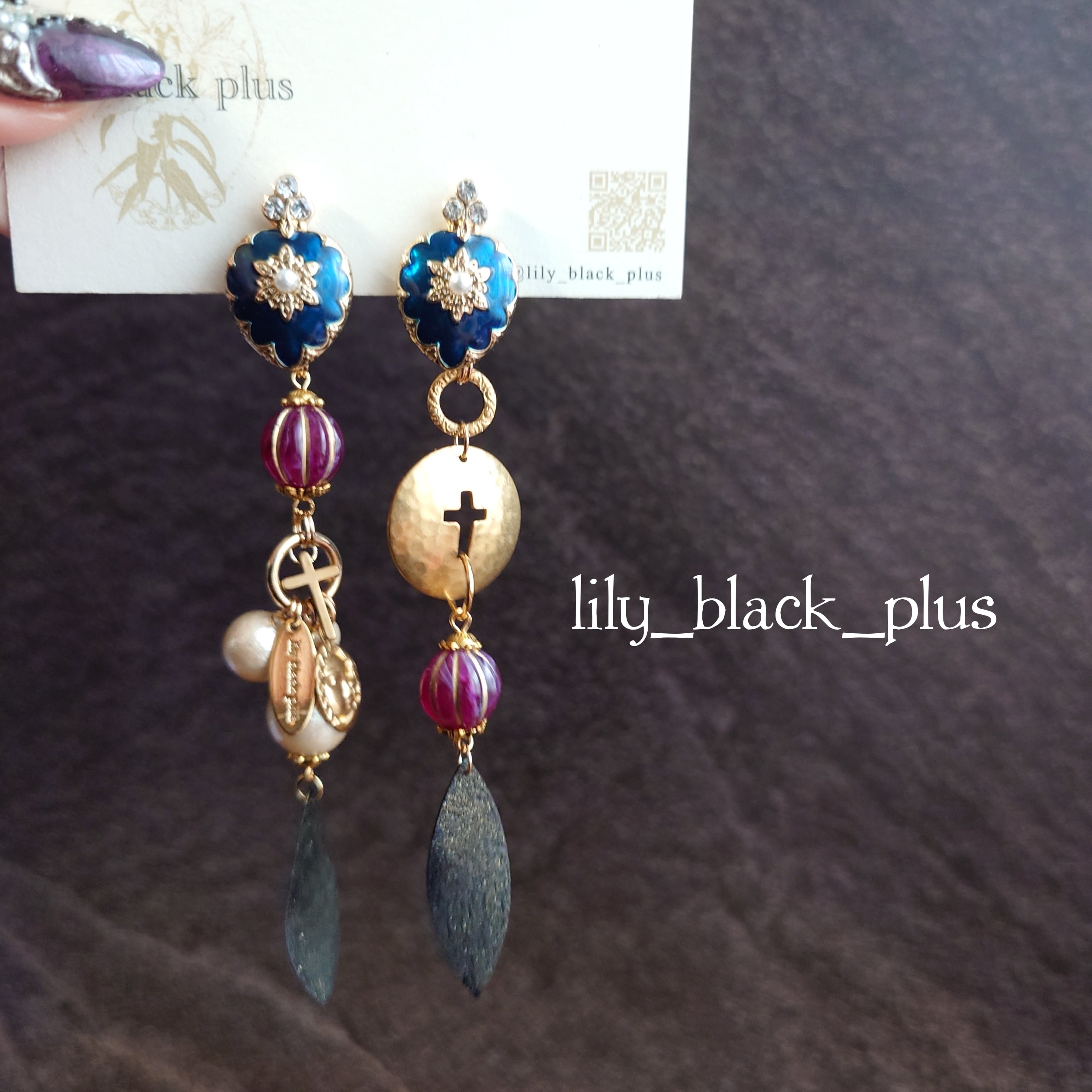 小さなブルーをトップに十字架にくり抜かれた真鍮プレートにパープルビーズ、ブラックにペイントした真鍮チャームを合わせ、反対側には太陽と月の真鍮チャームと十字架、コットンパールを合わせたアシンメトリーデザインです。