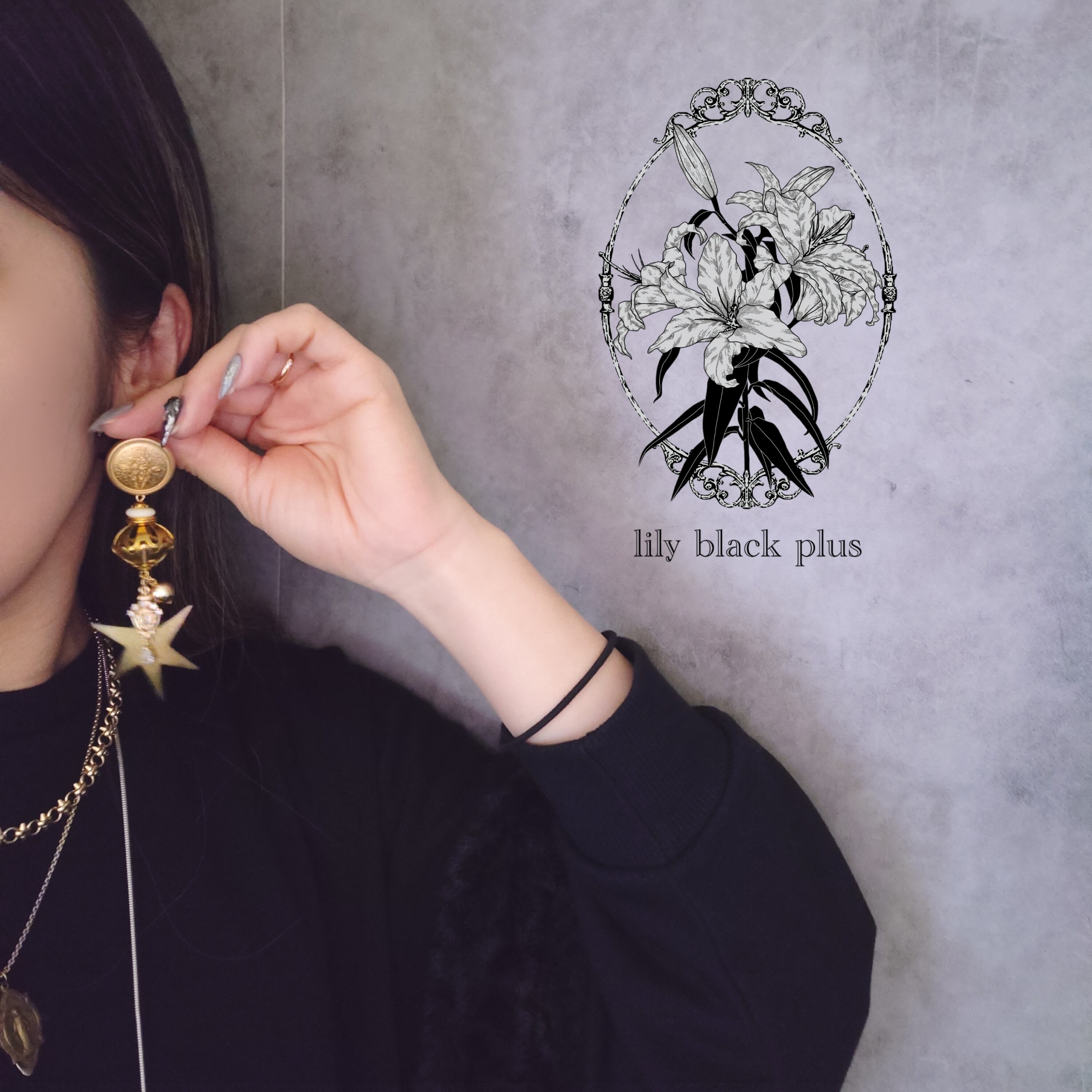 マットなゴールドのメタルボタンをトップに大きめで立体感のあるヴィンテージのゴールドビーズを合わせ、ゴールドにペイントした大きな星型の真鍮チャームを合わせたアクセサリーです。