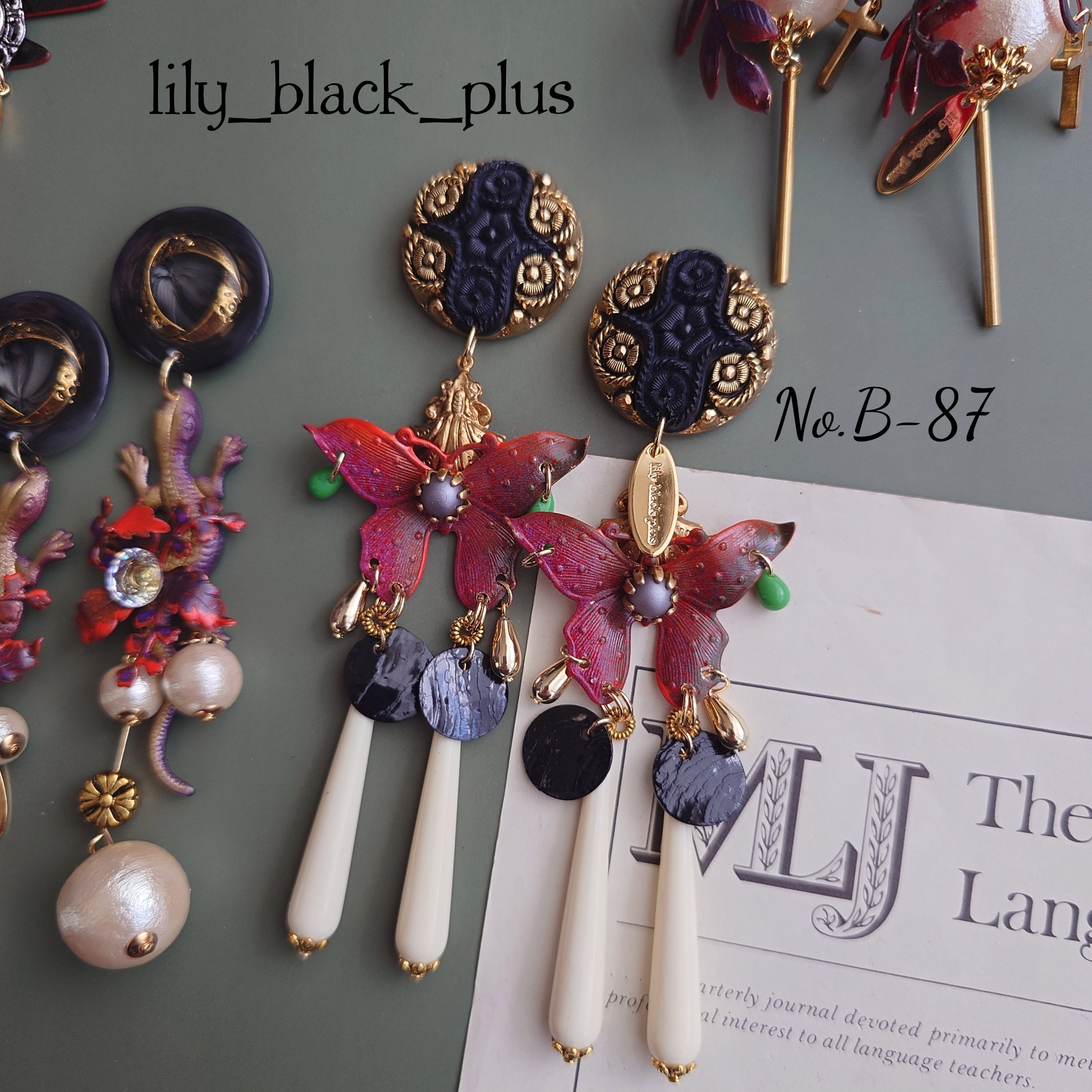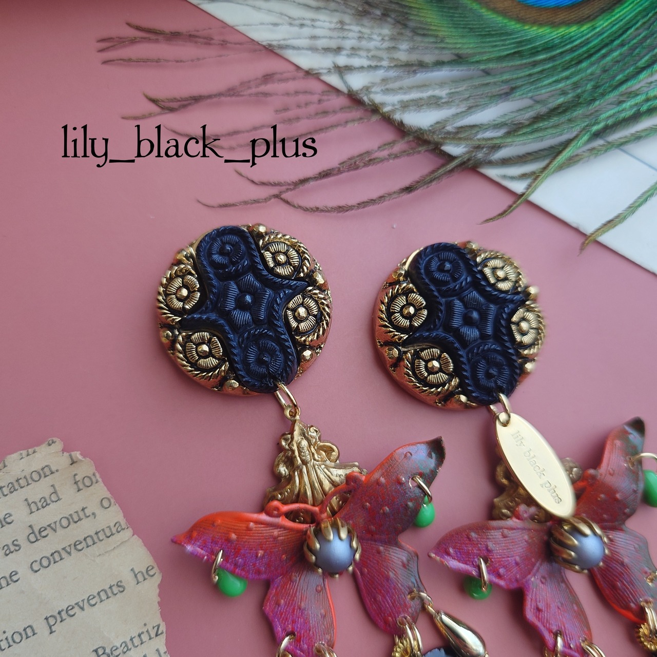 ブラックのボタンをトップにヴィンテージの真鍮チャームとパープルにペイントした蝶々の真鍮を組み合わせ、シェルプレートとクリームカラーのビーズを合わせたアクセサリーです。