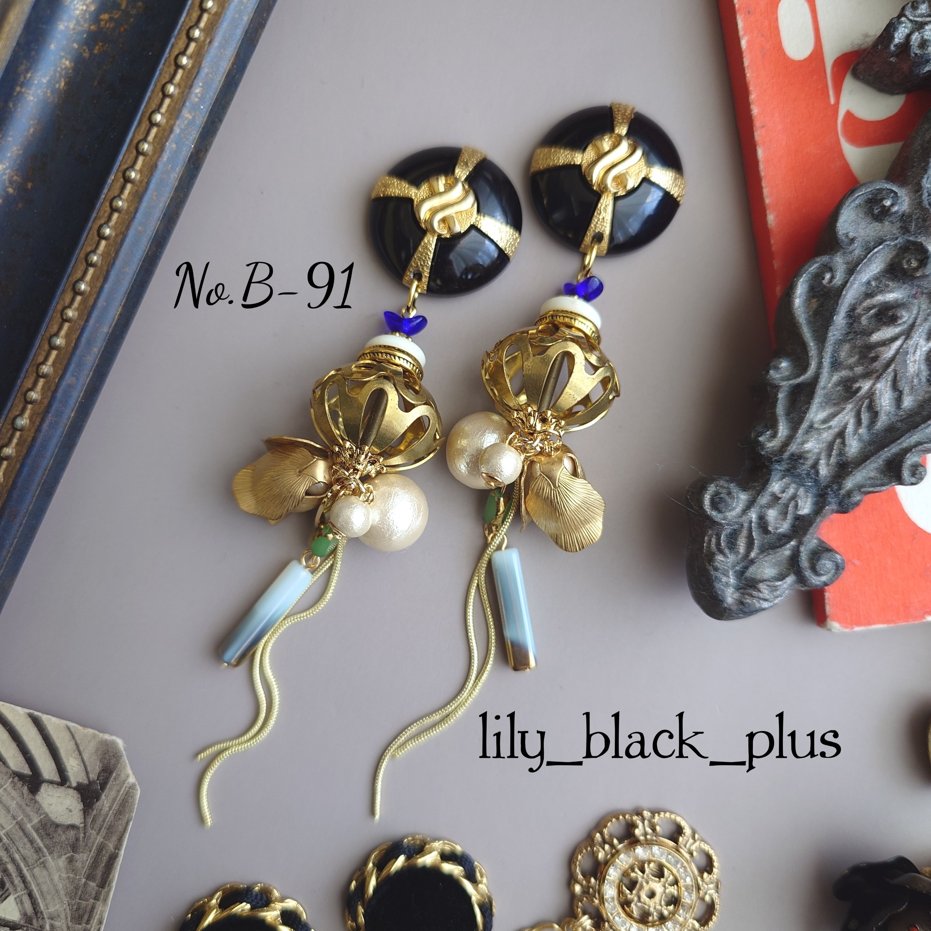 ボタンをトップに立体的なヴィンテージの真鍮ビーズとつぼみ真鍮、ガラスビーズを合わせたアクセサリーです。