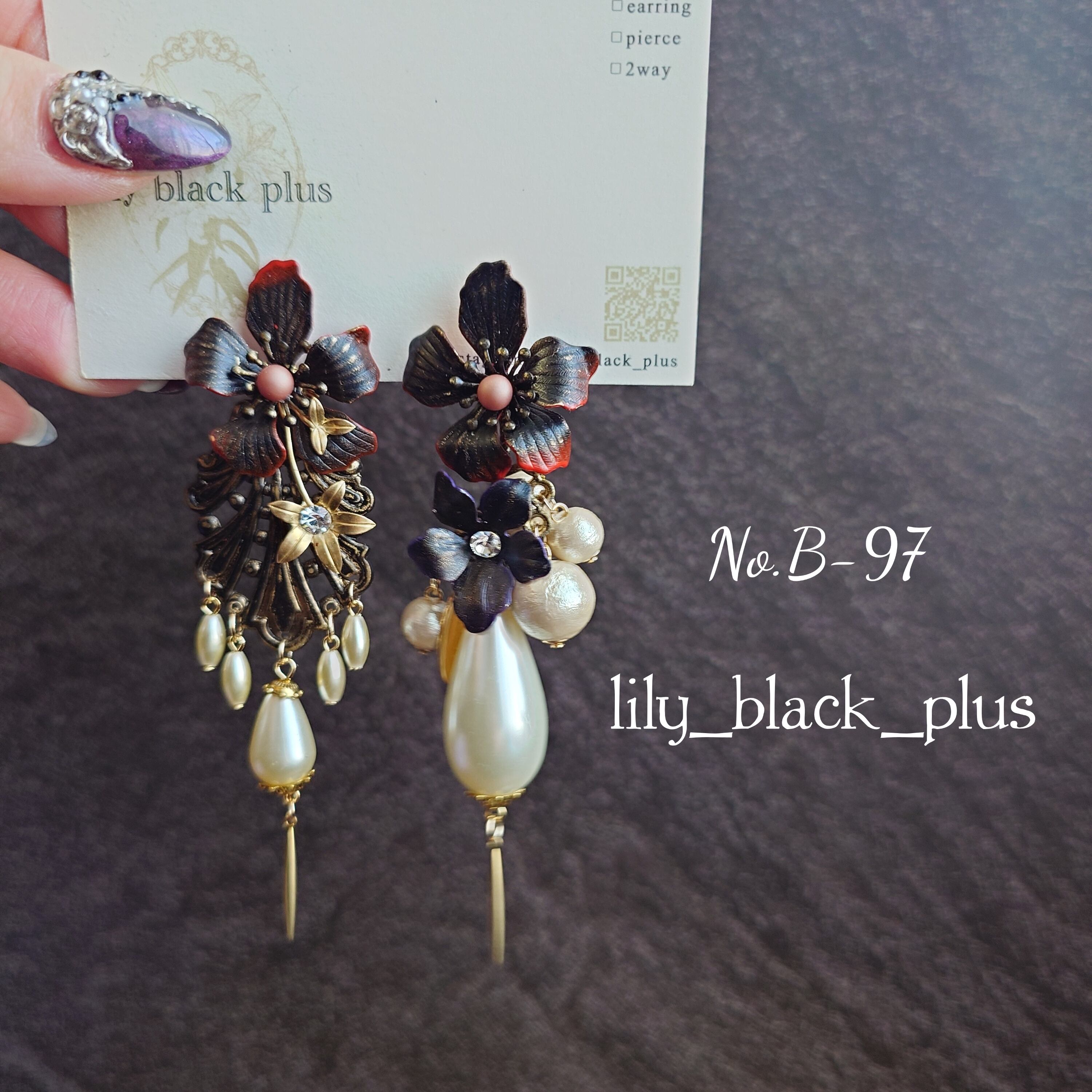 ブラックにペイントした真鍮フラワーと大きめのチャームを組み合わせ、反対側にもお花の真鍮を2枚組み合わせたものにコットンパールやパールビーズを合わせたアクセサリーです。