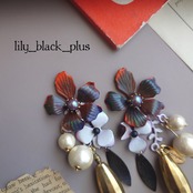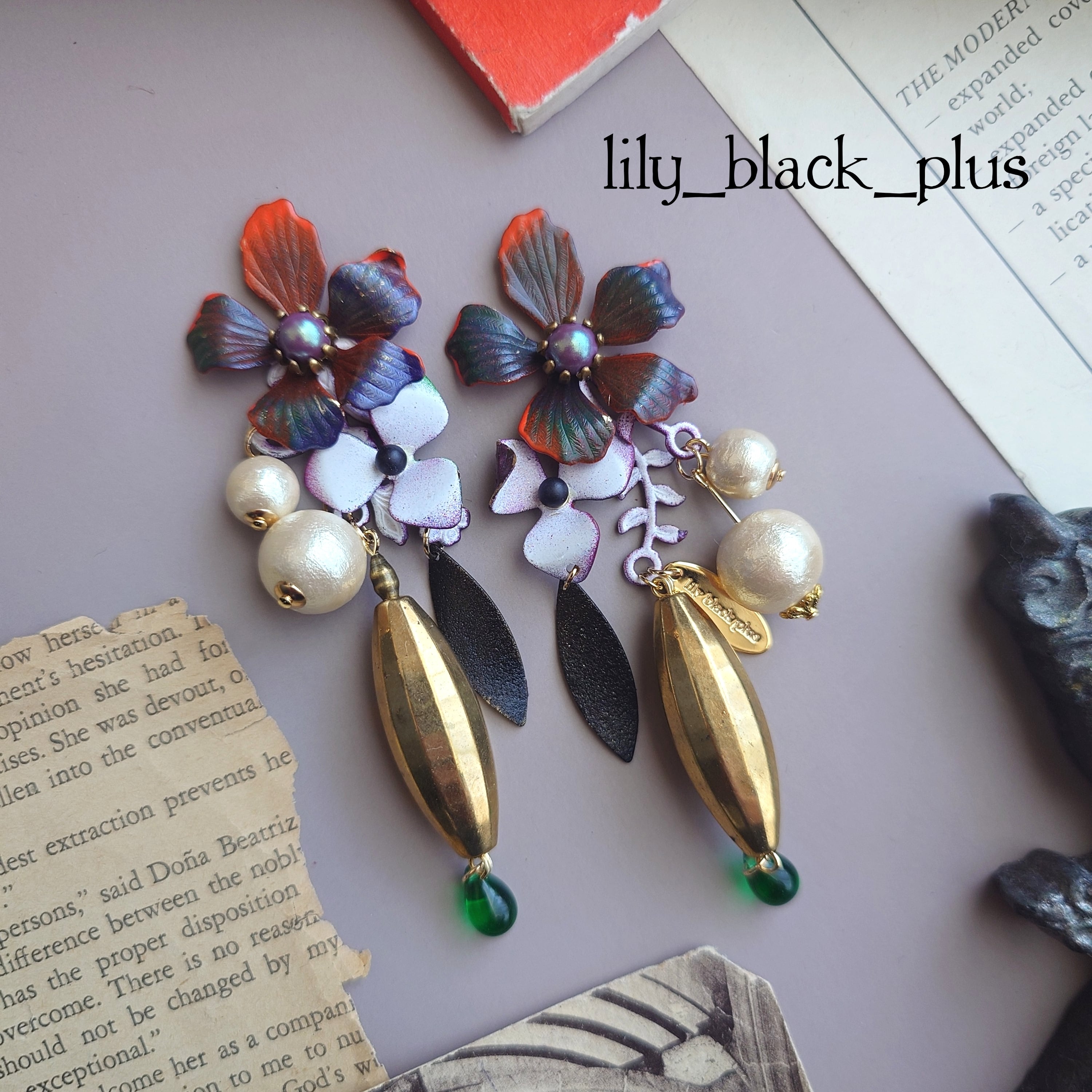 グリーンやネイビー、オレンジと混ざったこだわりのカラーにペイントした真鍮フラワーをトップにホワイトにペイントした真鍮フラワーを組み合わせ、ヴィンテージのゴールドビーズとブラックにペイントした真鍮チャームを合わせたアクセサリーです。