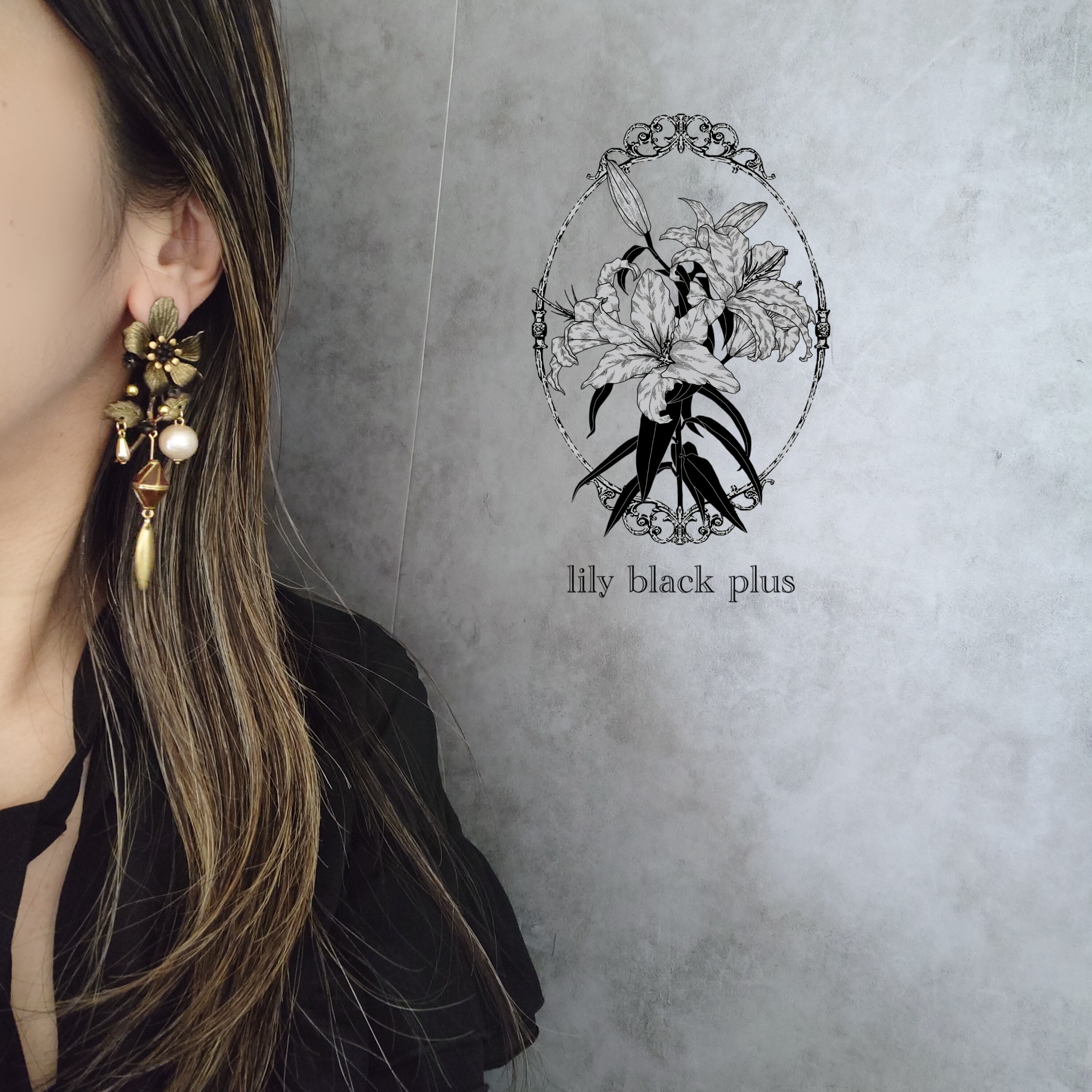 ゴールドブラックにペイントした真鍮フラワーをトップに真鍮チャームやリーフを組み合わせ、ブラウンのメタルビーズと真鍮チャームを合わせたアクセサリーです。