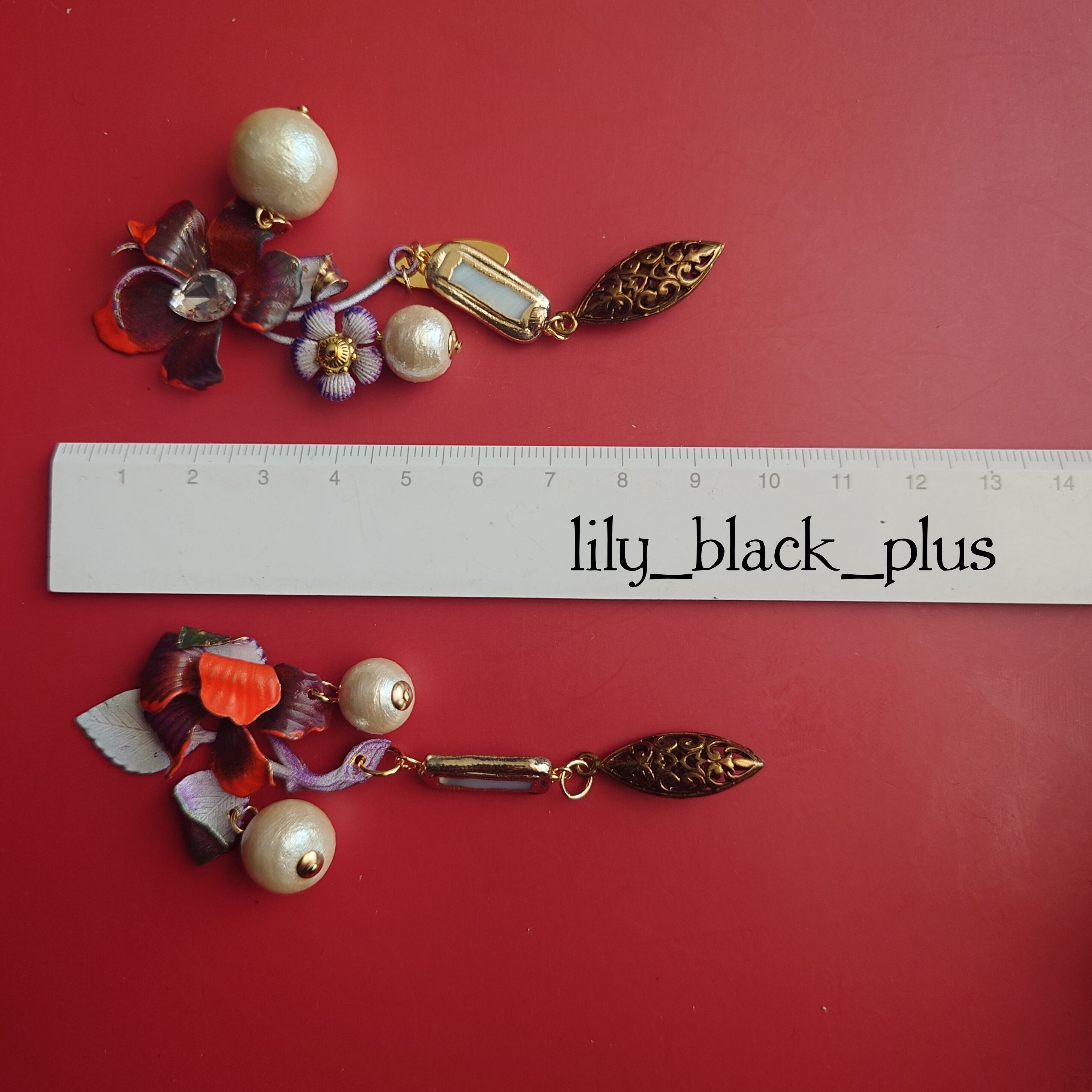 パープルオレンジにペイントした真鍮フラワーをトップに真鍮フラワーを合わせたトップに、反対側にはホワイトパープルにペイントした真鍮リーフに真鍮フラワーを組み合わせ、下側には淡水パールビーズとメタルチャームを合わせたアクセサリーです。