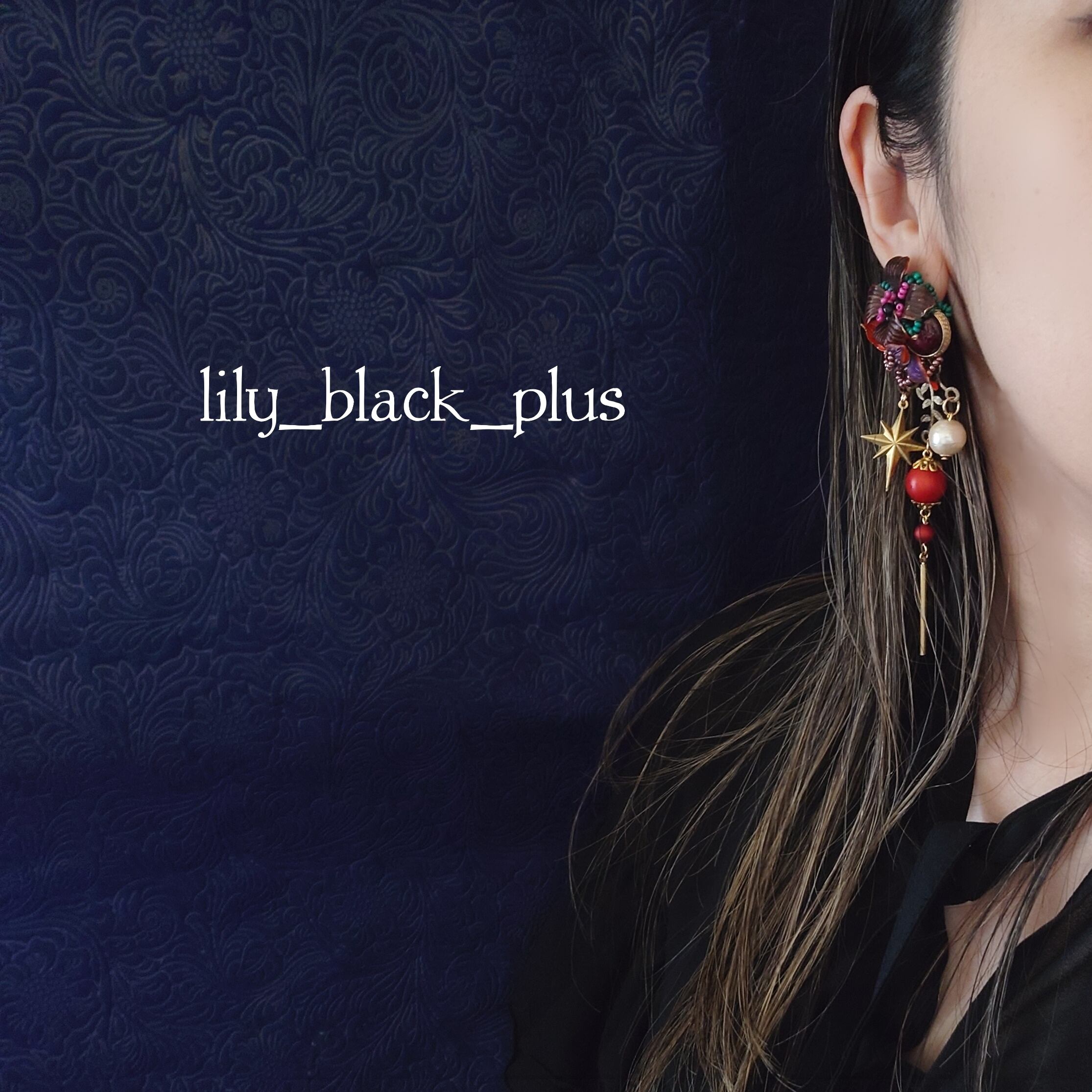 ボタンとペイントした真鍮とフラワーやビーズを編み込んだトップに、下側には真鍮チャームとマットな赤のヴィンテージビーズを合わせたアクセサリーです。