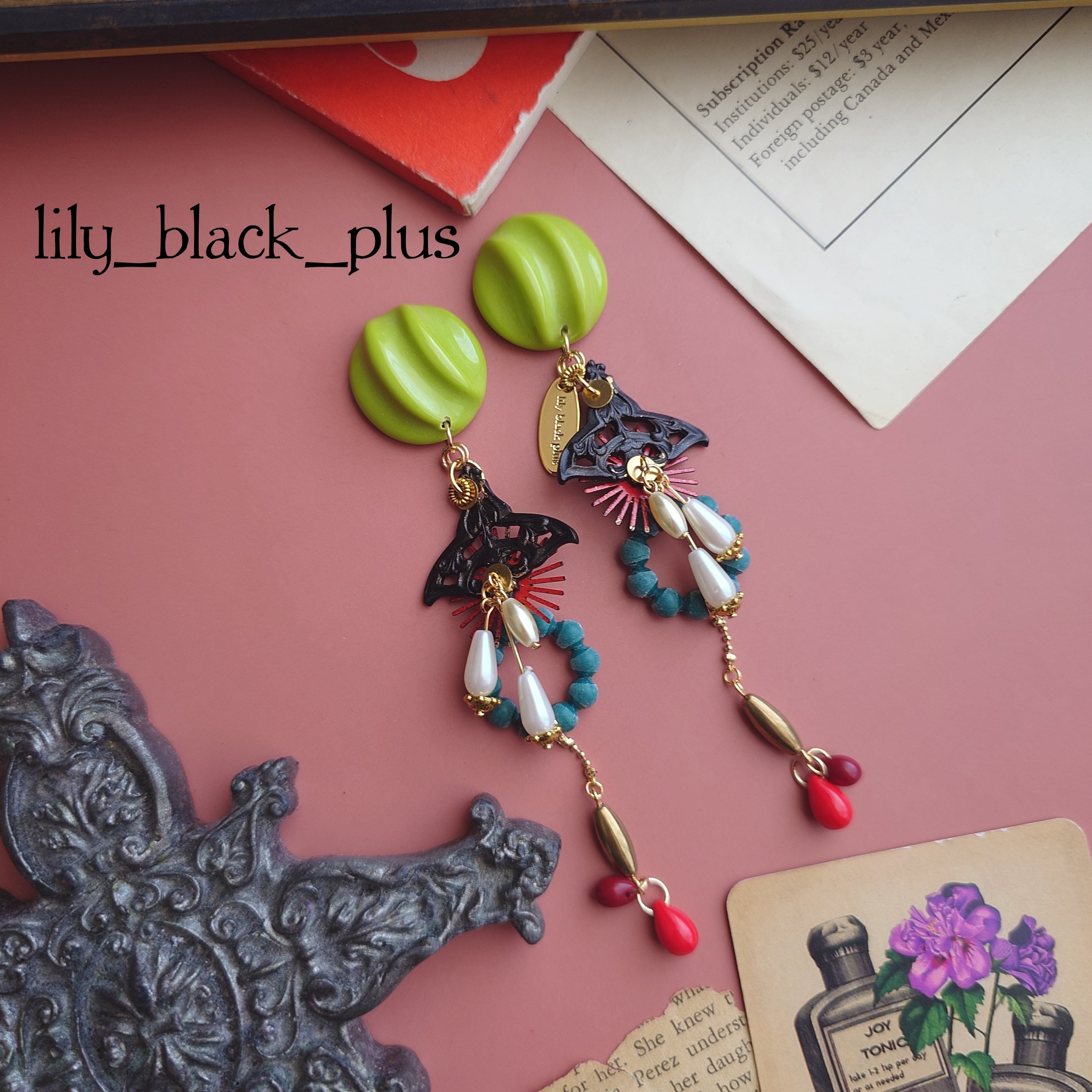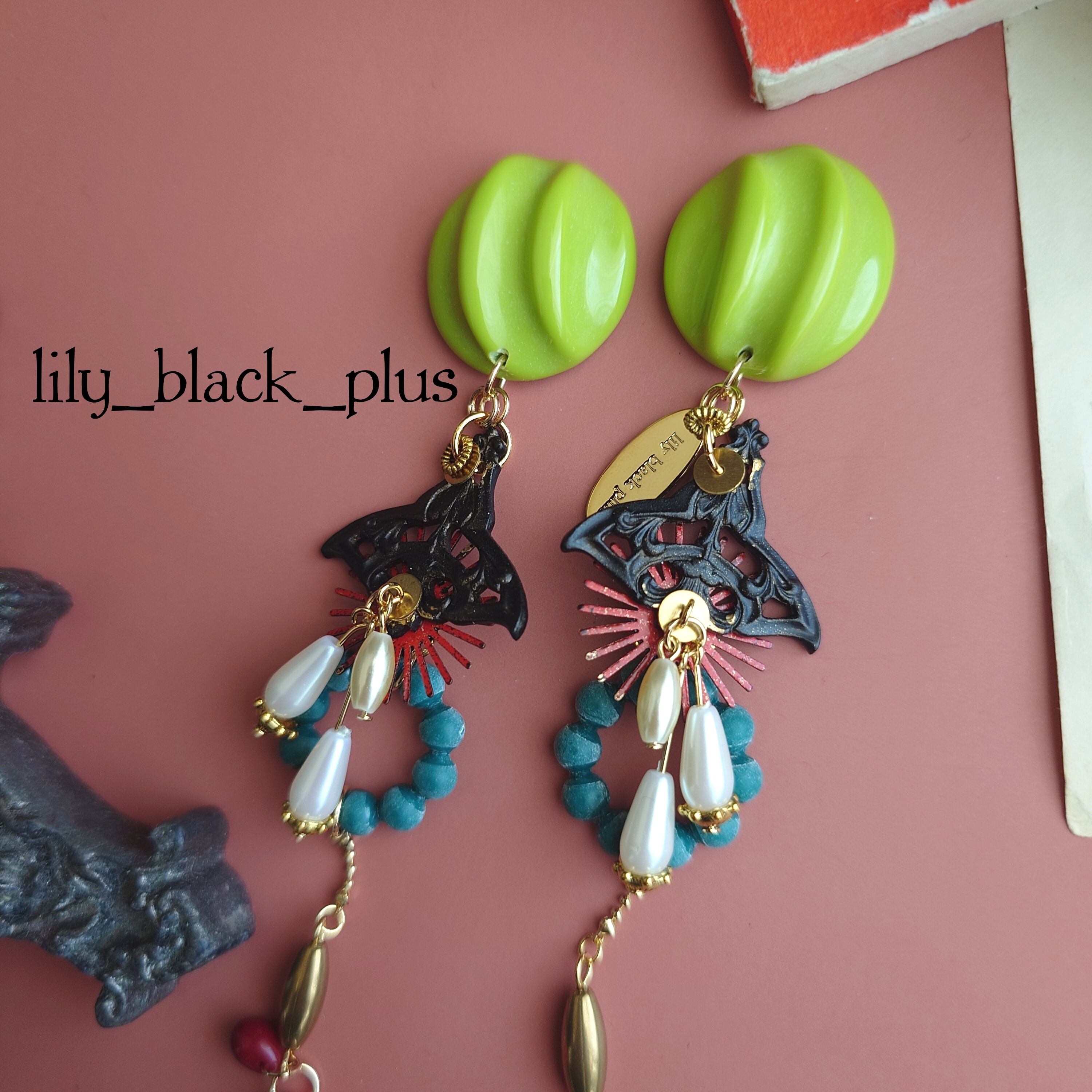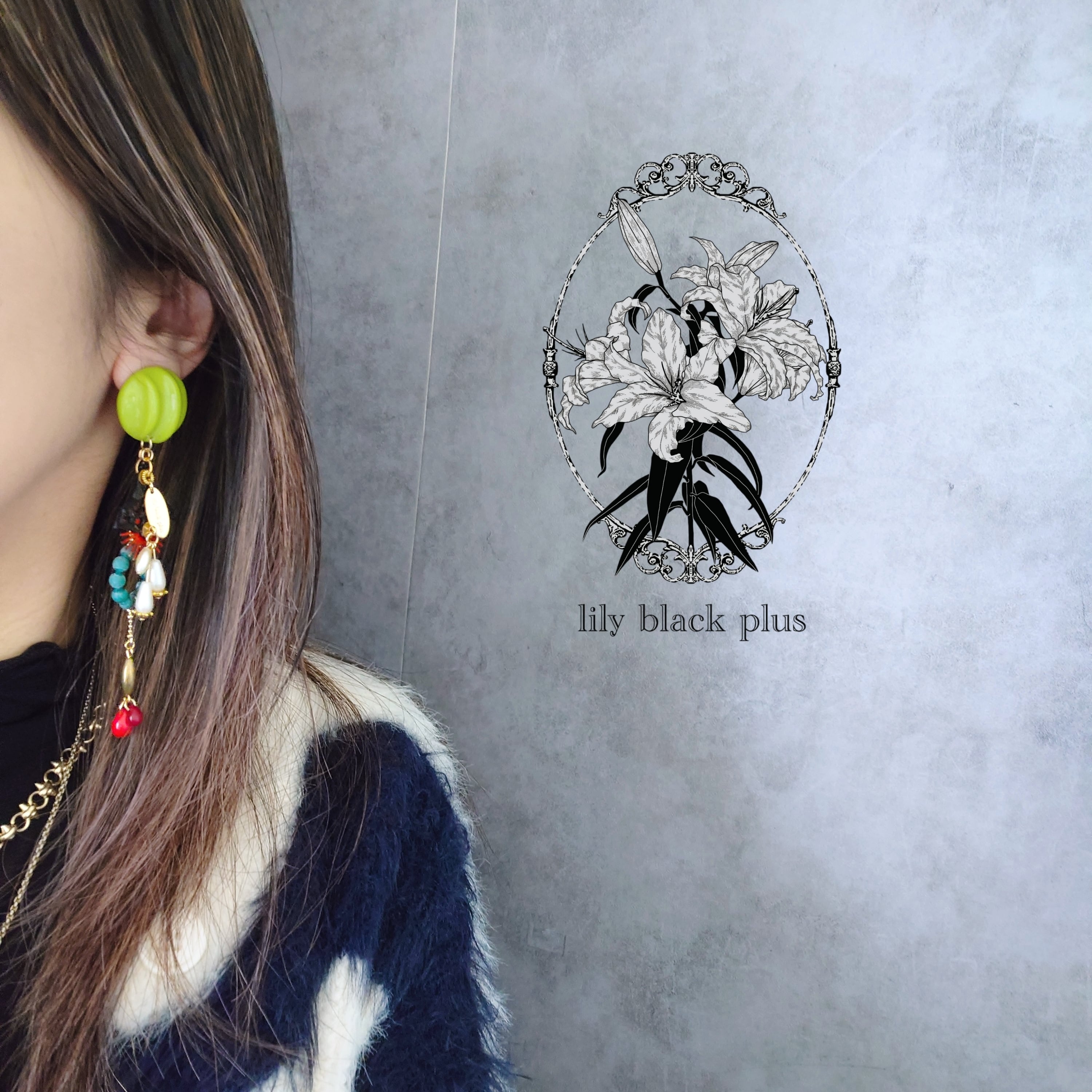 グリーンカラーのヴィンテージカボションをトップにマットブラックにペイントしたヴィンテージ真鍮チャームとオレンジにペイントした真鍮プレートを重ね、表にはパールビーズを、裏側からはヴィンテージリングが揺れるよう合わせたアクセサリーです。