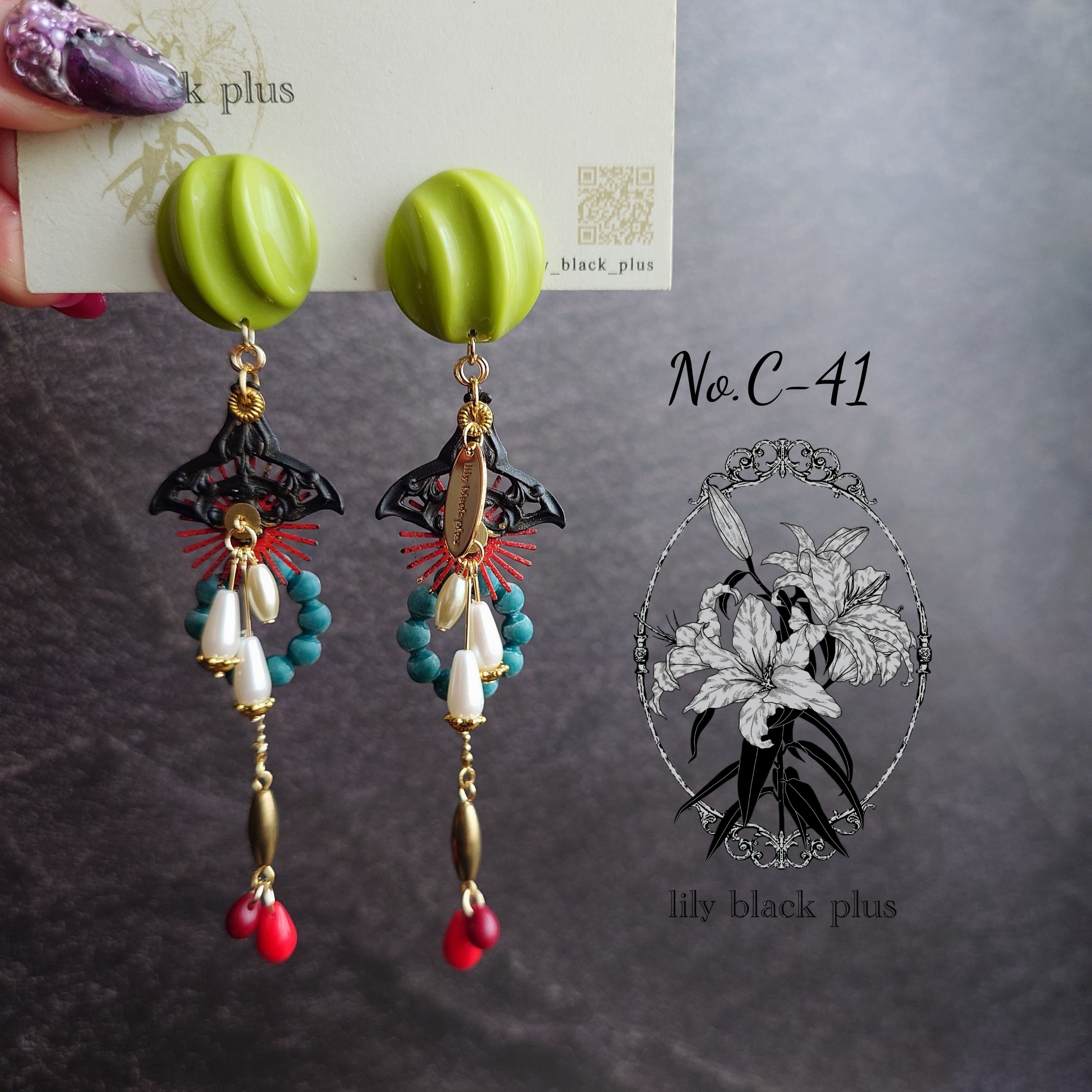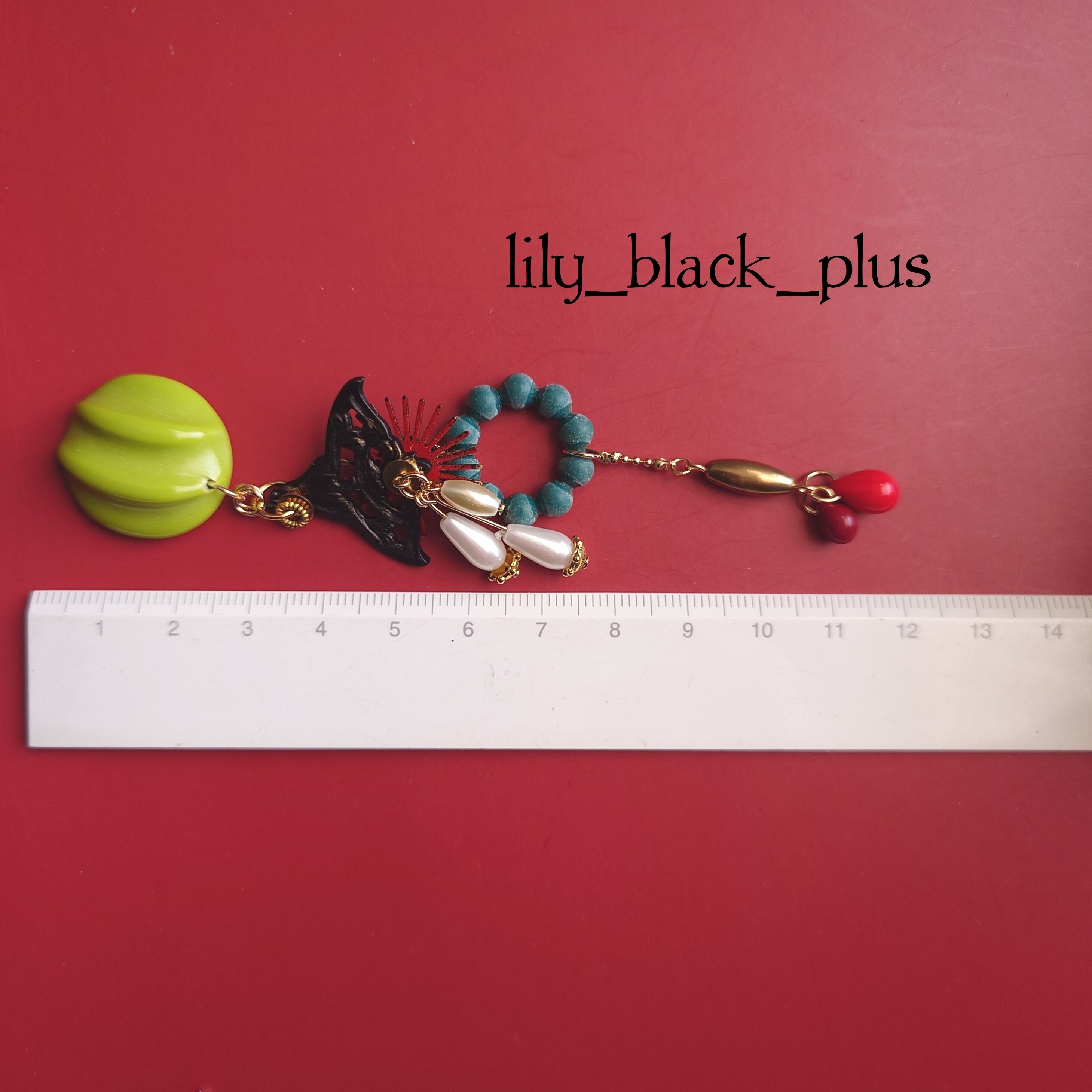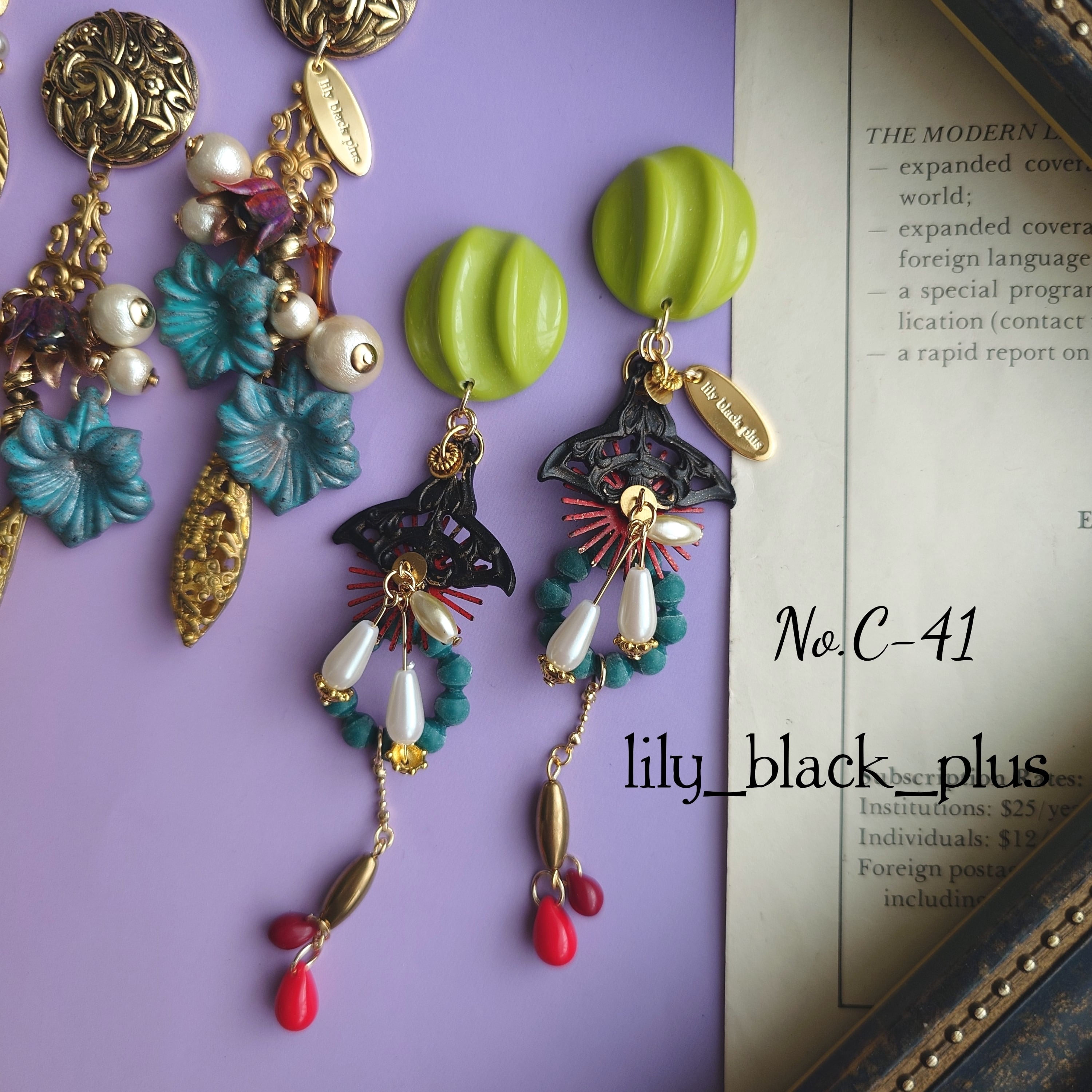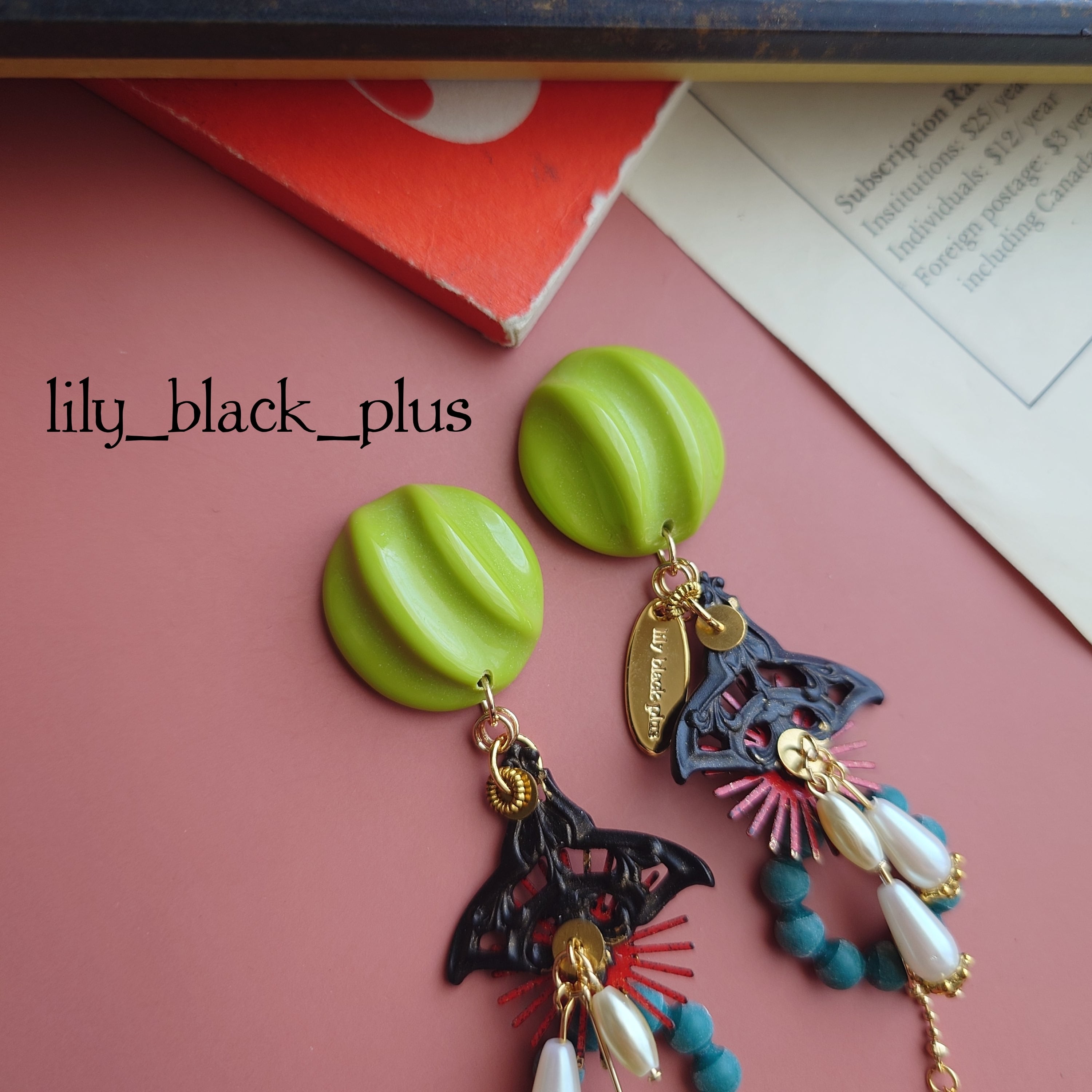 グリーンカラーのヴィンテージカボションをトップにマットブラックにペイントしたヴィンテージ真鍮チャームとオレンジにペイントした真鍮プレートを重ね、表にはパールビーズを、裏側からはヴィンテージリングが揺れるよう合わせたアクセサリーです。