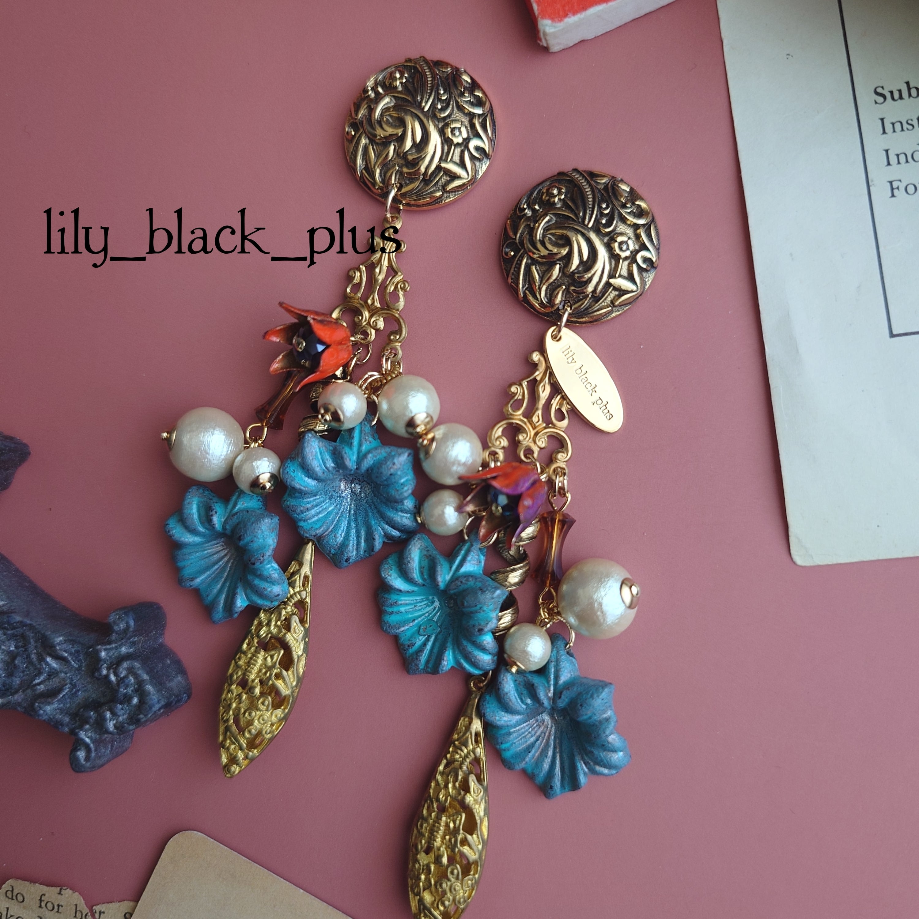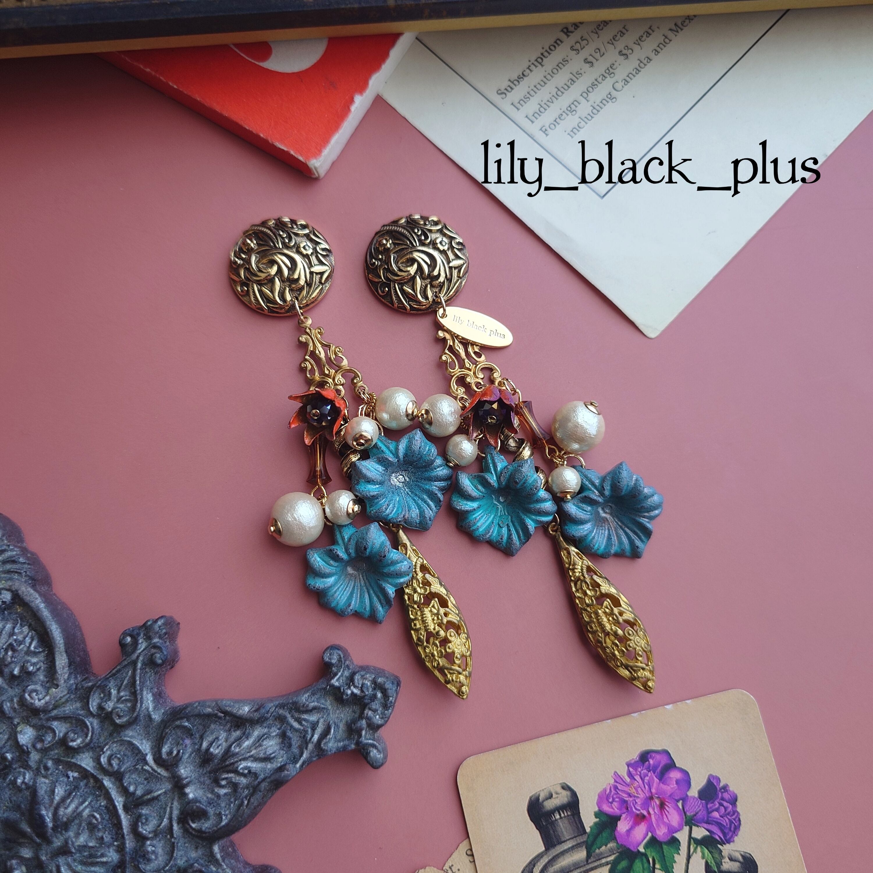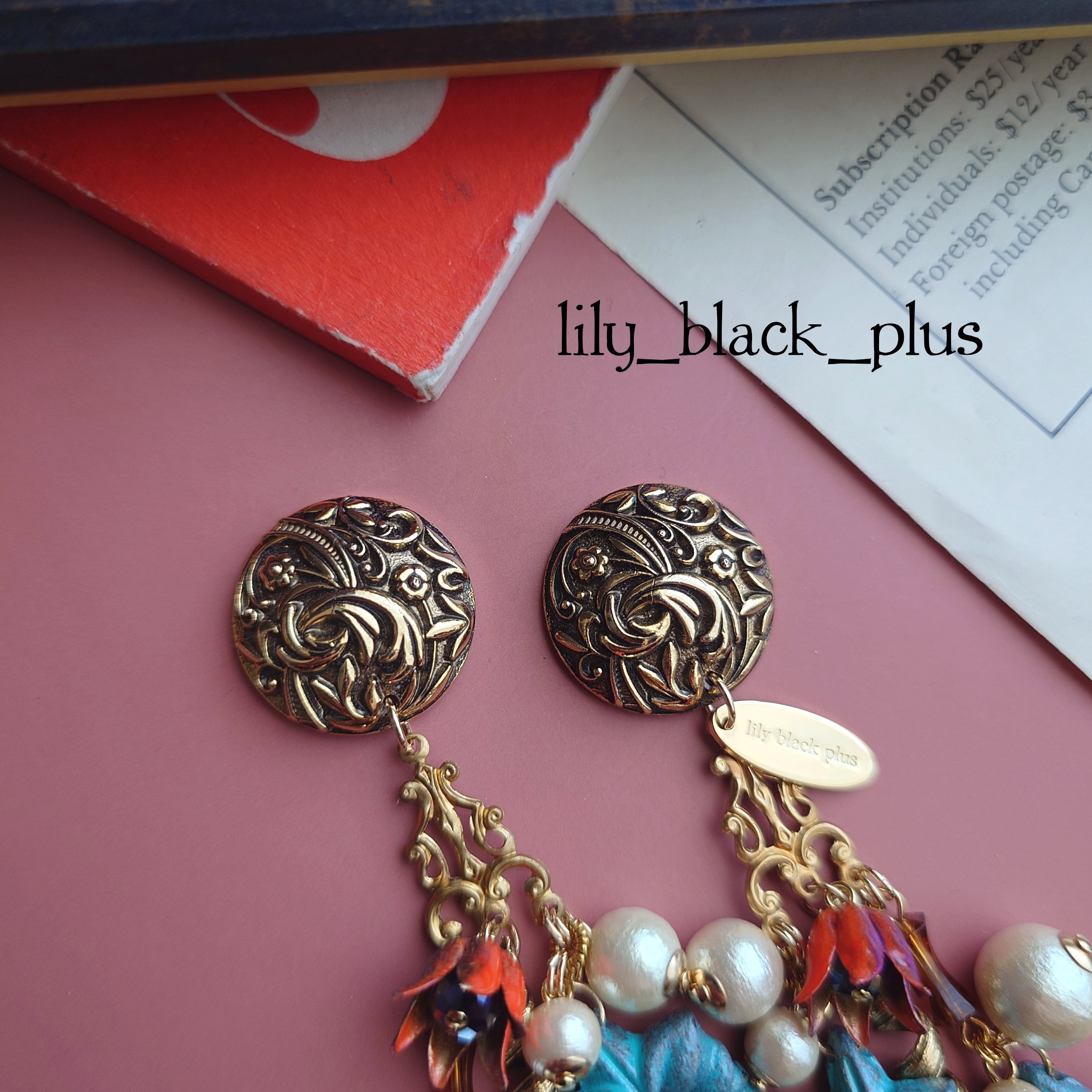ゴールドのボタンをトップに真鍮チャームとペイントした小さな真鍮フラワー、コットンパールやヴィンテージのお花チャームを組み合わせ、透かしデザインのメタルチャームを合わせたアクセサリーです。