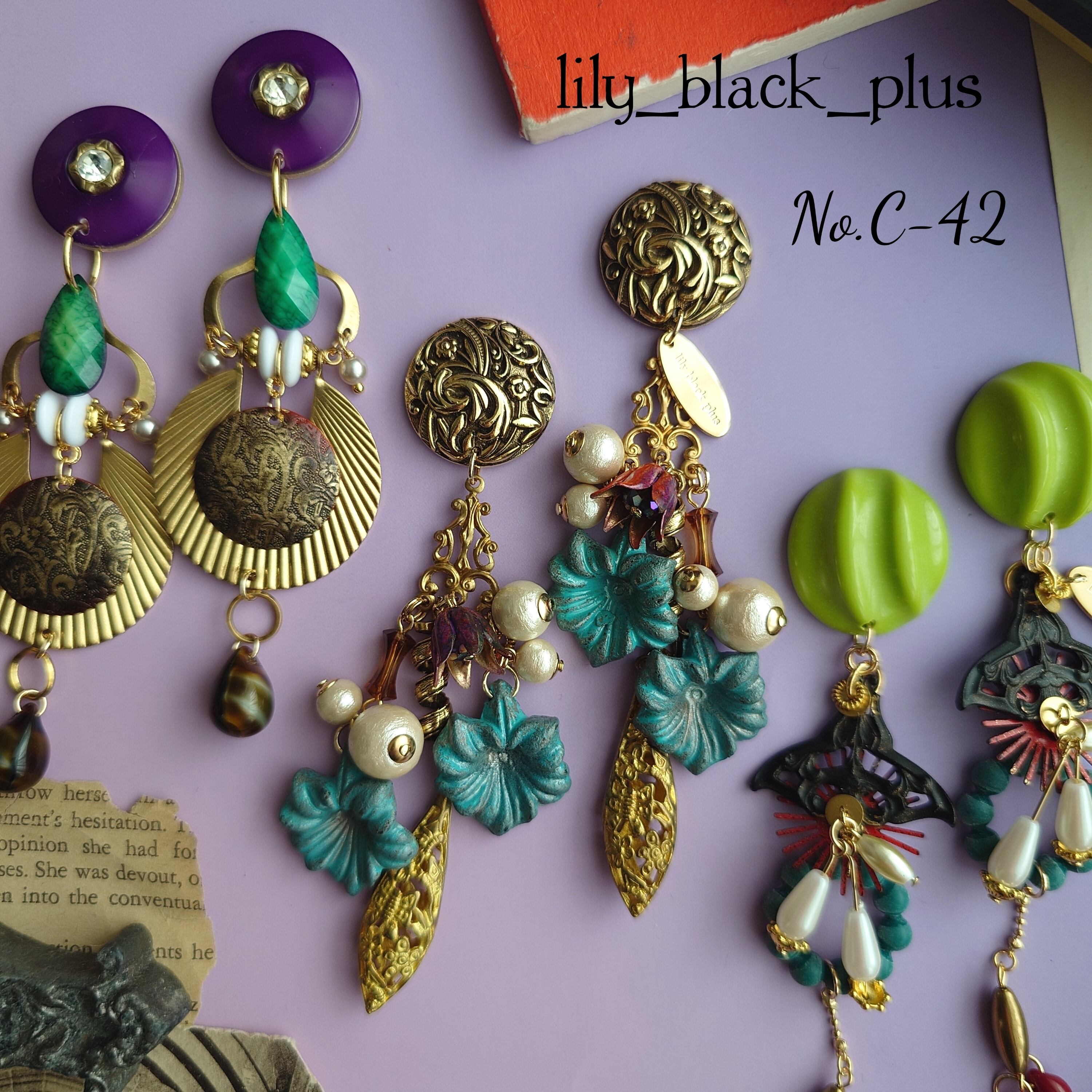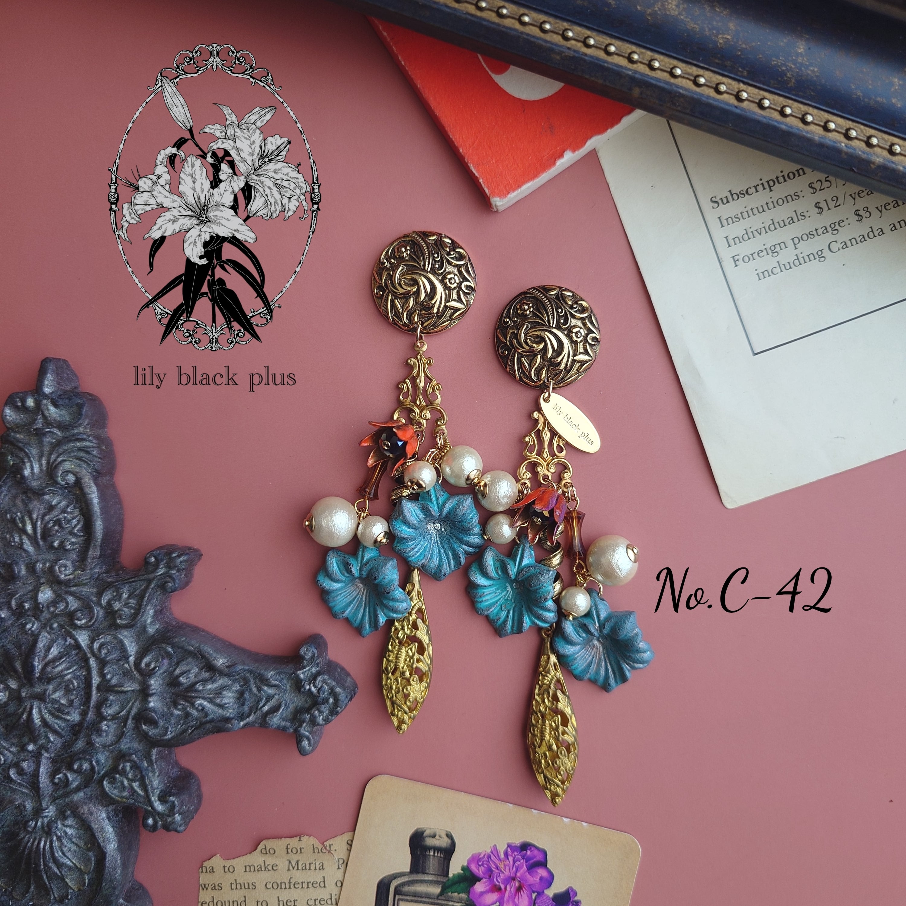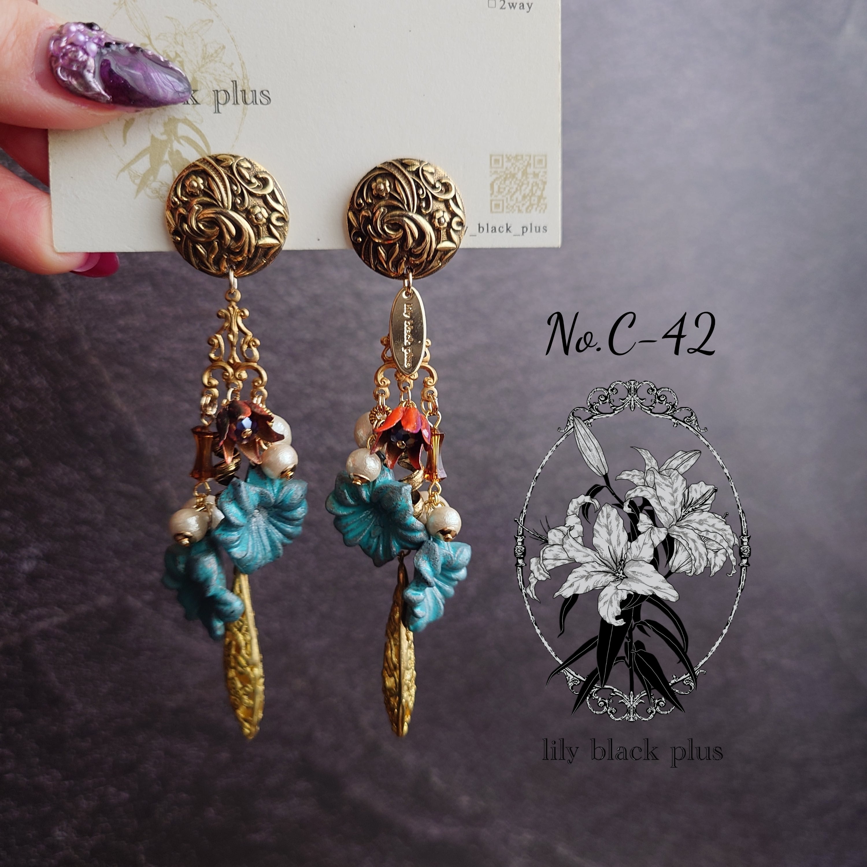 No.C-42 buttonと真鍮チャームのVintageフラワー ピアス/イヤリング