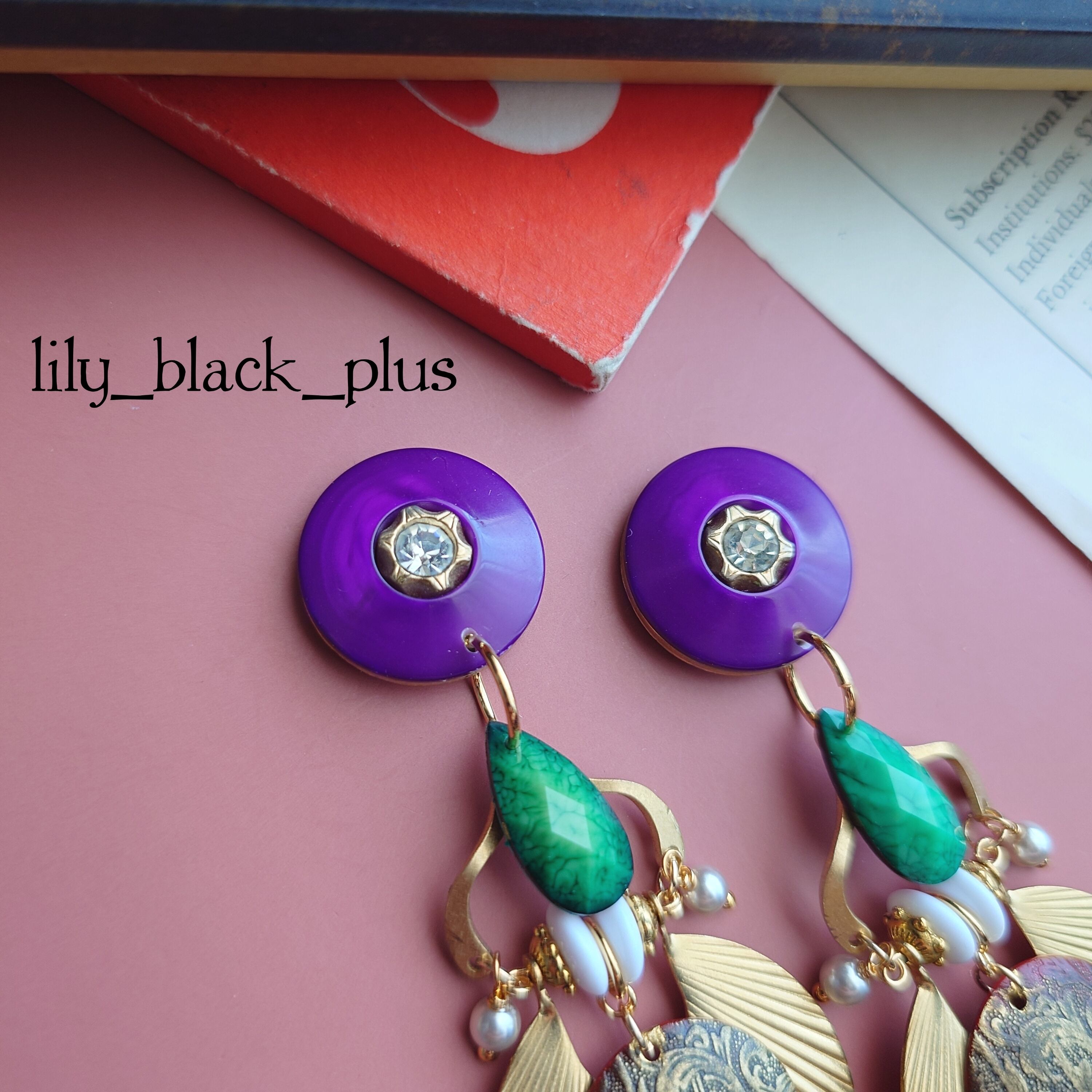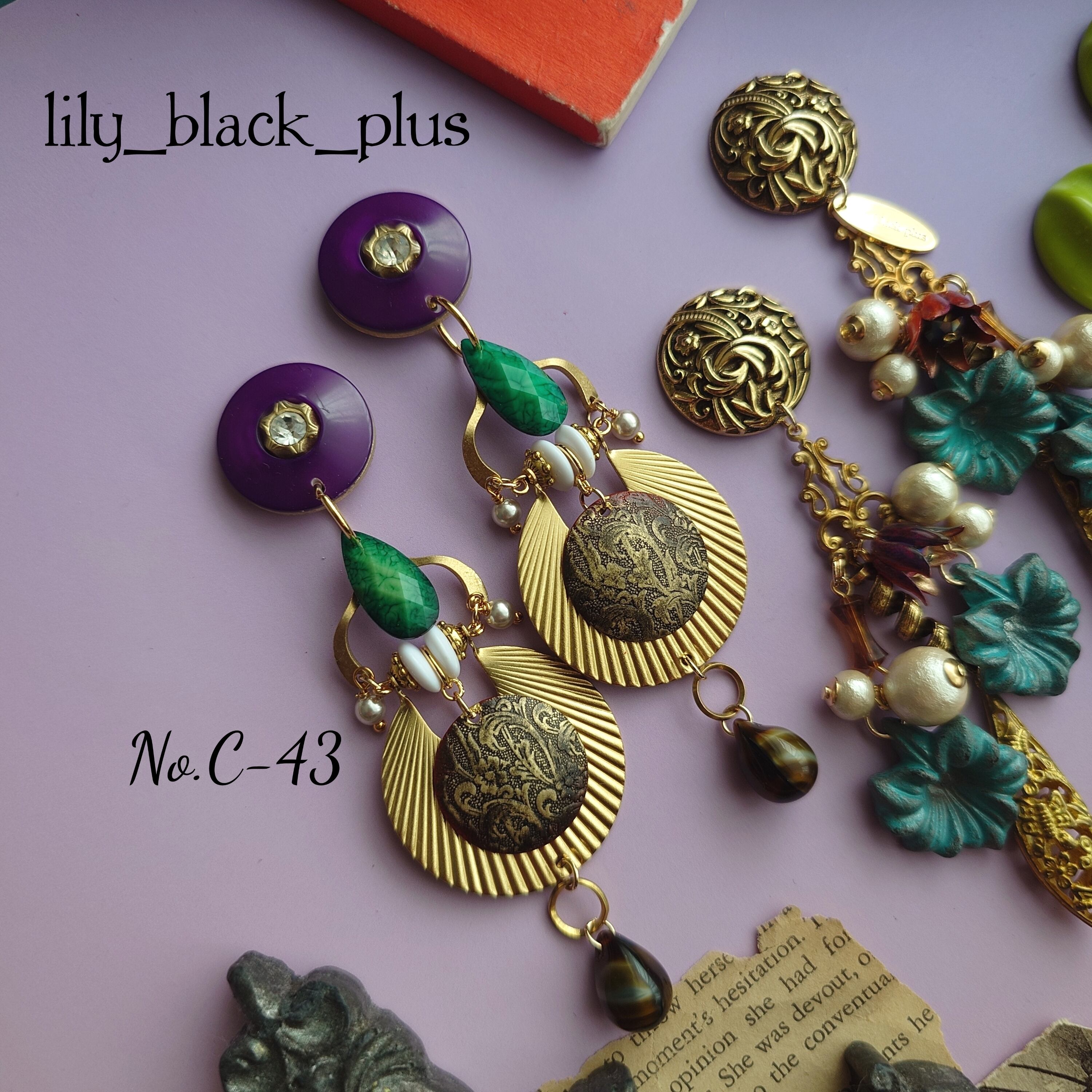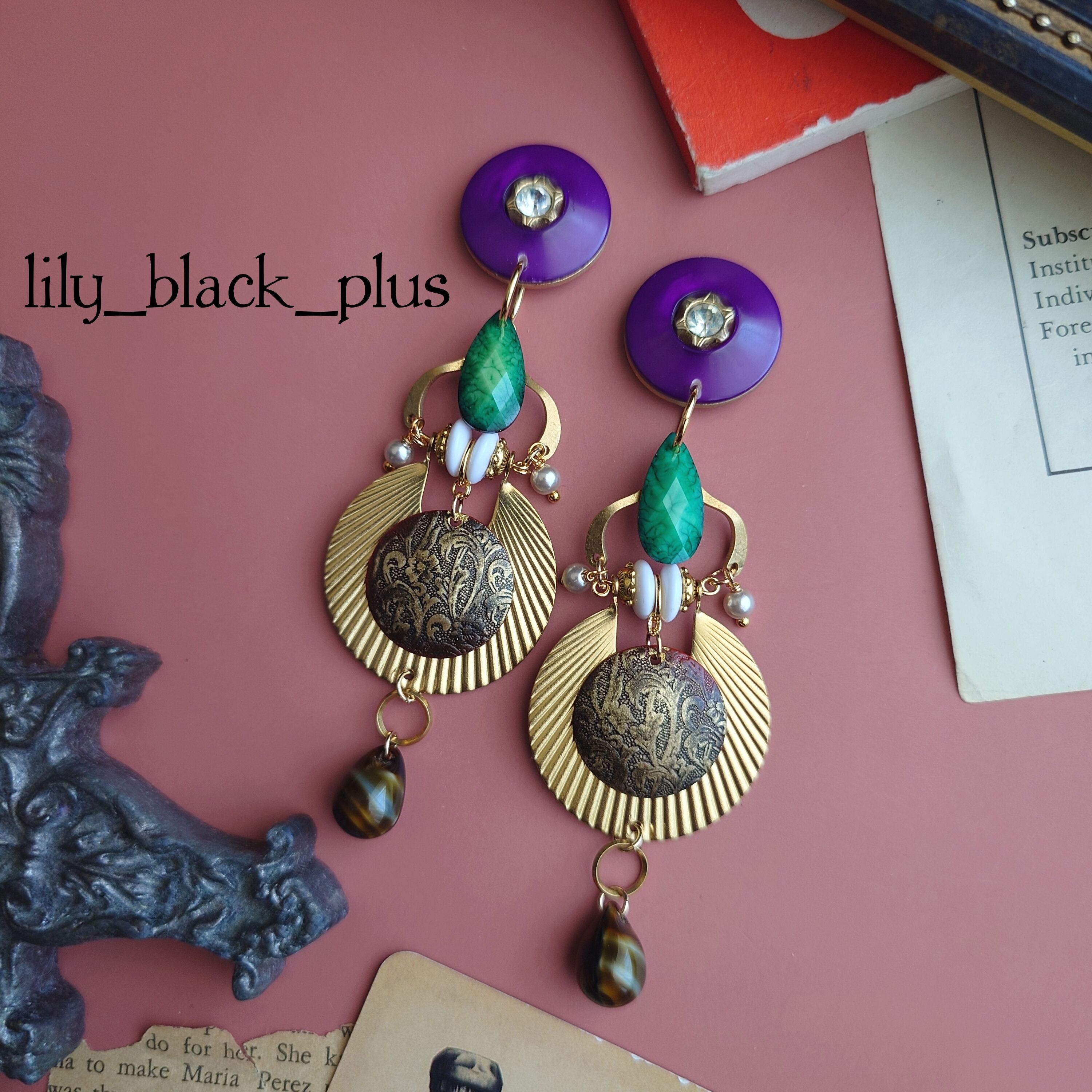パープルの小さめなボタンをトップに大きな真鍮プレートとペイントした真鍮プレート、ホワイトカラーのヴィンテージビーズを組み合わせ、真鍮チャームで繋ぎグリーンチャームとプレート下側には大きめのチェコビーズを合わせたアクセサリーです。