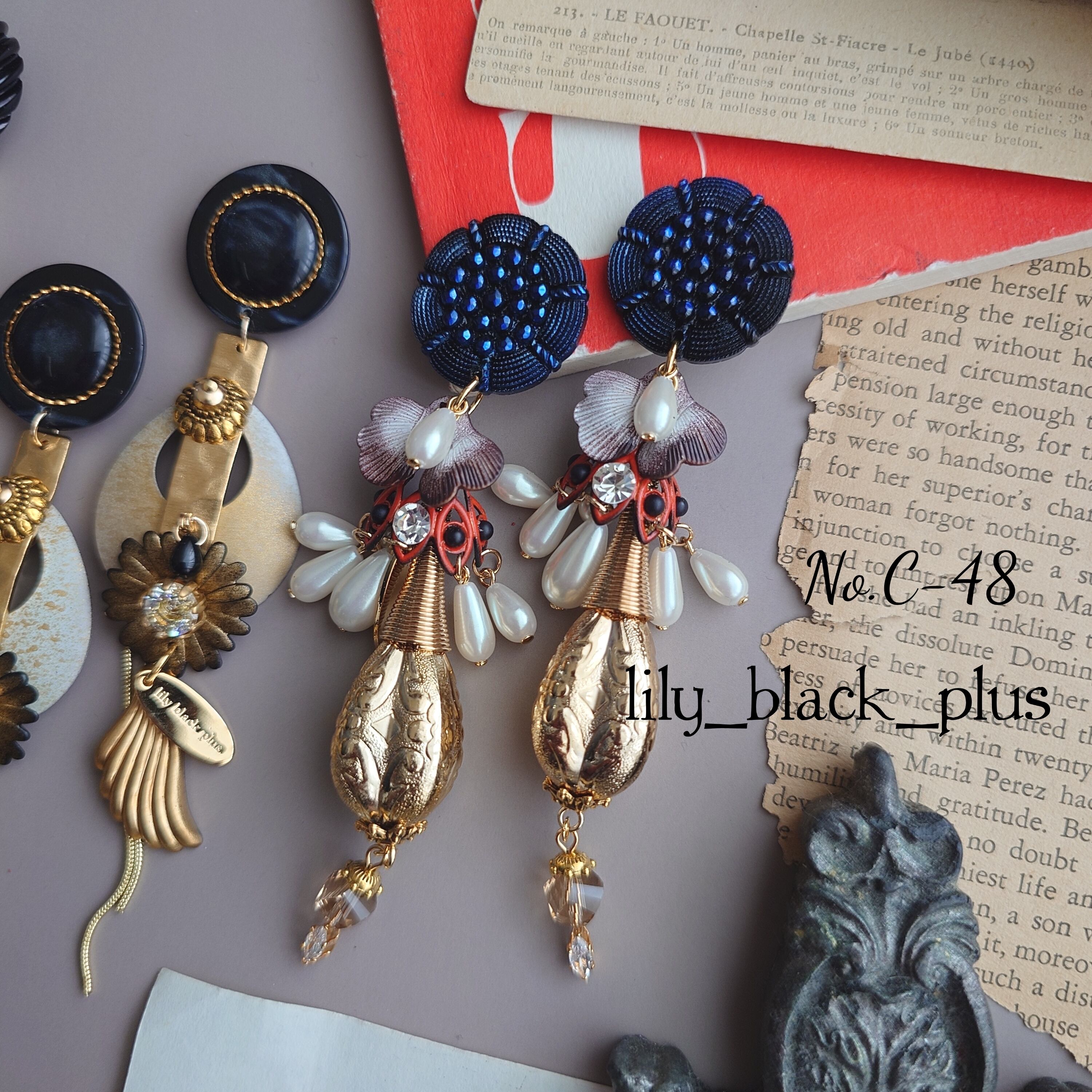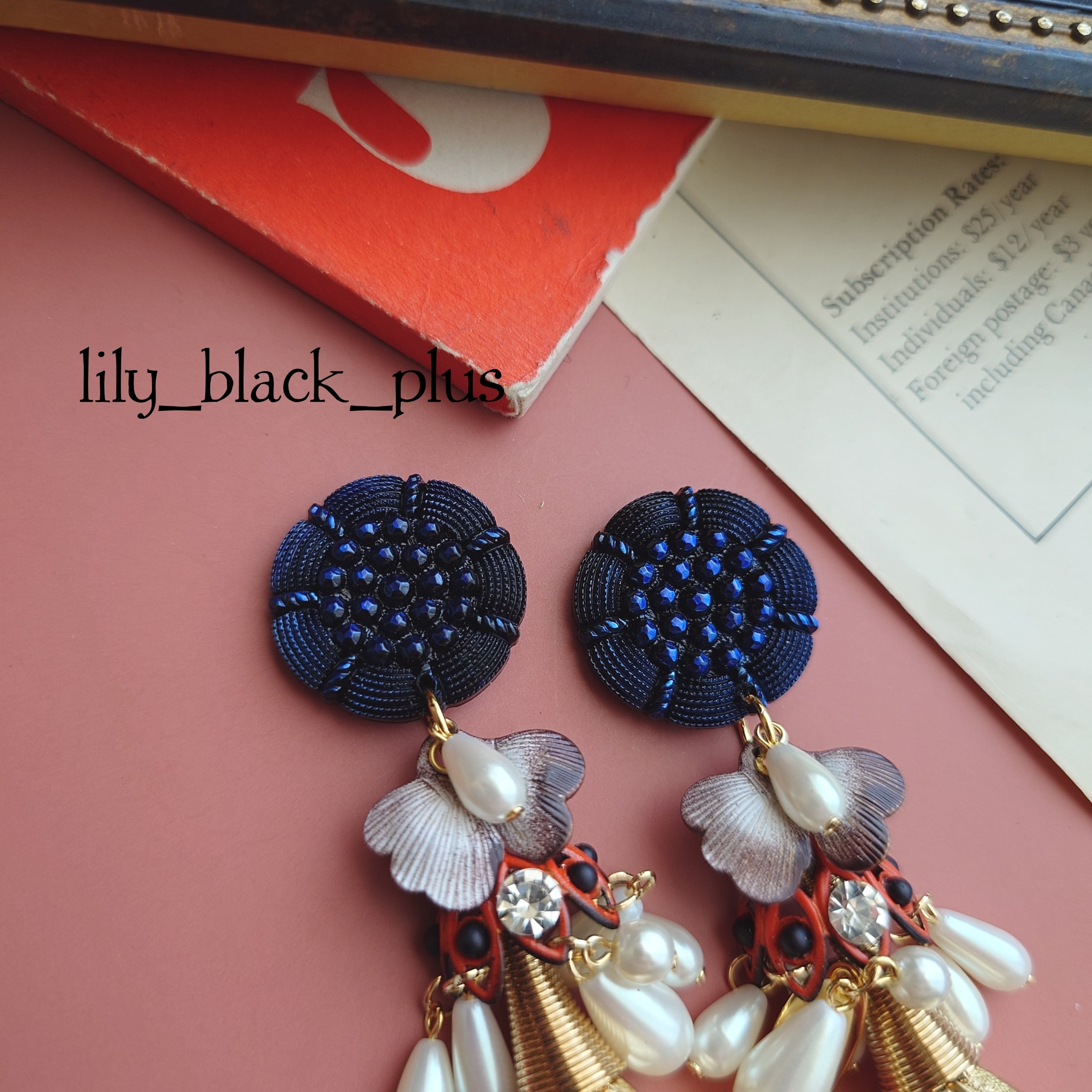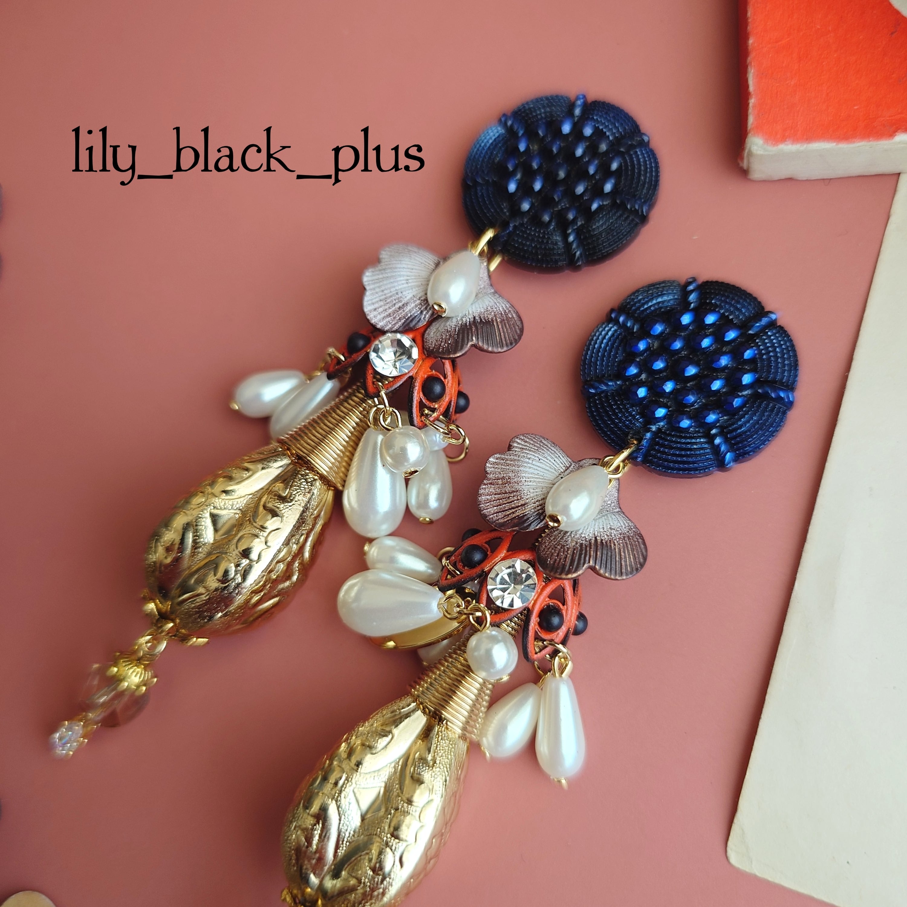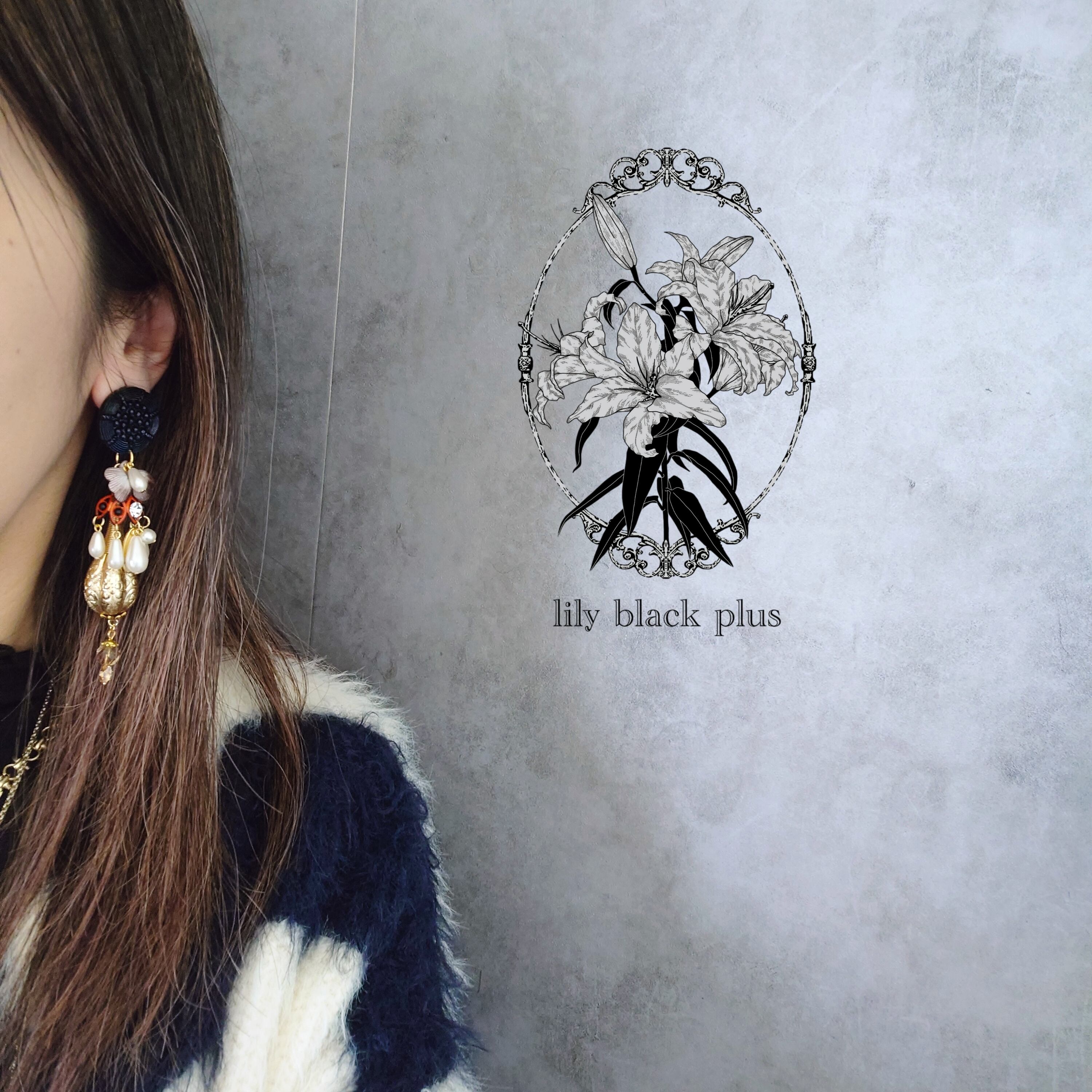 ネイビーのボタンをトップにホワイトブラウンにペイントした真鍮チャームとゴールドビーズに合わせて曲げたオレンジにペイントした真鍮チャームを組み合わせガラスビーズを合わせたアクセサリーです。
