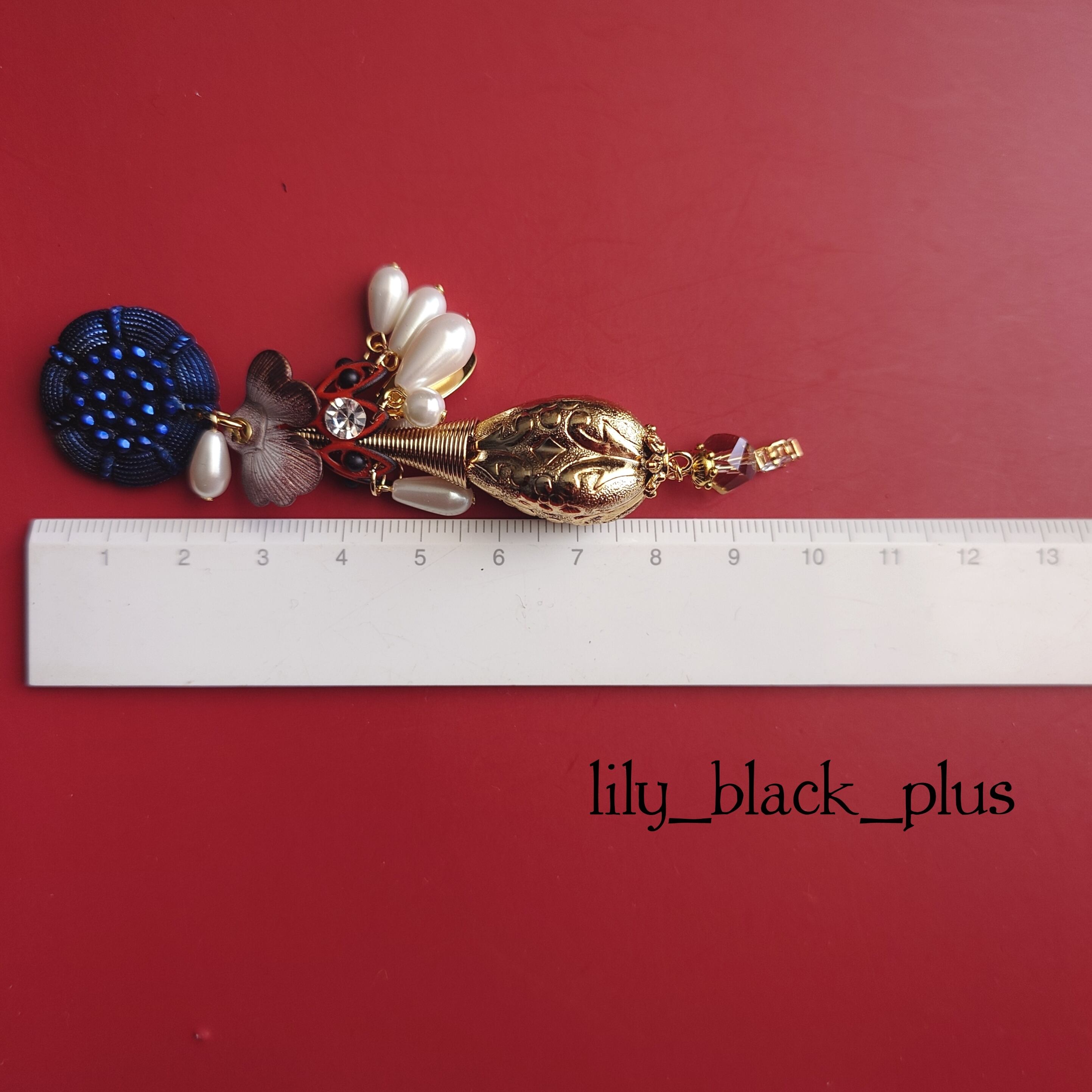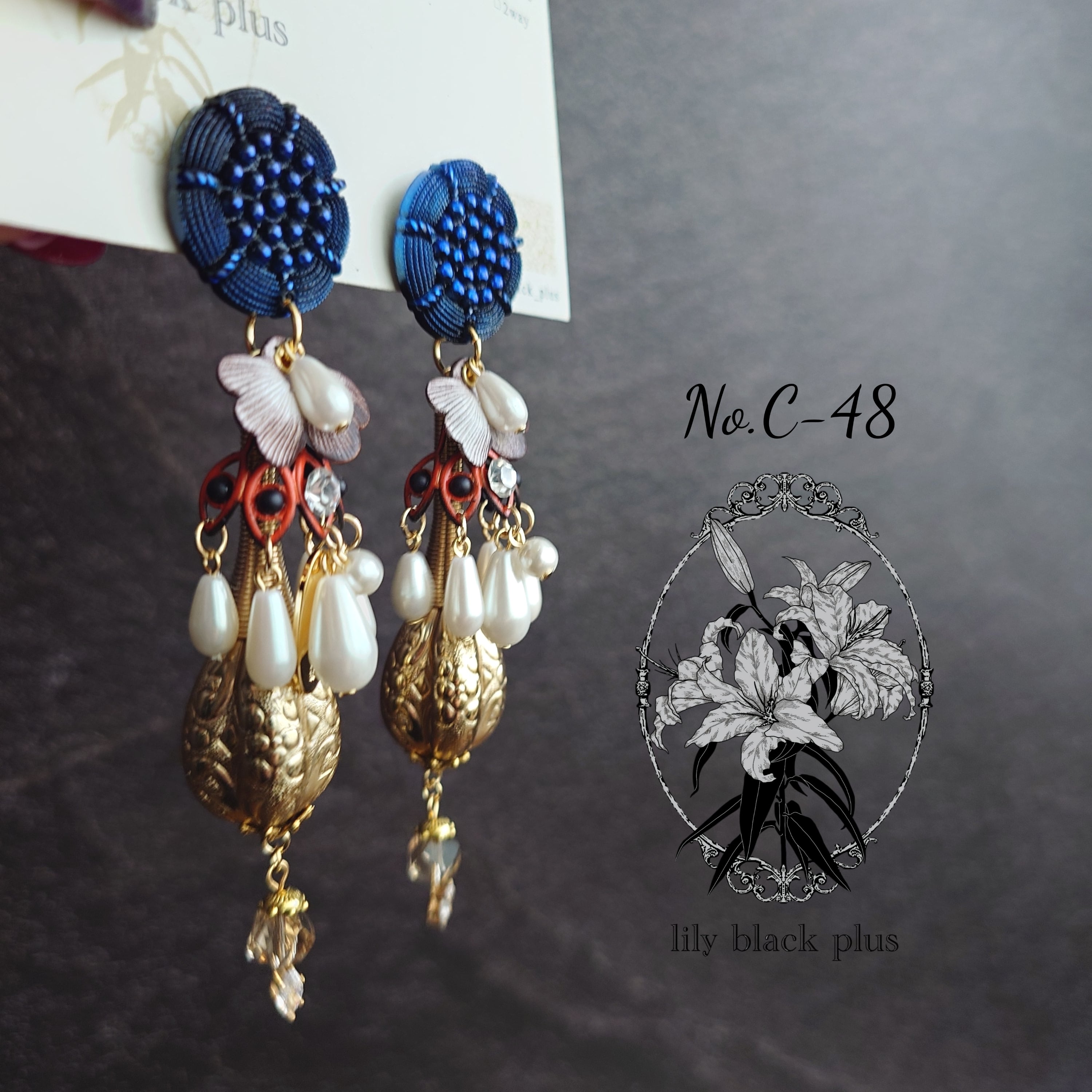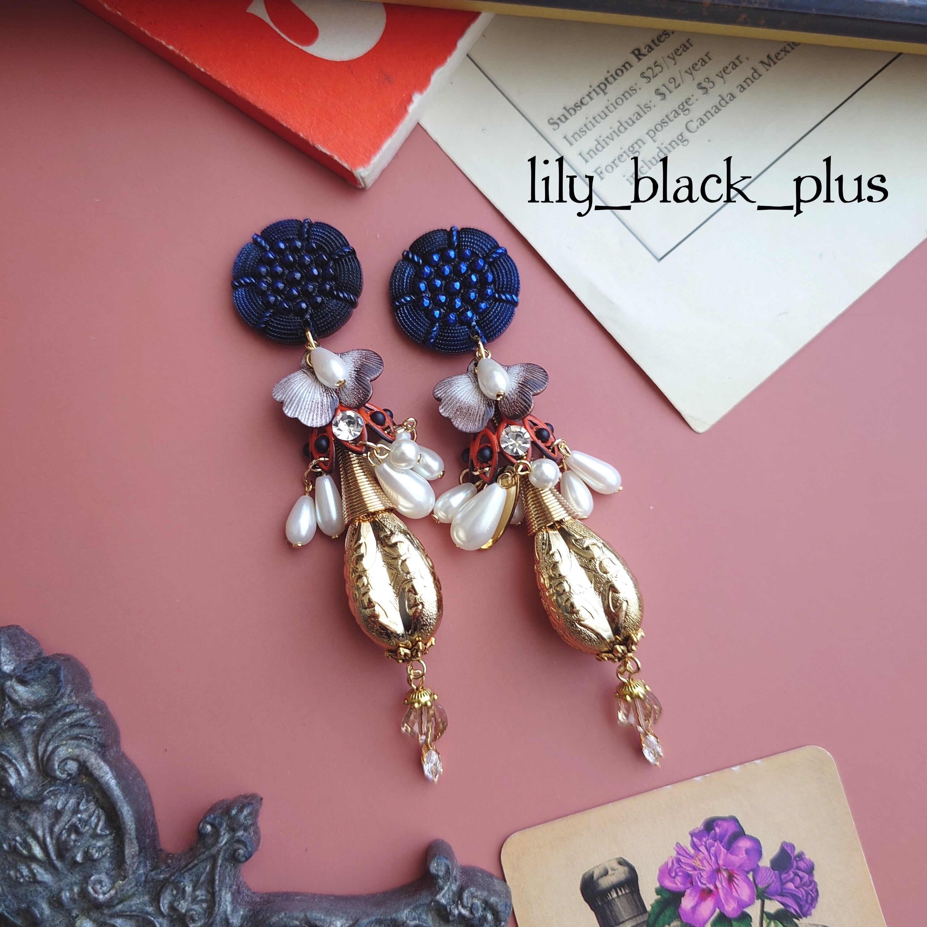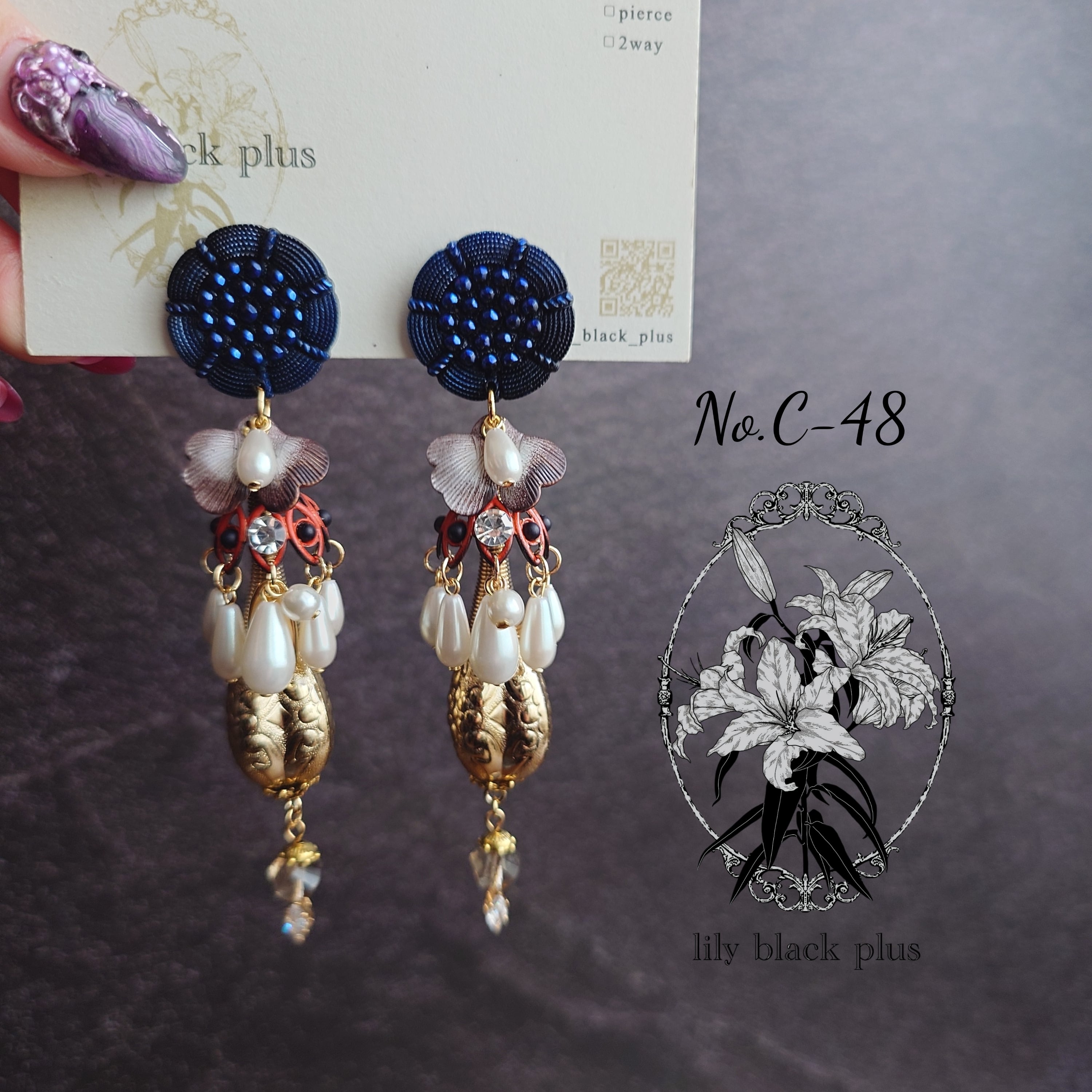 ネイビーのボタンをトップにホワイトブラウンにペイントした真鍮チャームとゴールドビーズに合わせて曲げたオレンジにペイントした真鍮チャームを組み合わせガラスビーズを合わせたアクセサリーです。