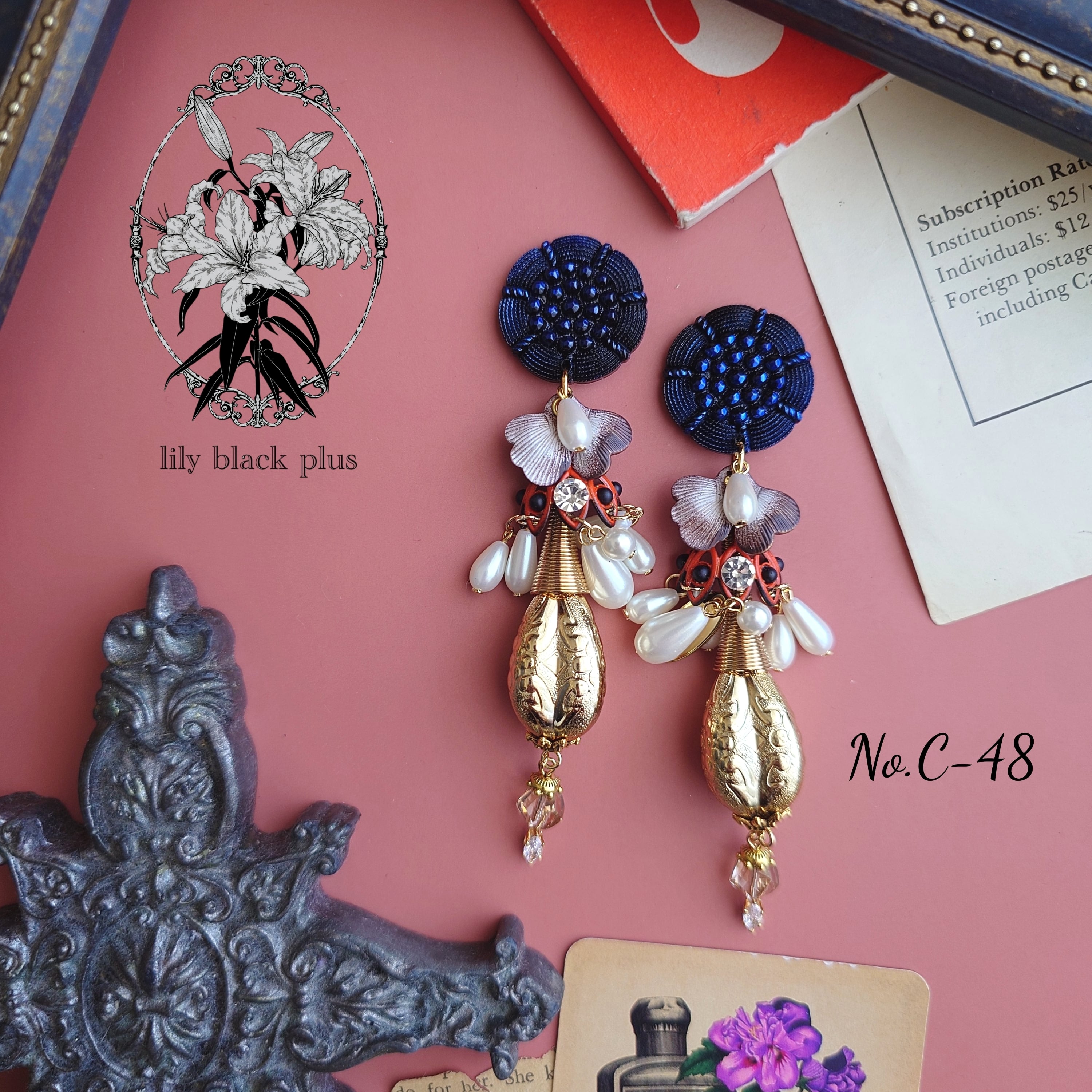 No.C-48 buttonと真鍮チャームとゴールドビーズ ピアス/イヤリング